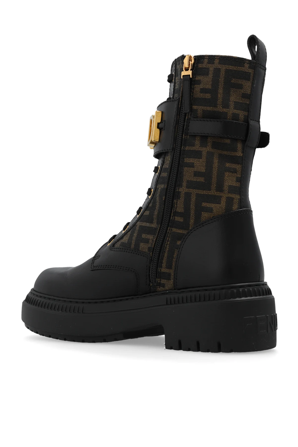 Czarno-brązowe, sznurowane botki za kostkę, model ‘Fendigraphy’ Fendi. Wykonane z płótna ozdobionego monogramem. Wykończone skórą. Dodatkowo z boku zapinane na zamek i regulowany pasek z aplikacją w kształcie logo. Metalowe elementy w kolorze złotym. Czarna, gumowa podeszwa.