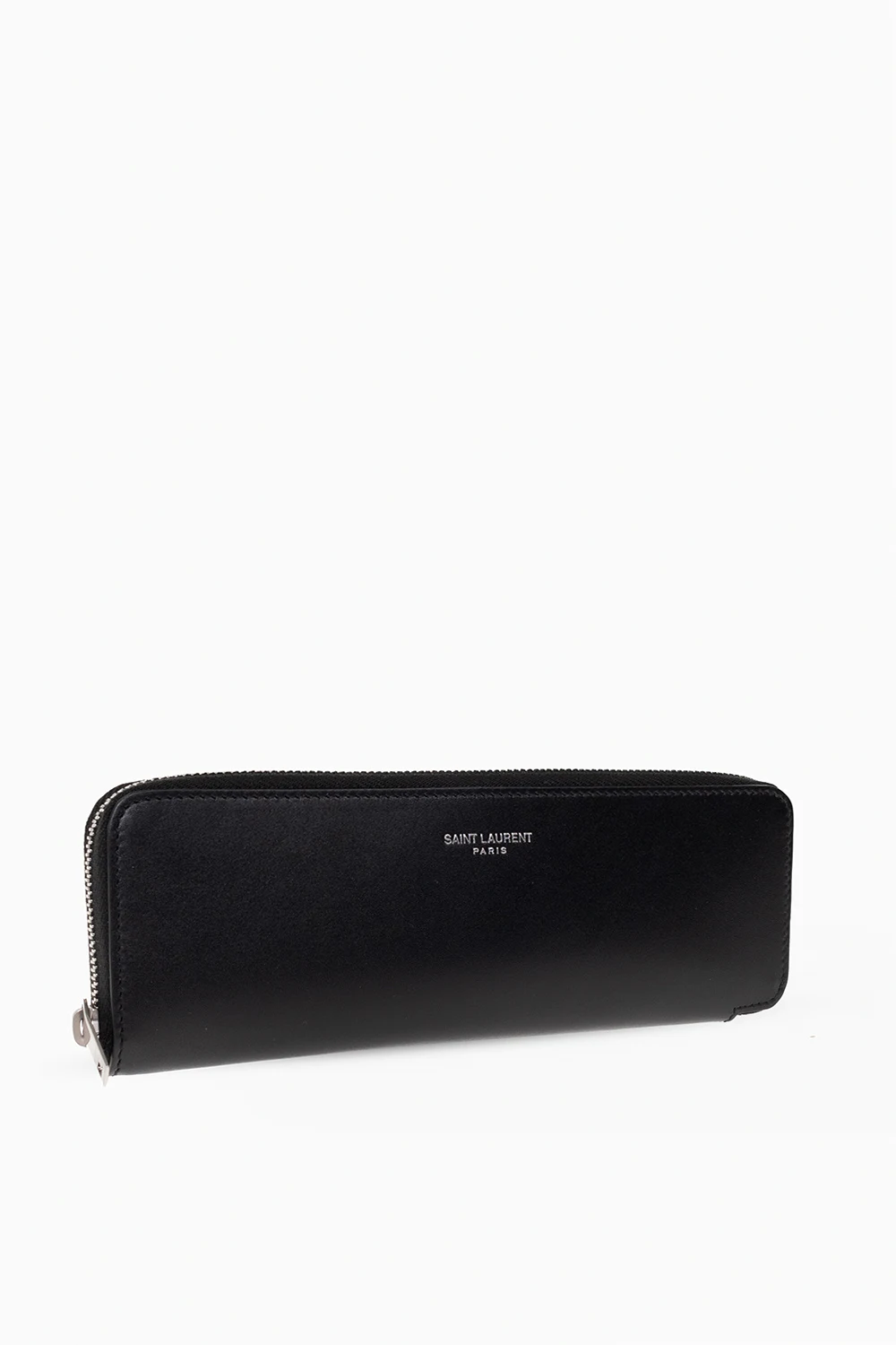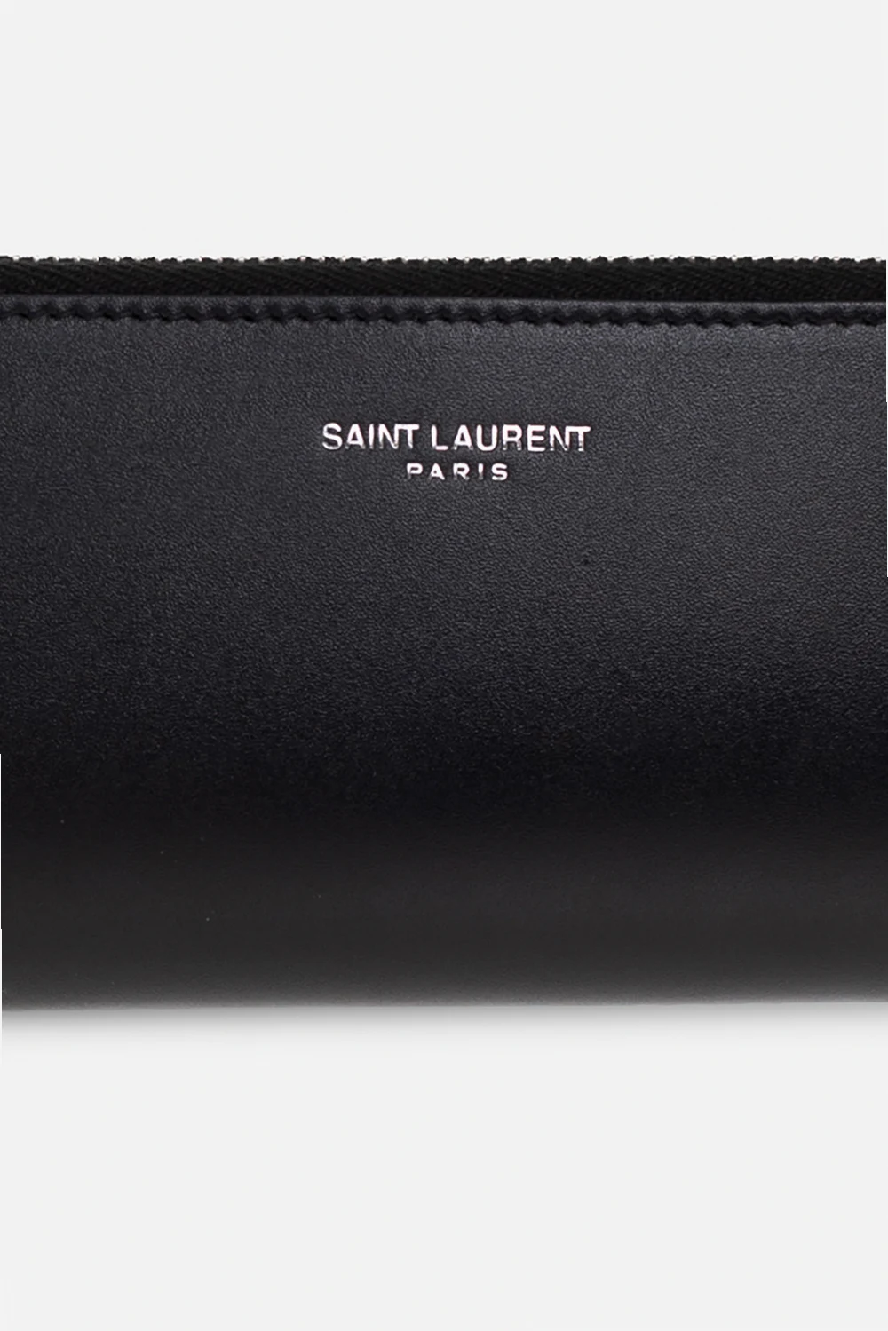 Czarny piórnik Saint Laurent. Wykonany ze skóry cielęcej. Zamykany na zamek. Ozdobiony nadrukowanym logo w kolorze srebrnym.