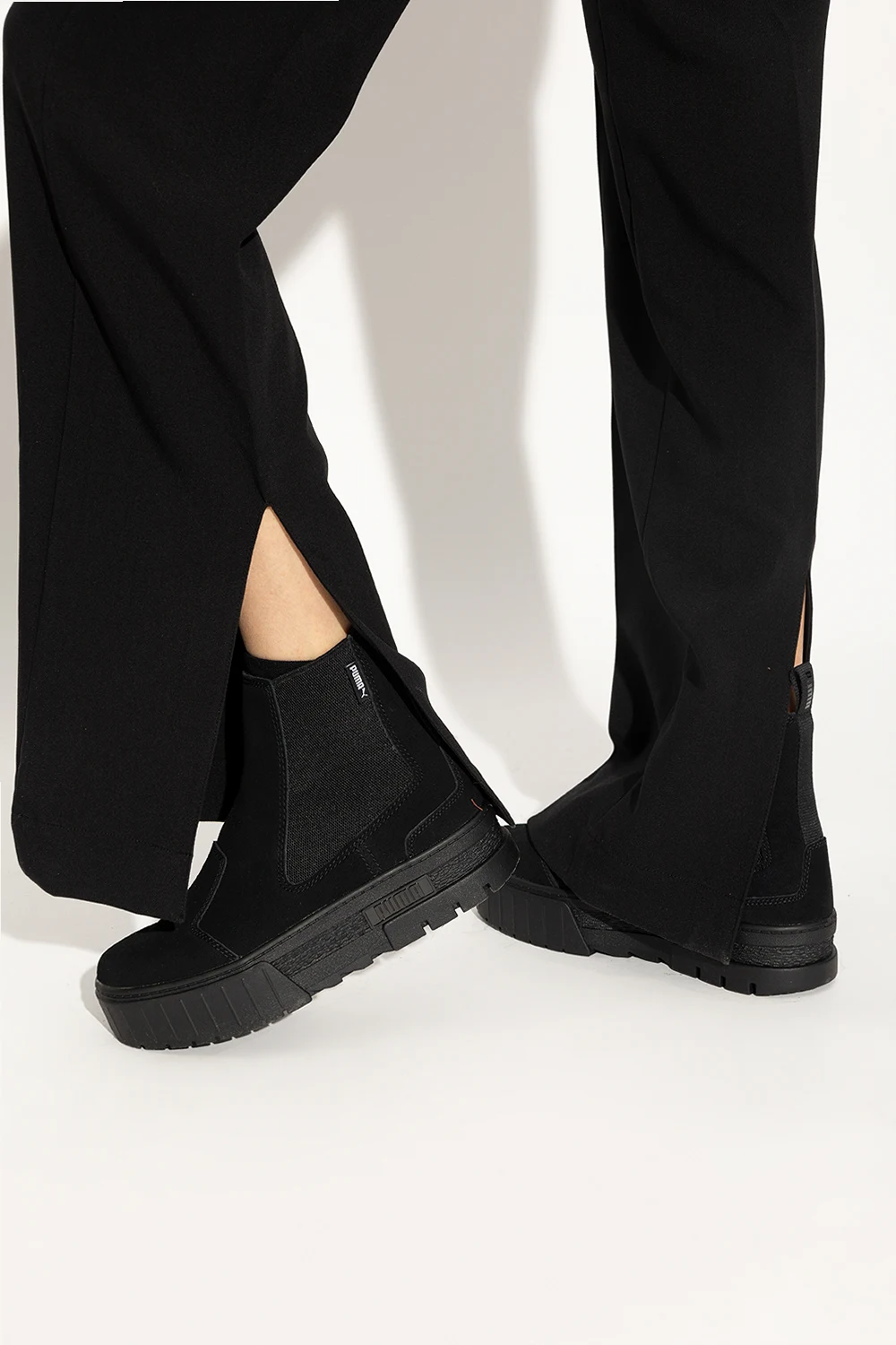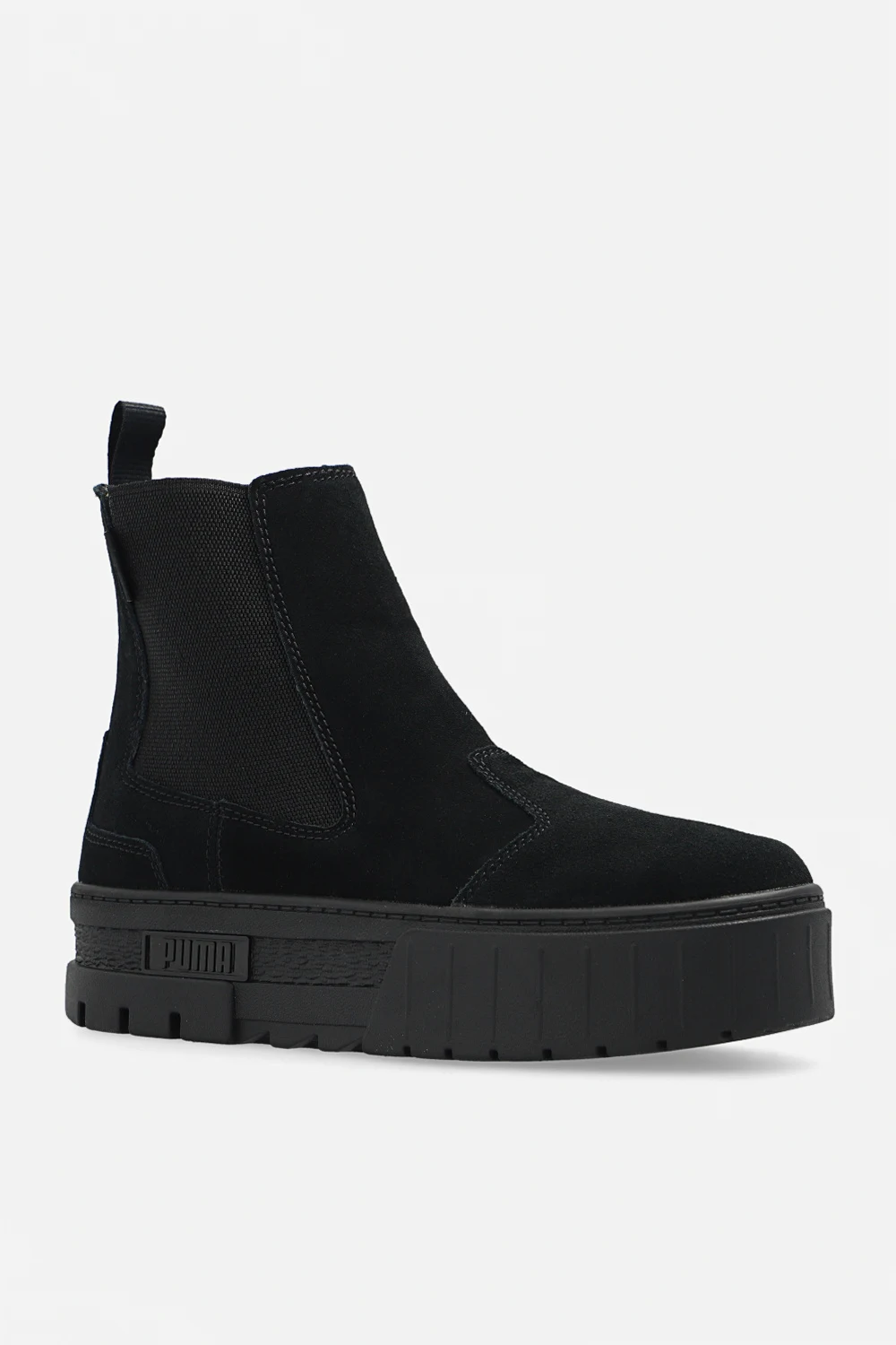 Czarne sztyblety na platformie, model ‘Mayze’ Puma. Wykonane z zamszu. Po bokach wszyta guma. Z boku ozdobione naszywką z logo. Czarna, gumowa podeszwa.