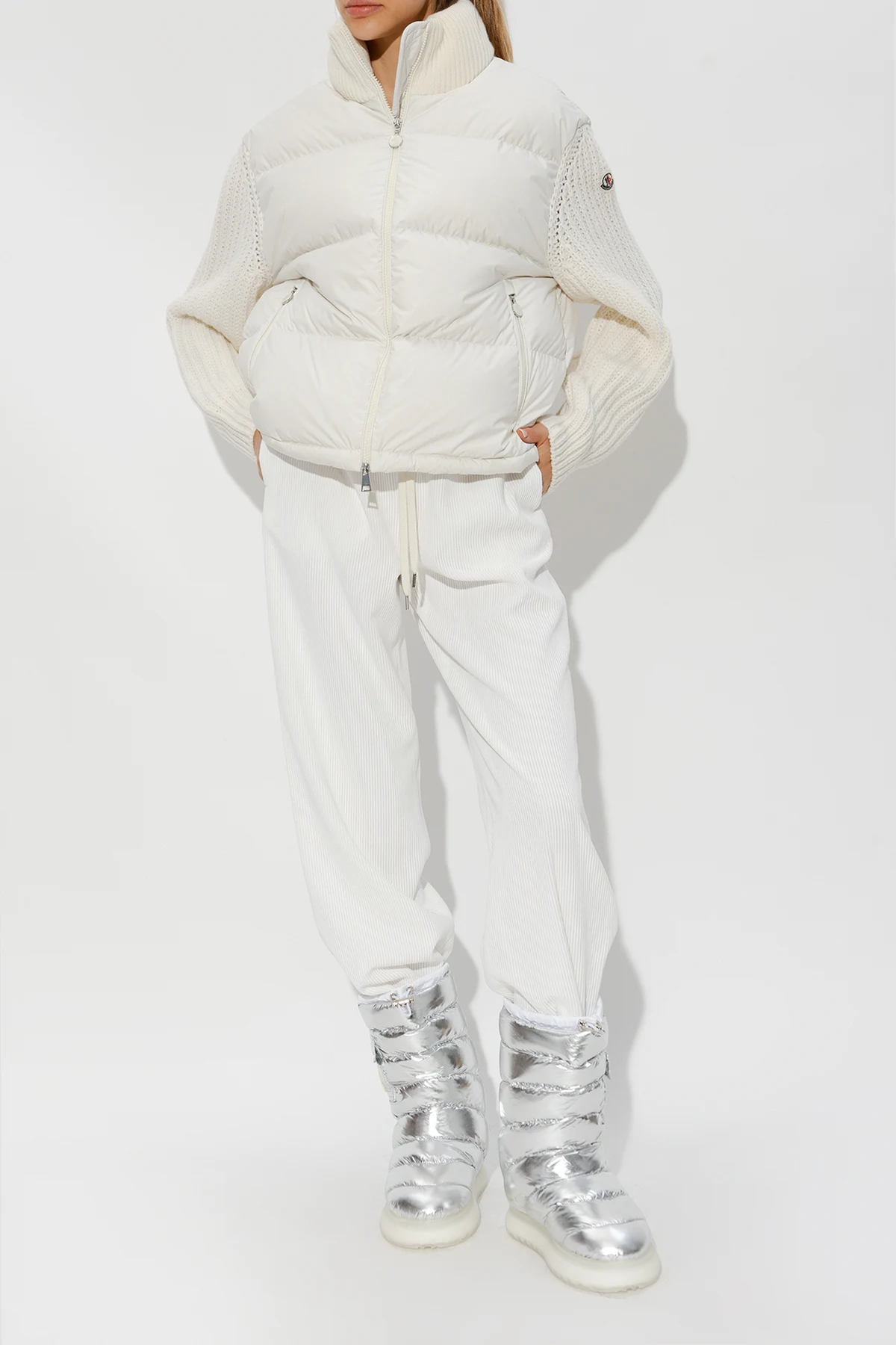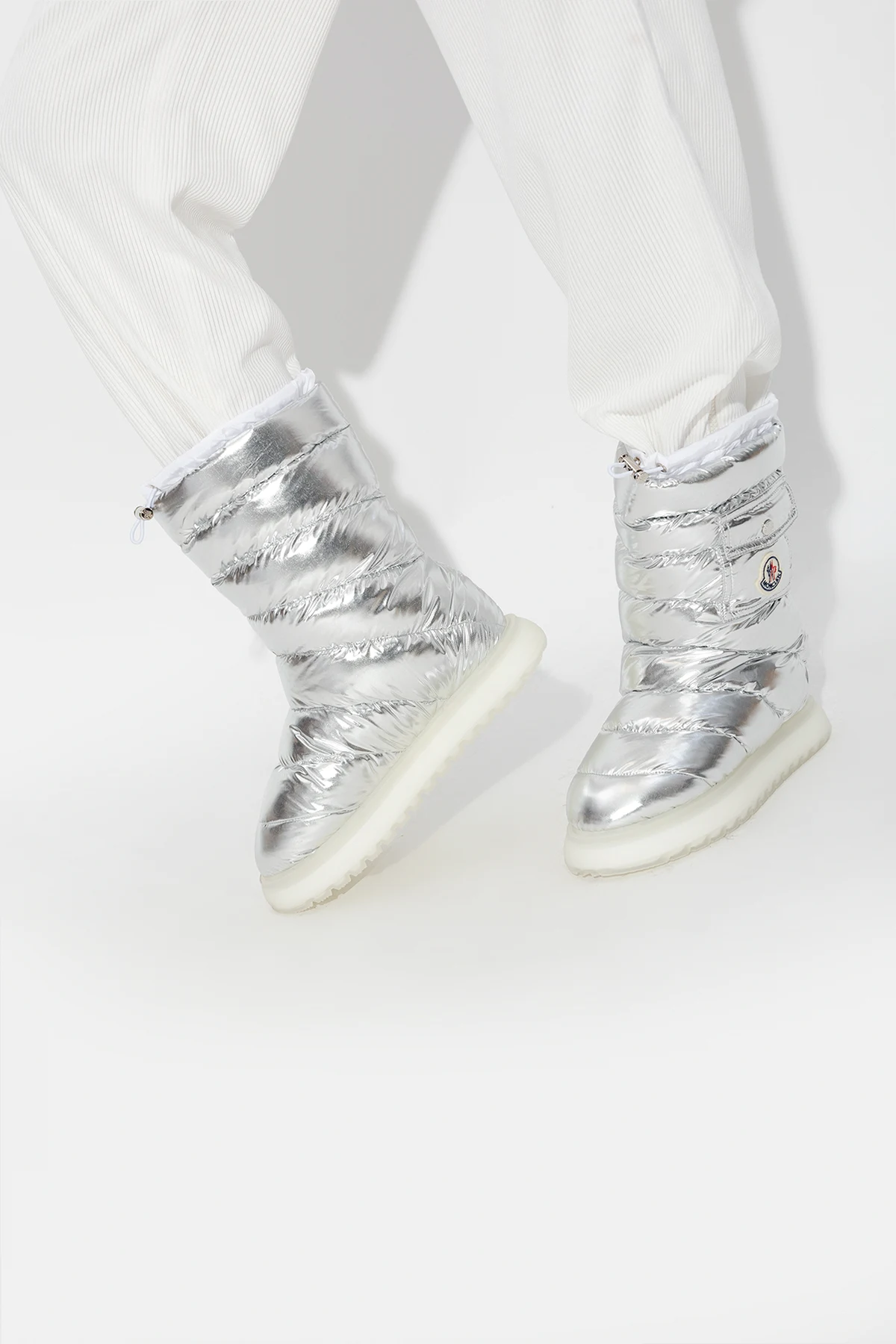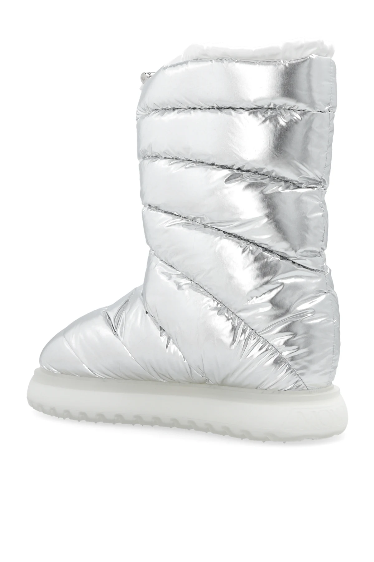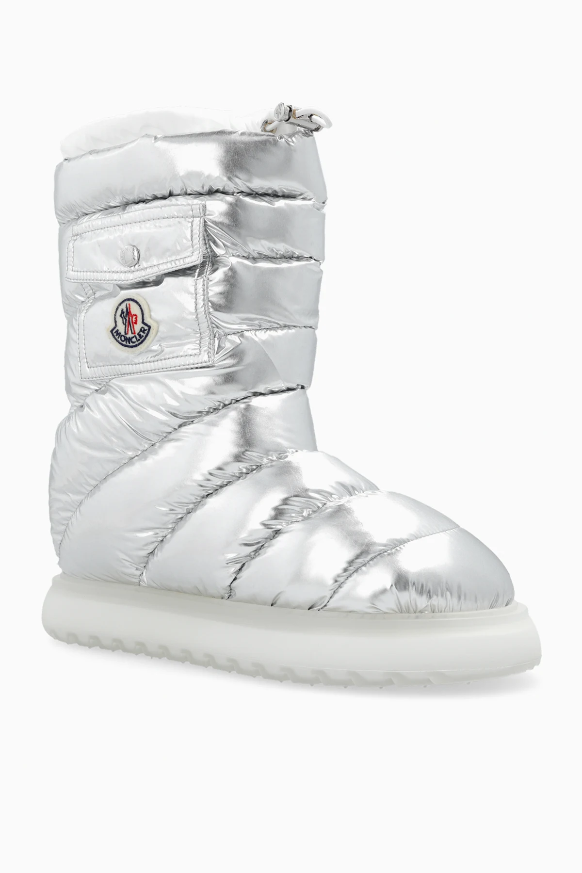 Pikowane śniegowce w kolorze srebrno-białym, model ‘Gaia’ Moncler. Wykonane z wodoodpornego materiału. Na górze ściągane trokami. Z boku kieszeń z patką zapinaną na zatrzask, ozdobiona naszywką z logo. Biała, gumowa podeszwa.