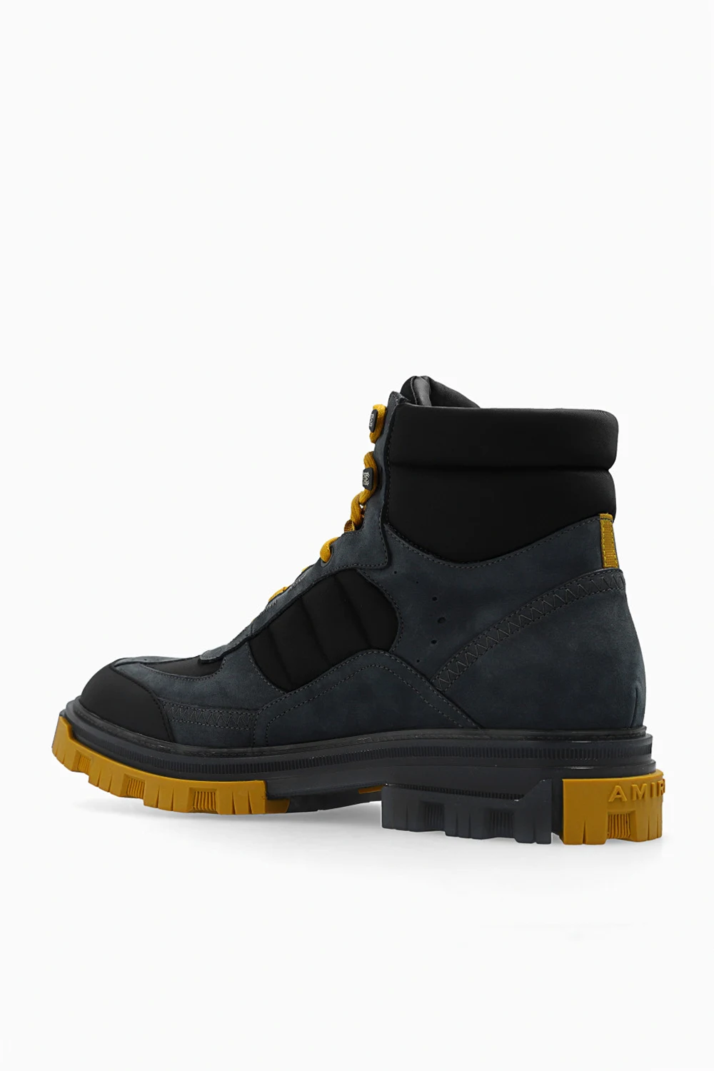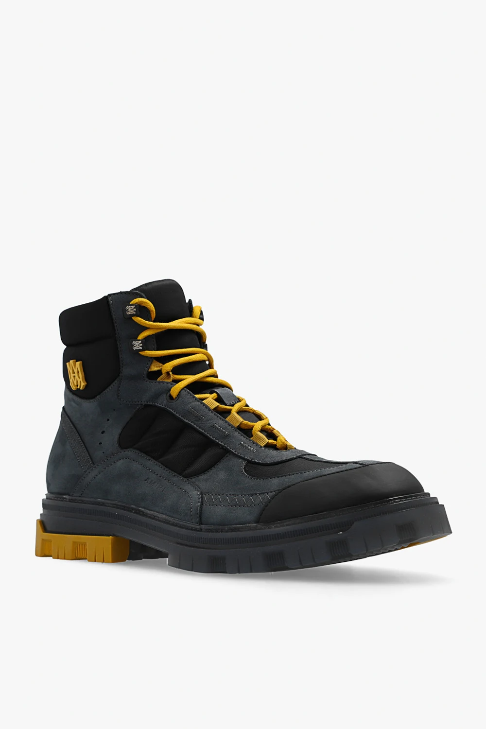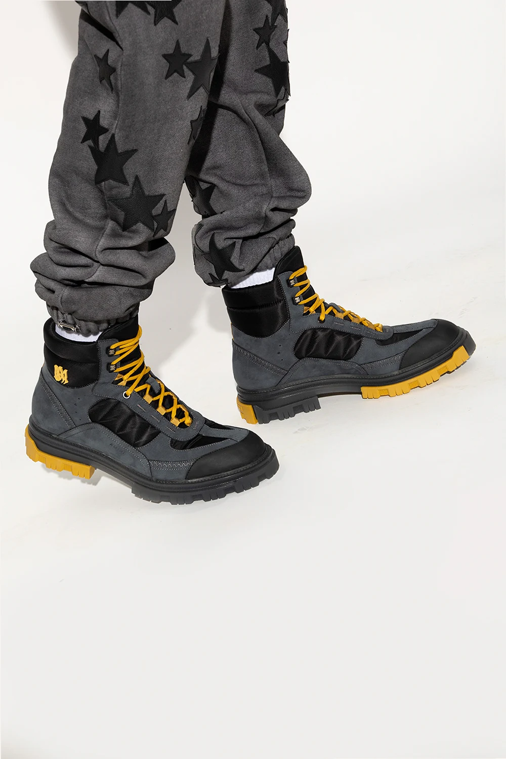 Czarno-szaro-żółte, sznurowane buty za kostkę, model ‘Workman’ Amiri. Wykonane ze skóry i materiału. Ozdobione wytłoczonym logo oraz aplikacją z monogramem. Czarno-żółta, gumowa podeszwa.