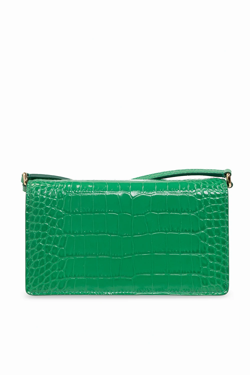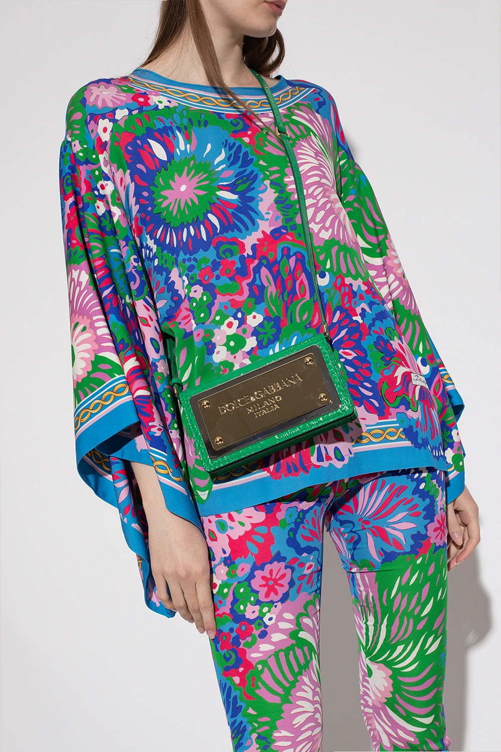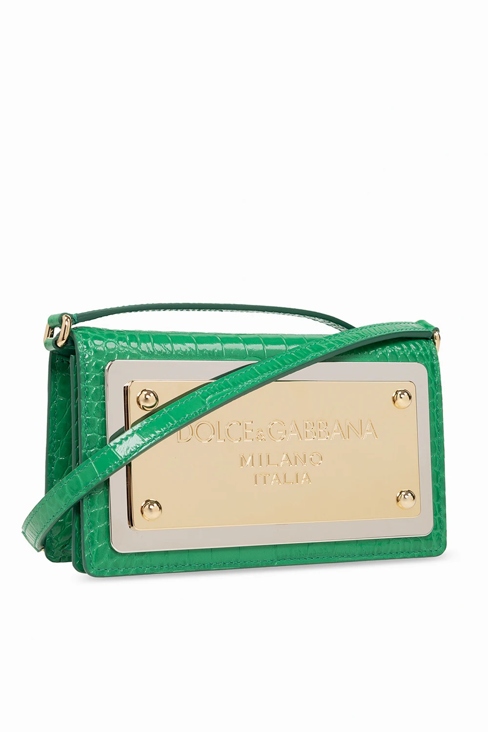 Zielona etui na telefon Dolce & Gabbana. Wykonane ze skóry cielęcej o specjalnej fakturze, imitującej skórą krokodyla. Zamykane na magnetyczne zatrzaski. Z przodu aplikacja z wygrawerowanym logo w kolorze złoto-srebrnym. Odpinany pas na ramię z możliwością regulacji długości. Wewnątrz komora z dwiema wsuwanymi kieszeniami. Dołączone etui z trzema miejscami na karty. Metalowe wykończenie w kolorze złotym.