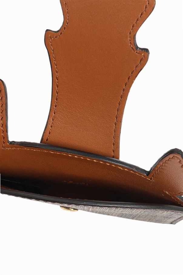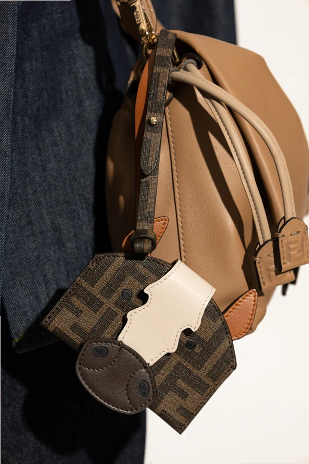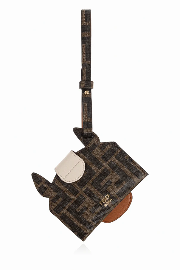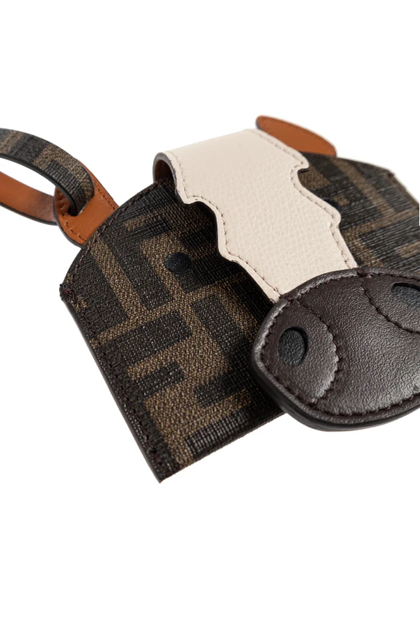 Zawieszka do torby marki Fendi to wyrafinowany akcent, który wyróżnia się unikalnym, geometrycznym kształtem stylizowanym na głowę zwierzęcia. Wyraźnie zaznaczone uszy oraz kontrastujące wstawki w odcieniu kremowym i ciemnobrązowym harmonijnie współgrają z klasycznym wzorem monogramu "FF" w kolorze brązu, subtelnie podkreślając szlachetne pochodzenie produktu.