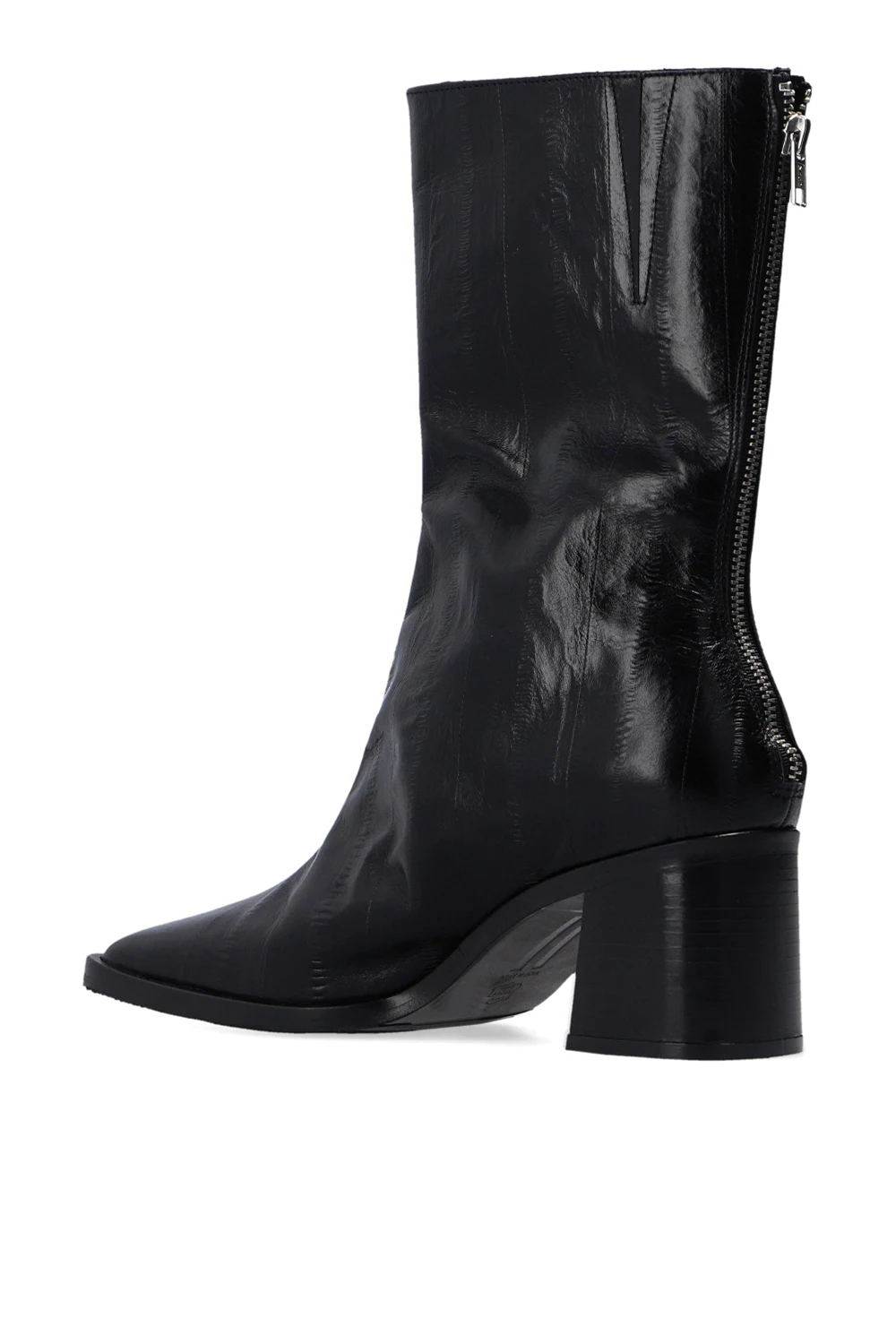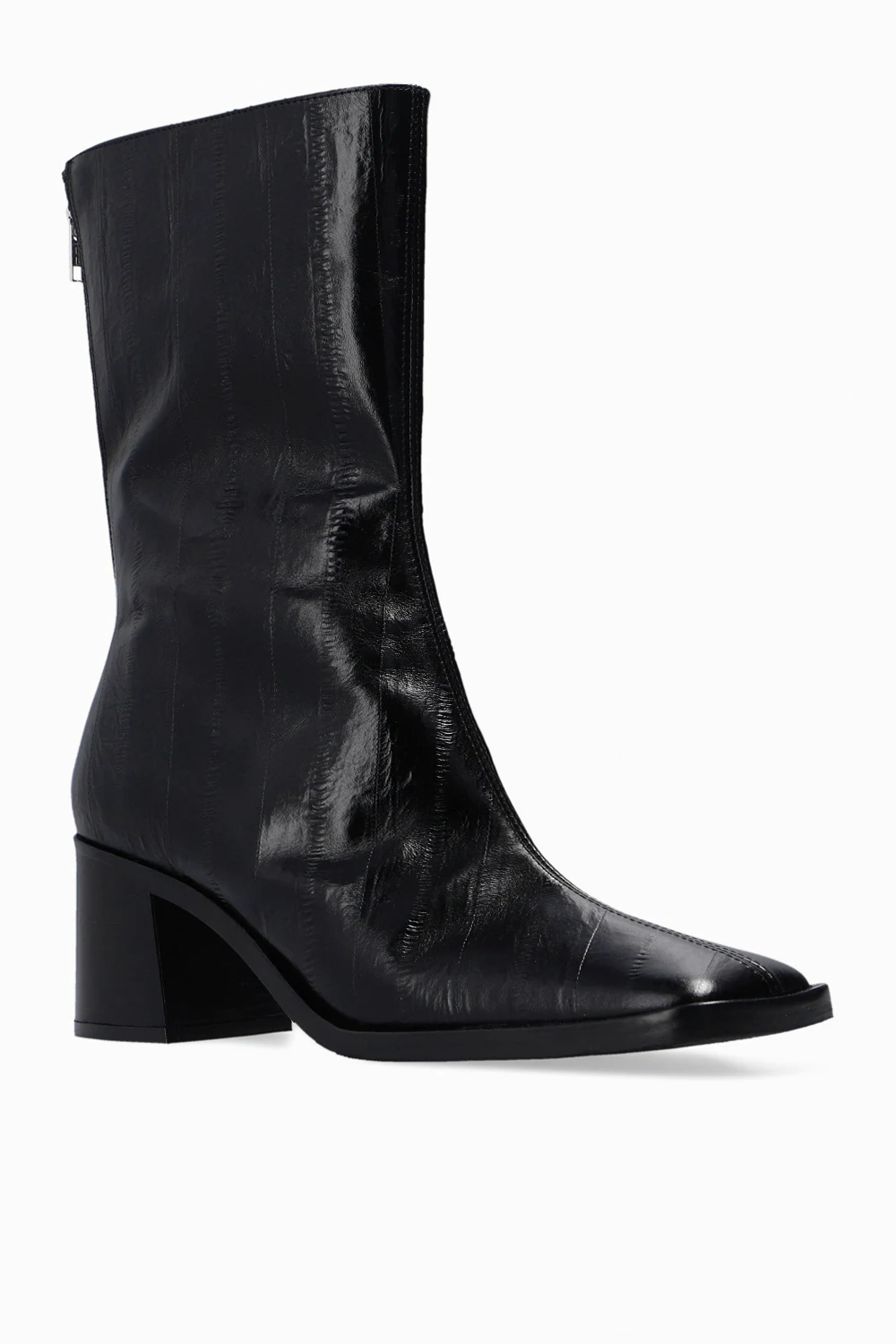 Czarne botki na obcasie, model ‘Melba Anguila’ Miista. Wykonane ze skóry. Zapinane z tyłu na zamek. Wydłużony, kwadratowy nosek. Szaro-czarna podeszwa wykonana ze skóry i gumy.