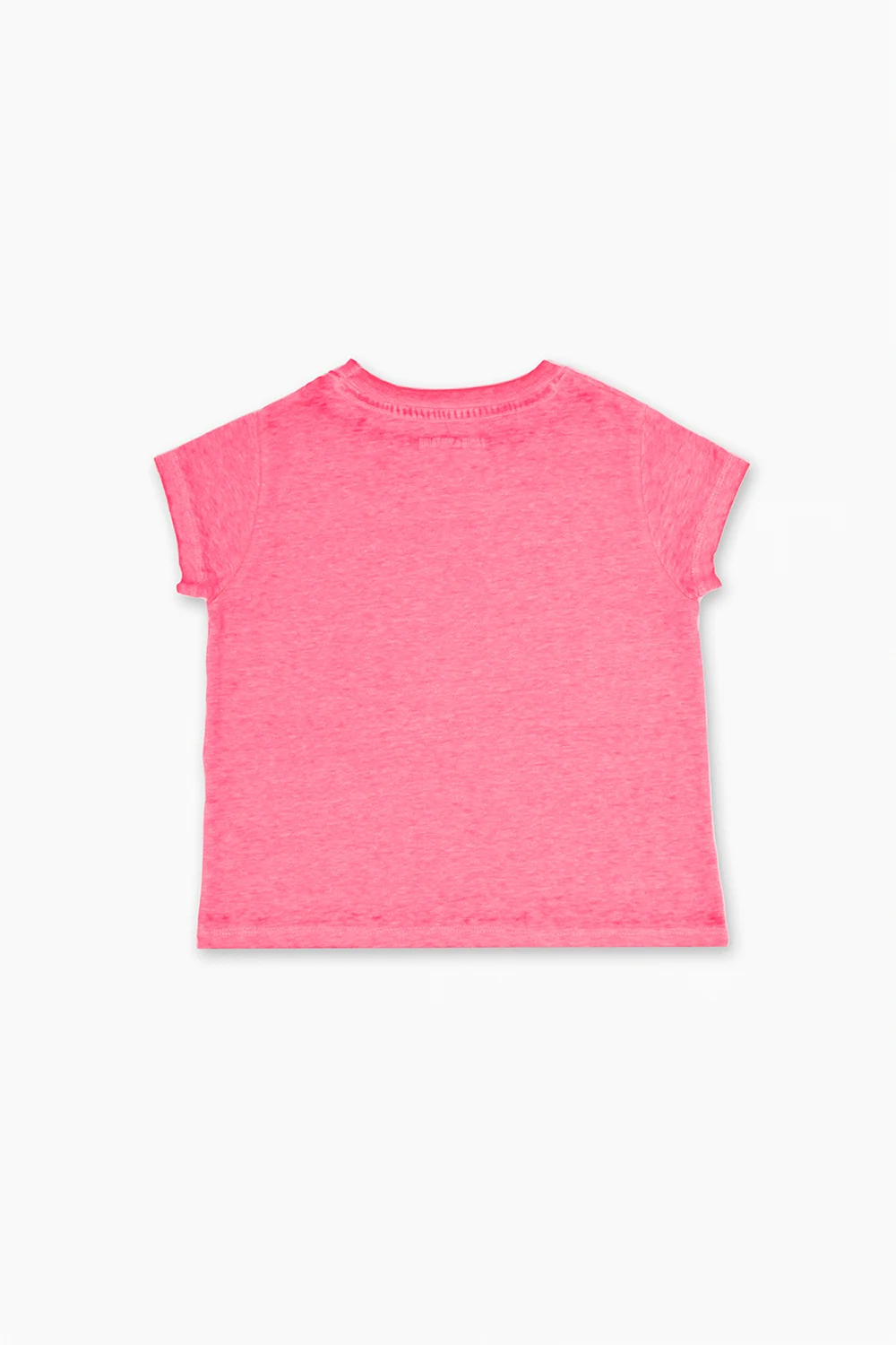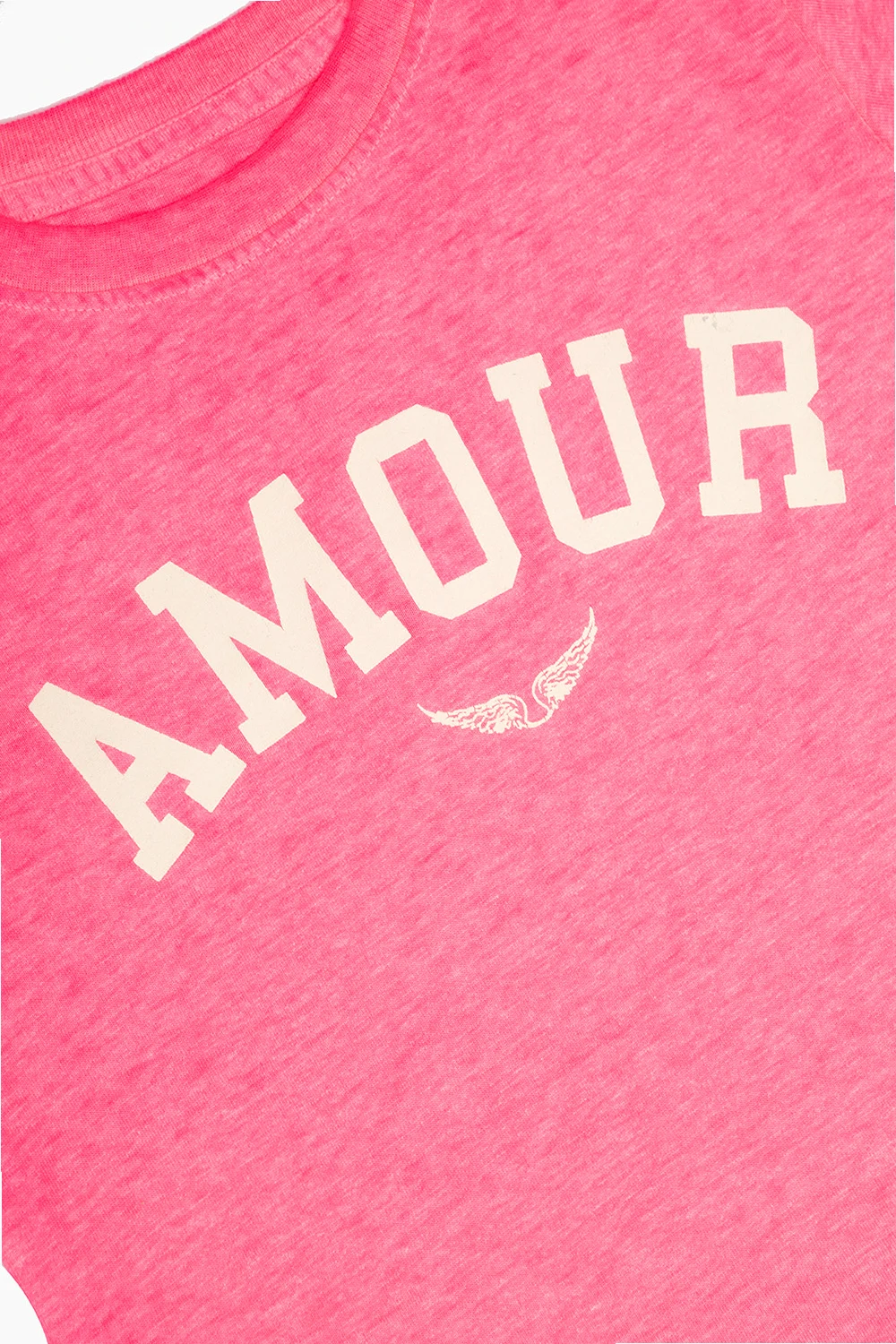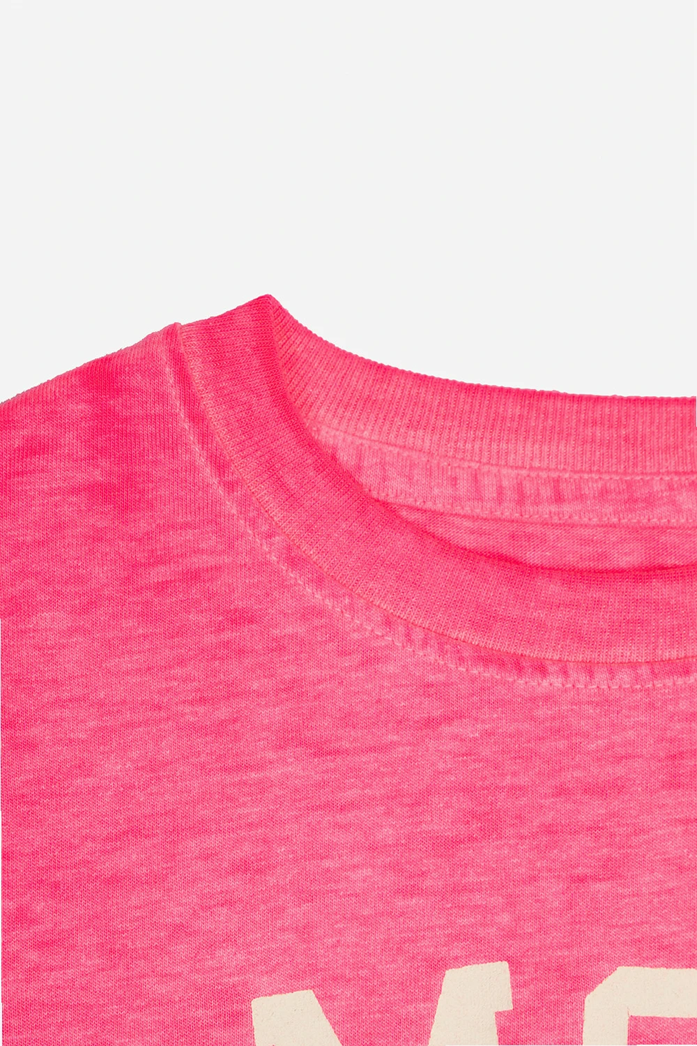 Neonoworóżowy t-shirt Zadig & Voltaire Kids. Wykonany z mieszanki bawełny. Z przodu ozdobiony kremowym nadrukiem i charakterystycznym dla marki motywem skrzydeł. Okrągły dekolt wykończony ściągaczem. Krótkie rękawy.