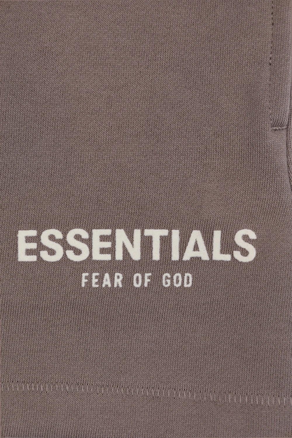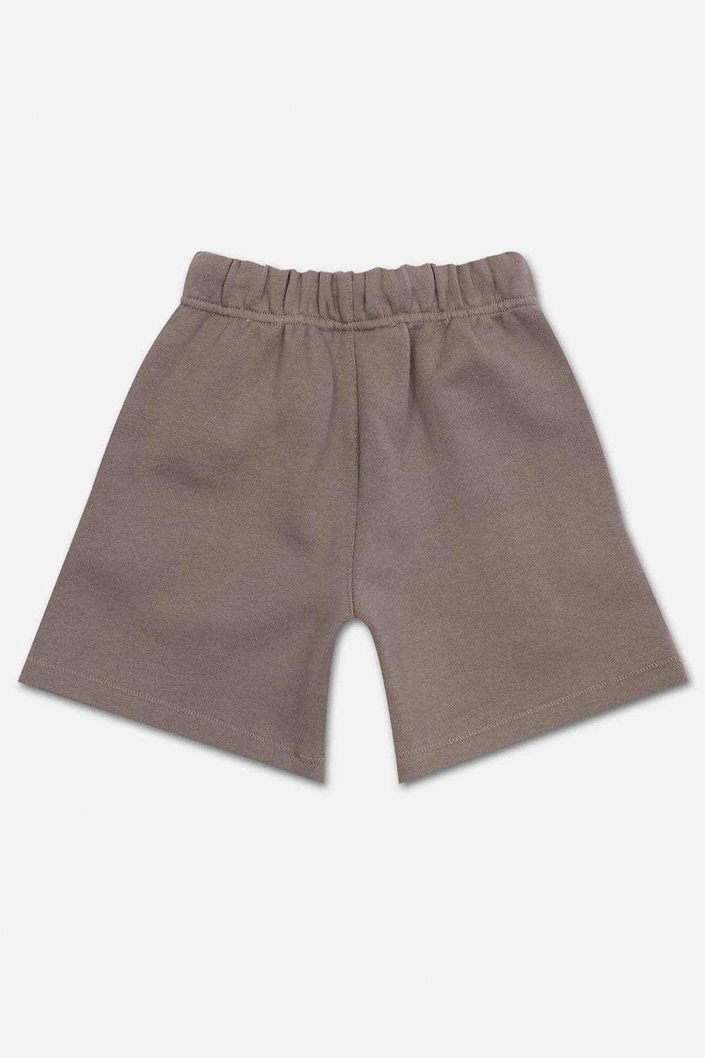 Szarobeżowe szorty Fear Of God Essentials Kids. Wykonane z bawełny. W pasie wszyta guma od wewnątrz ściągana trokami. Z przodu ozdobione kremowym logo o aksamitnym wykończeniu oraz gumową naszywką z logo w kolorze czarnym. Dwie wsuwane kieszenie.
