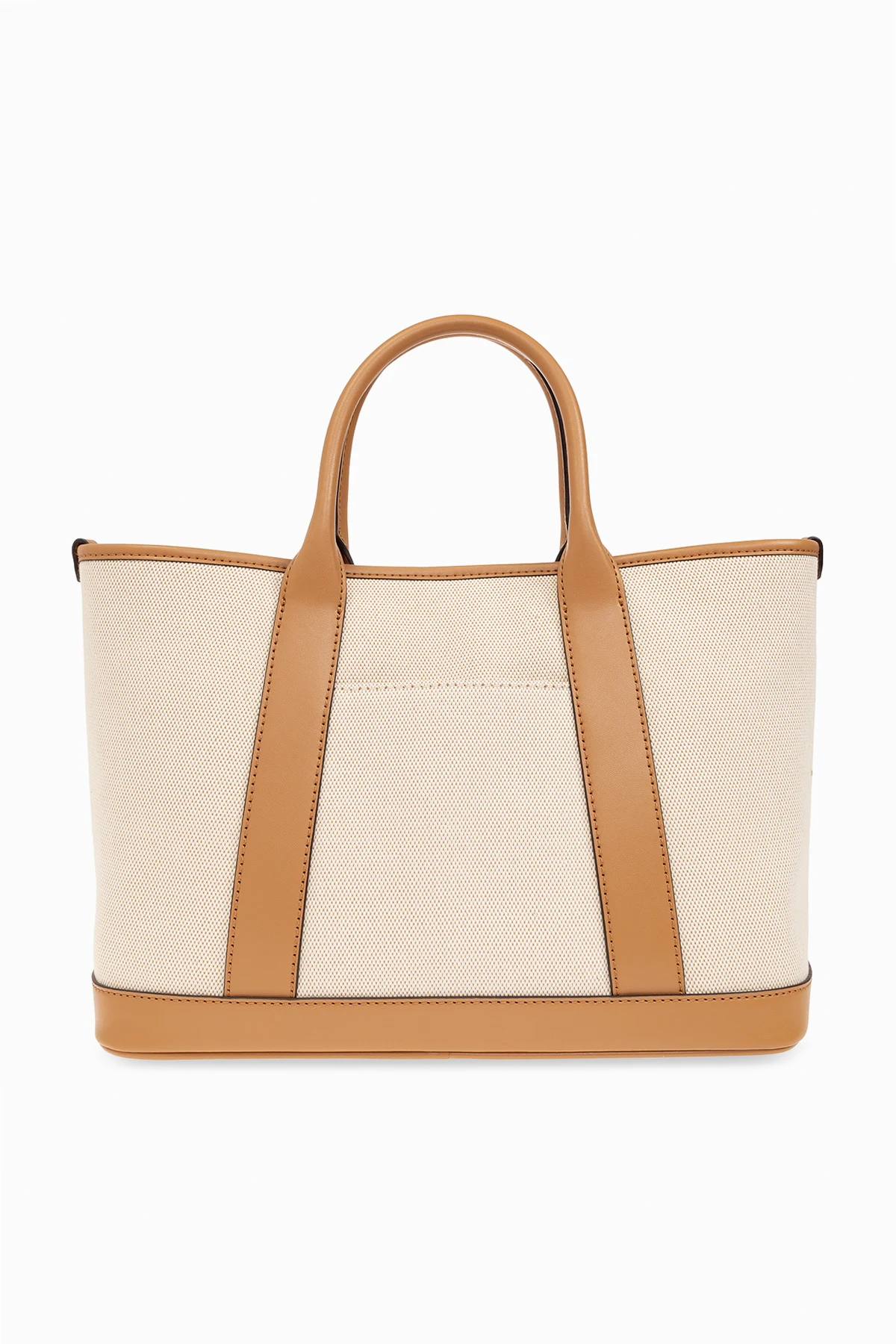 Wykonana z wysokiej jakości materiałów, w tym 56% bawełny i 44% poliestru, torba ta wyróżnia się wytrzymałością oraz drobną fakturą, dodającą jej subtelnego uroku. Brązowe elementy, prawdopodobnie z gładkiej skóry lub jej imitacji, doskonale akcentują całość. Metalowe logo projektanta oraz złote wykończenia nadają produktowi prestiżowy charakter.