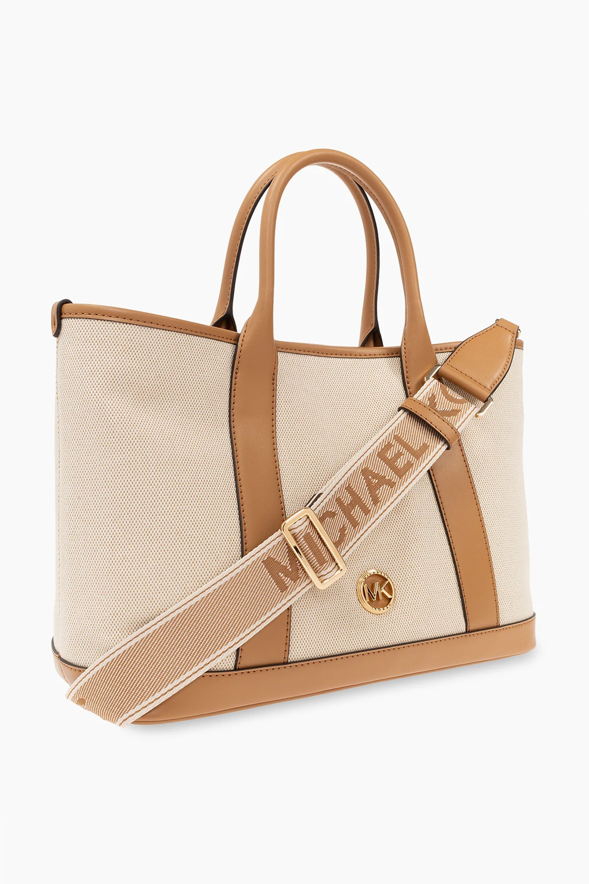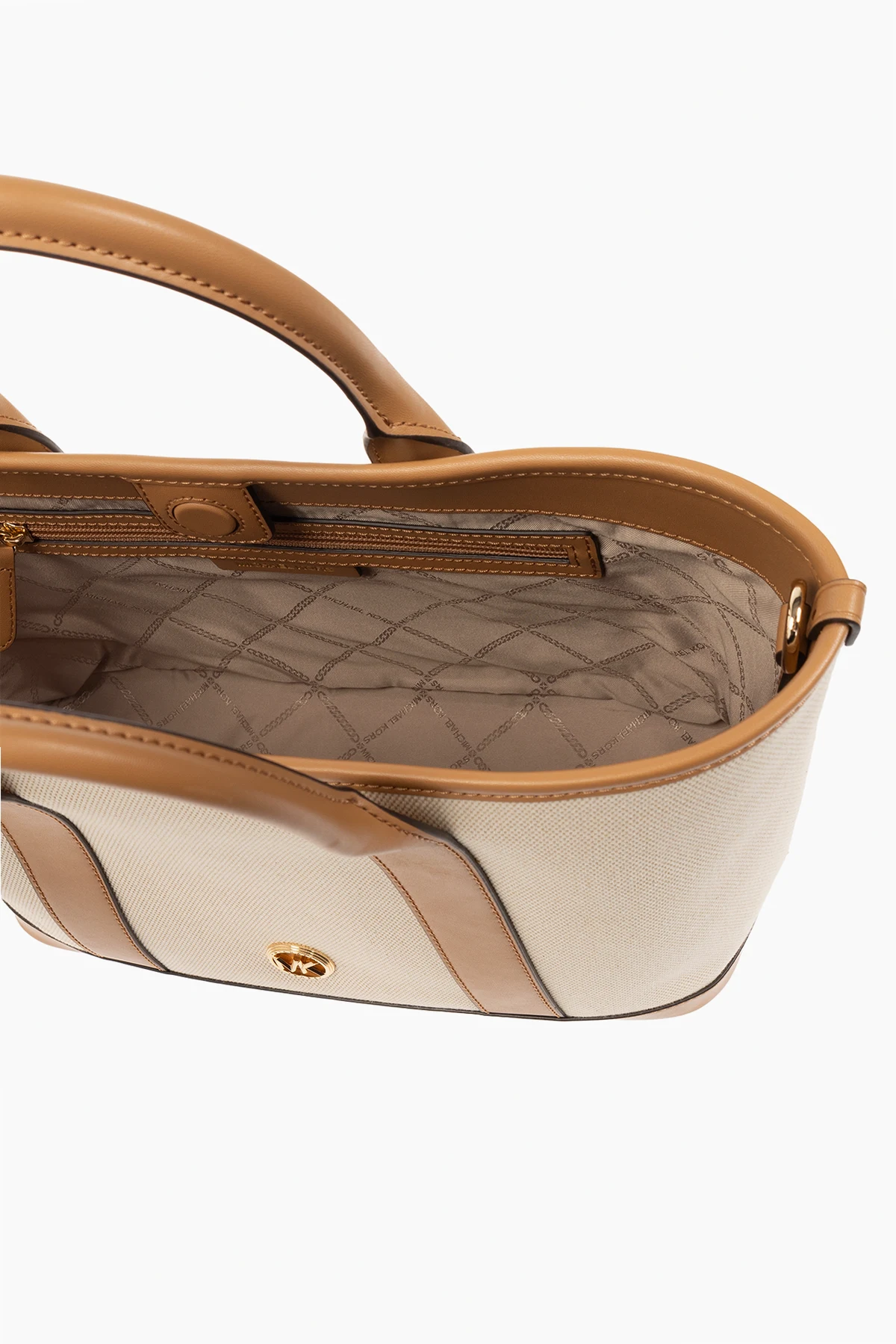 Przedstawiamy Państwu beżowo-brązową torbę na ramię od renomowanego projektanta Michael Michael Kors , będącą kwintesencją elegancji i funkcjonalności. Ten wyjątkowy model typu 'shopper' urzeka swoją strukturalną formą i wyrafinowaną kolorystyką, gdzie dominujący beż harmonijnie współgra z brązowymi wykończeniami.