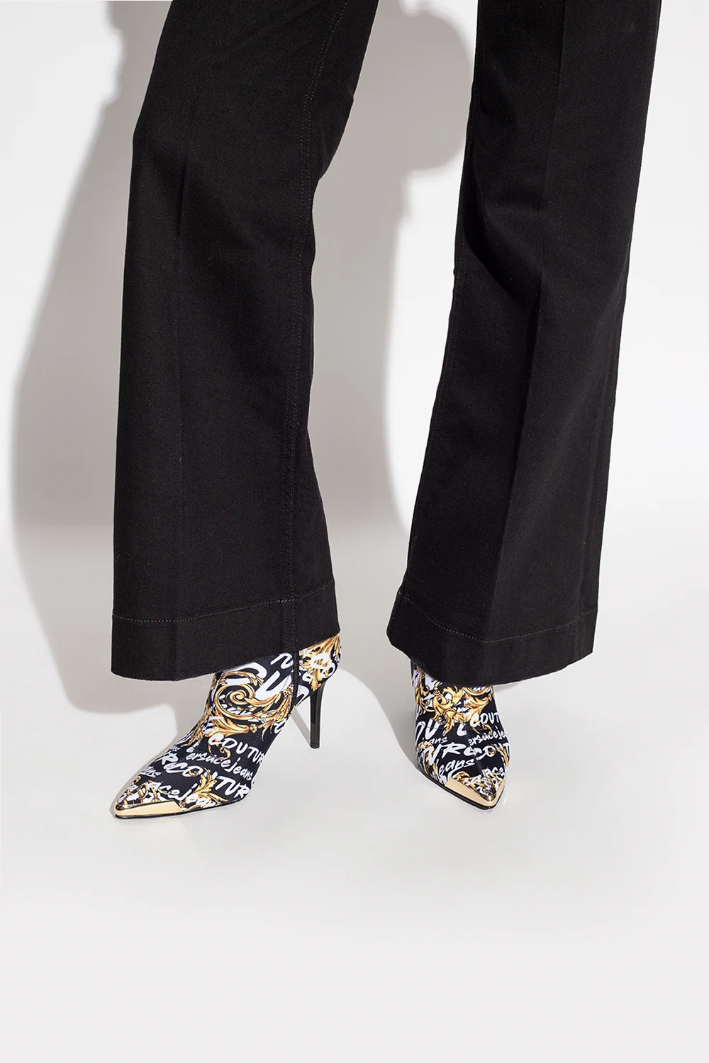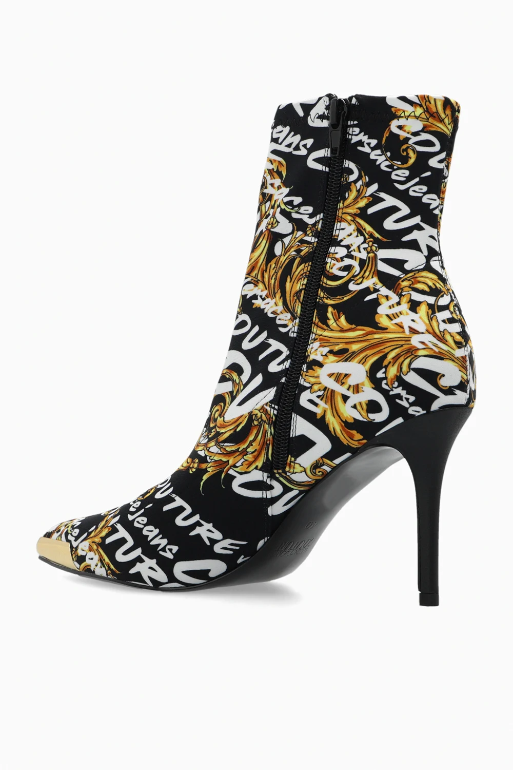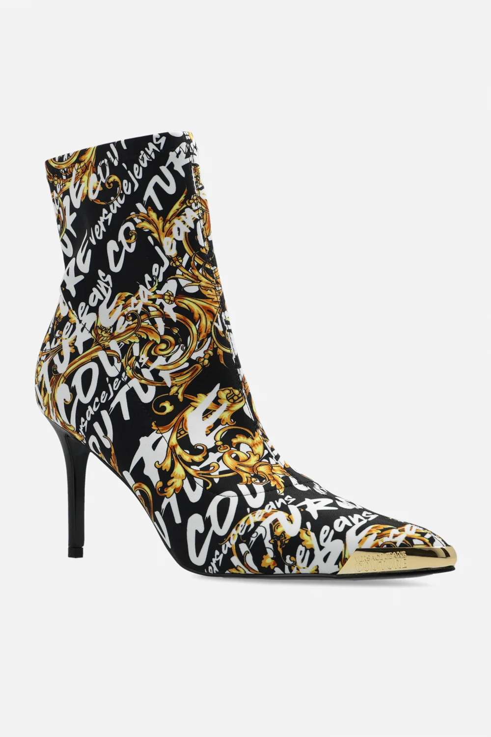 Czarne botki na obcasie Versace Jeans Couture. Wykonane z materiału. Zapinane z boku na zamek. Ozdobione biało-żółto-brązowym wzorem ‘Logo Brush Couture’. Zwężany nosek wykończony metalową aplikacją z wygrawerowanym logo w kolorze złotym. Czarna, gumowa podeszwa.