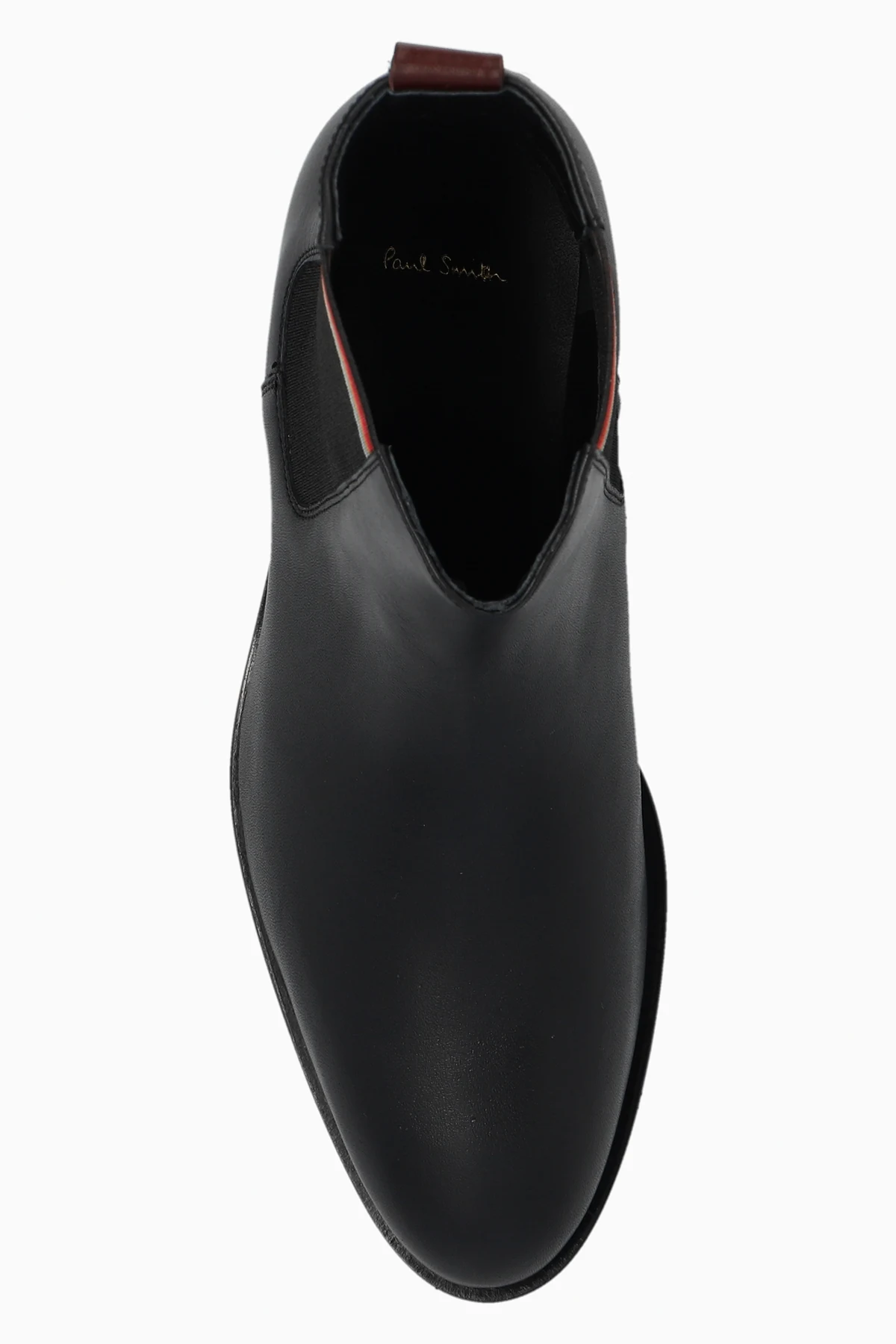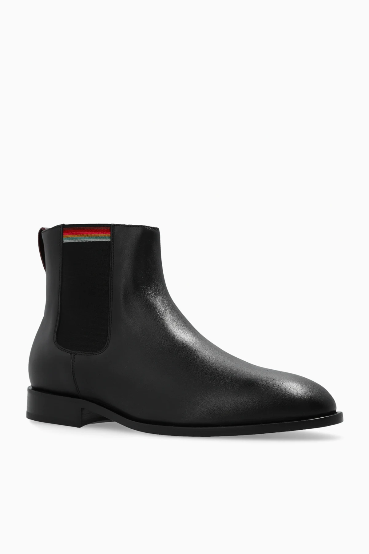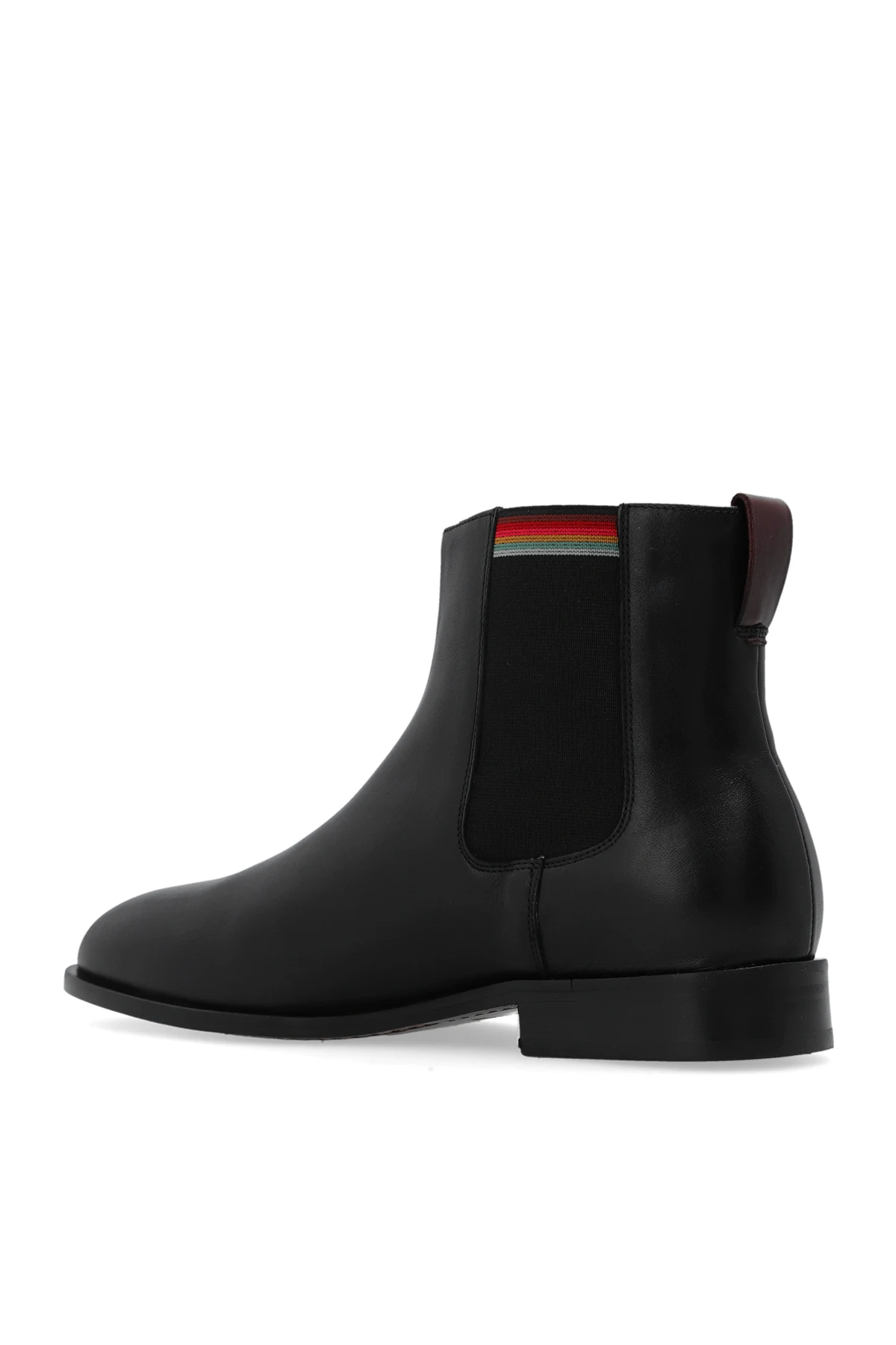 Czarne sztyblety, model ‘Penelope’ Paul Smith. Wykonane ze skóry. Po bokach wszyta czarna taśma elastyczna z kolorowym wykończeniem. Z tyłu bordowy uchwyt. Bordowa, skórzana podeszwa.