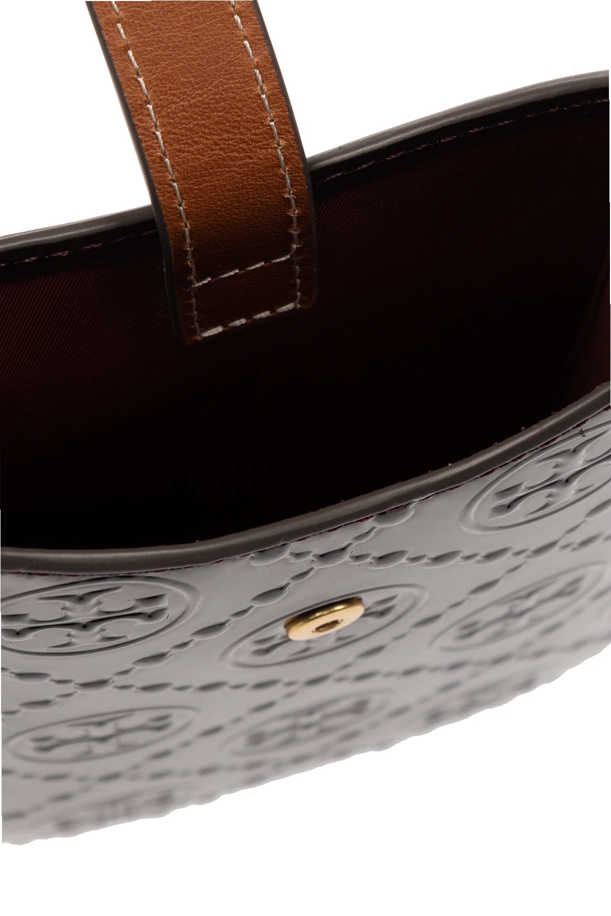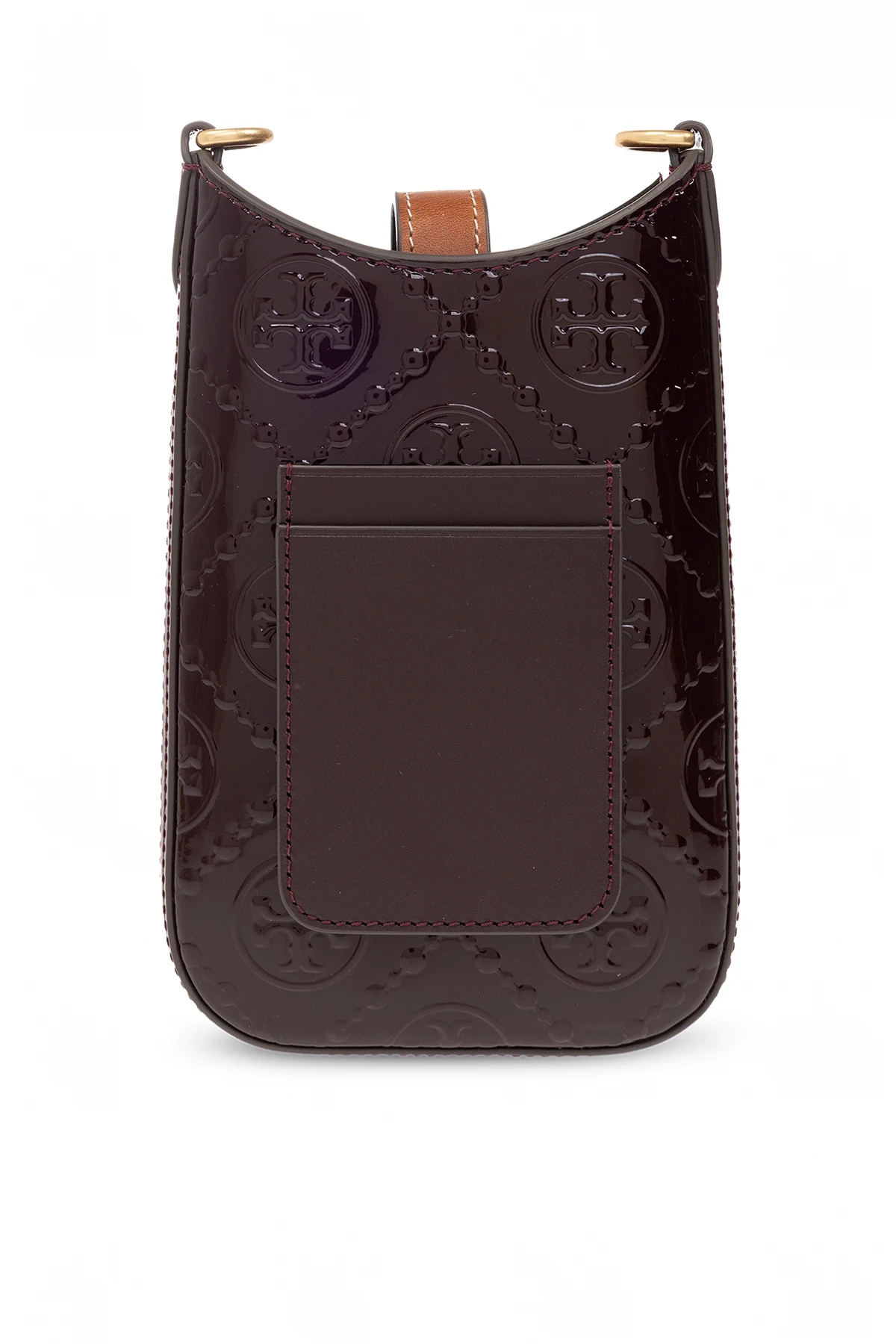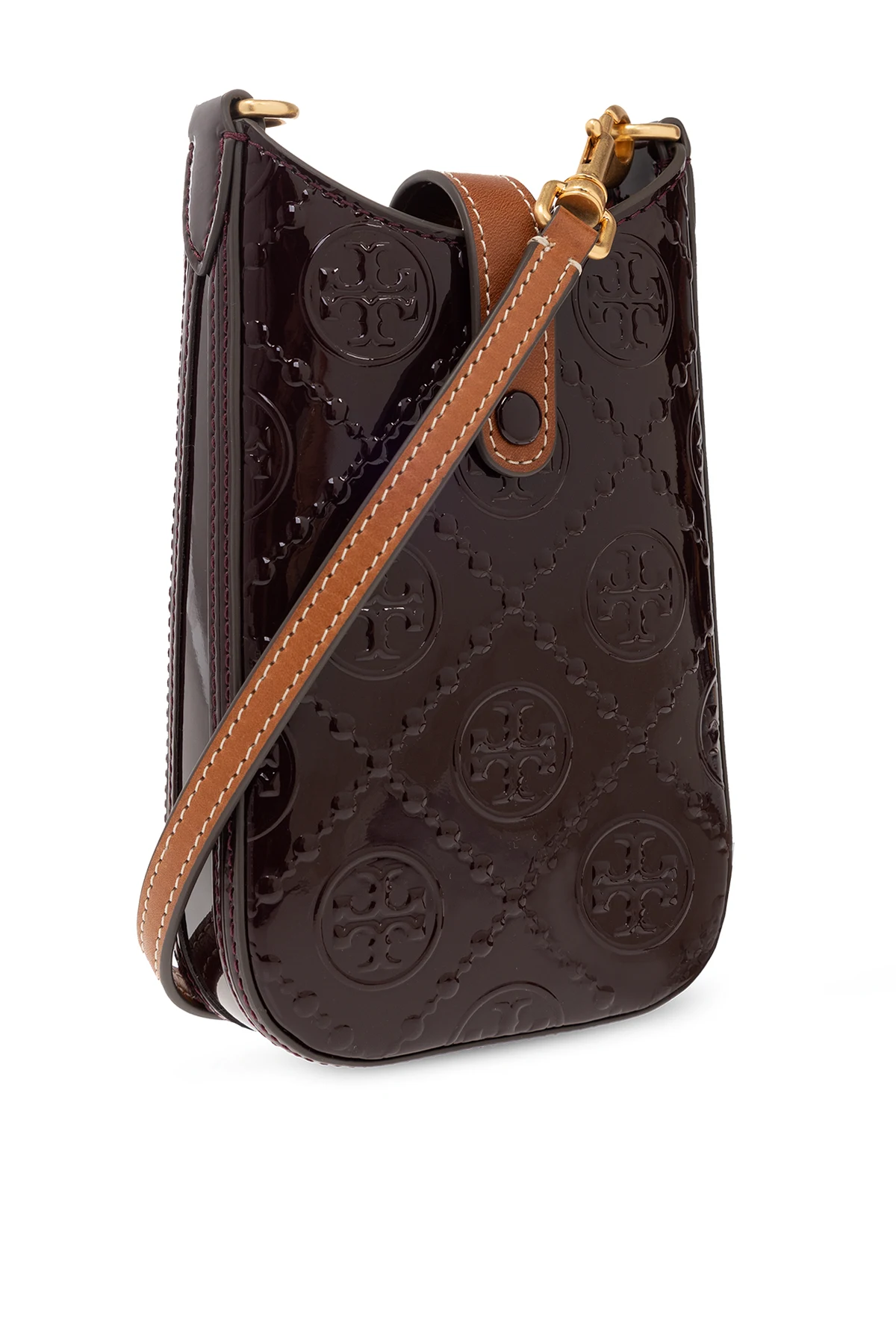 Bordowe etui na telefon, model ‘T Monogram’ Tory Burch. Wykonane ze skóry krowiej. Zamykane na zatrzask. Ozdobione wytłoczonym logo. Dołączony pas na ramię. Z tyłu dwa miejsca na karty. Wewnątrz komora. Metalowe wykończenie w kolorze złotym.