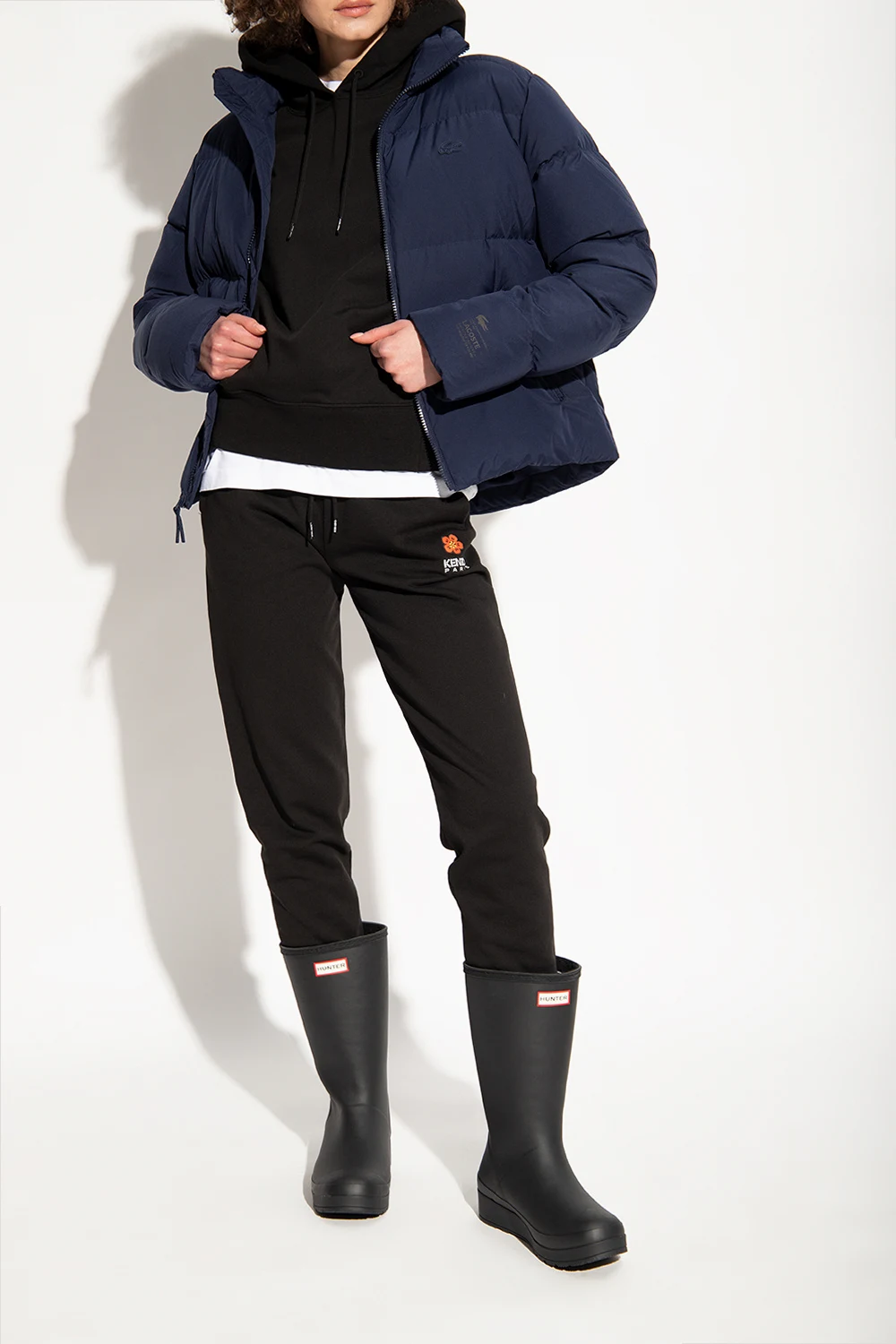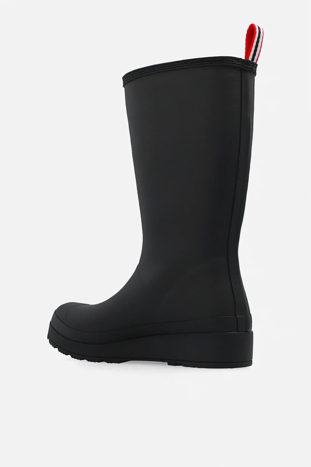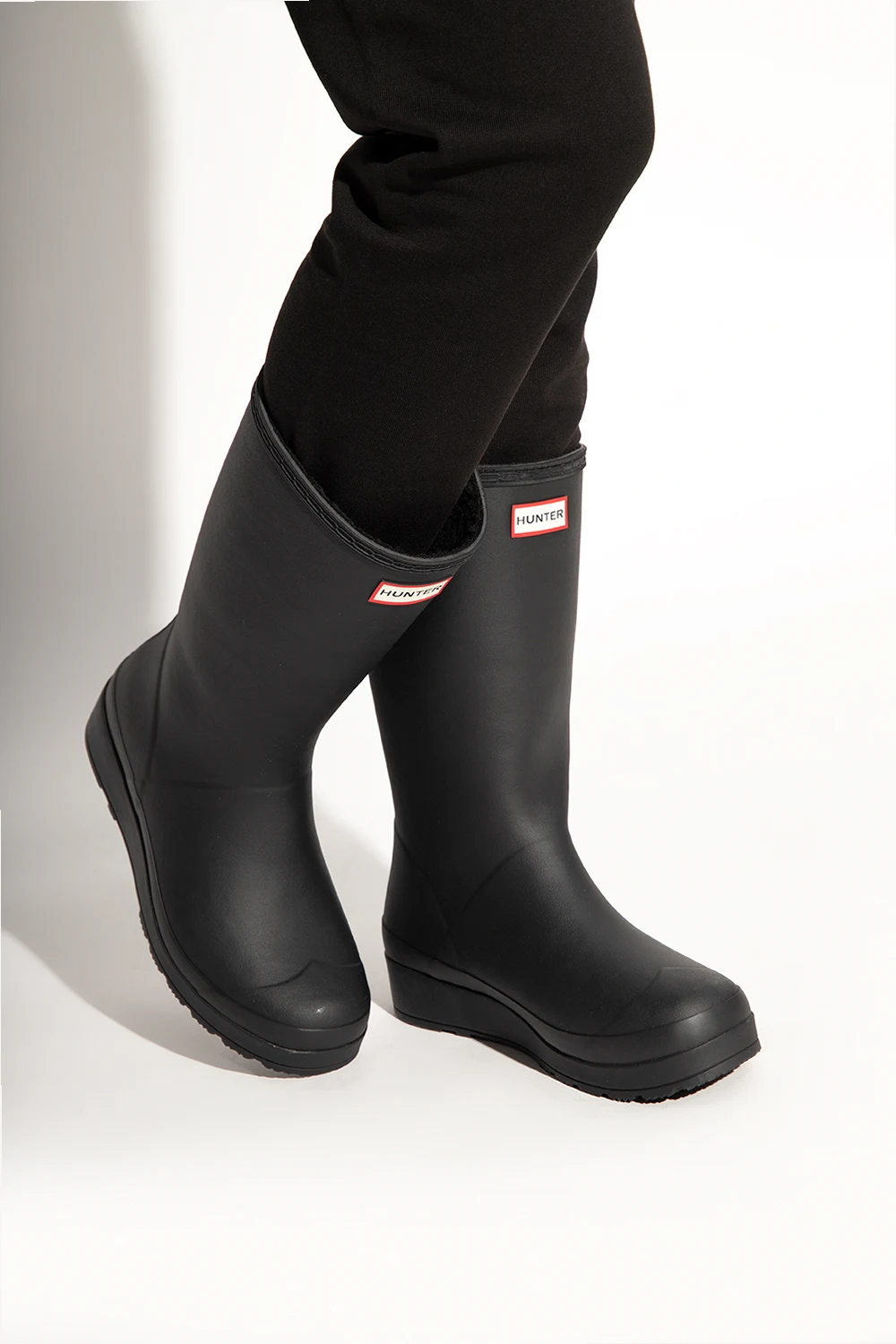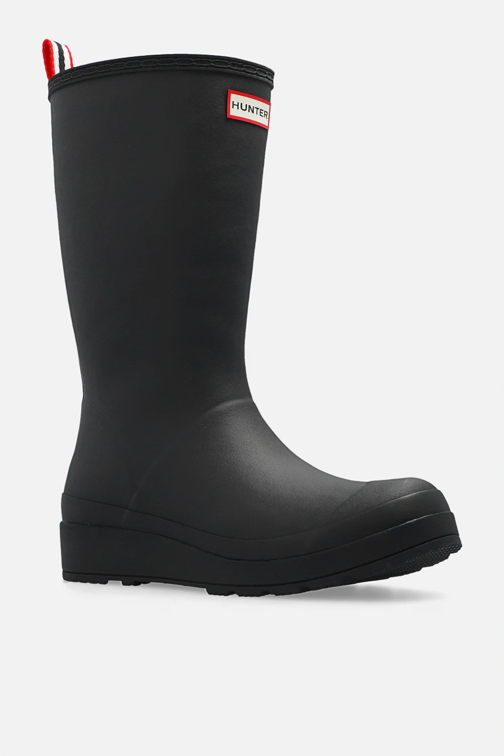 Czarne kalosze, model ‘Play Tall’ Hunter. Wykonane ręcznie z naturalnej, wulkanizowanej gumy o matowym wykończeniu. Z przodu ozdobione aplikacją z logo. Z tyłu materiałowy uchwyt w kolorze biało-czerwono-granatowym oraz biały nadruk z logo. Warstwa wewnętrzna wykończona sztucznym futrem. Gumowa podeszwa zewnętrzna z charakterystycznym dla marki wzorem bieżnika.