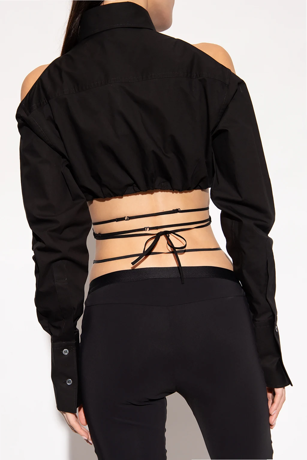 Czarna, krótka koszula Nensi Dojaka. Wykonana z bawełny. Zapinana na guziki z krytą plisą. Wycięcia na ramionach. U dołu wszyta guma oraz dekoracyjne, regulowane paski zapinane na haftki.