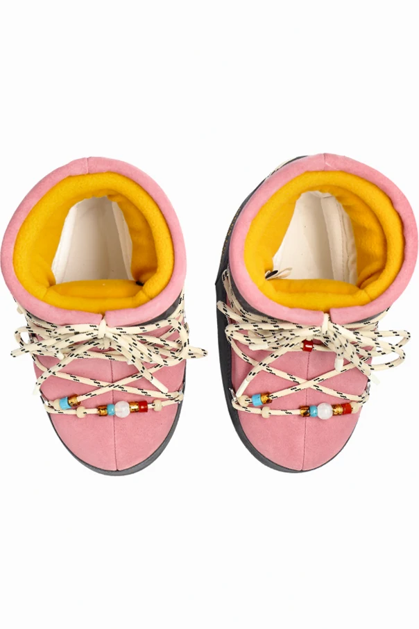 Grube kremowe sznurowadła z czarnymi detalami oraz misternie wplecione kolorowe koraliki są subtelnym, a zarazem radosnym akcentem wyróżniającym te śniegowce. Płaska, solidna podeszwa gwarantuje stabilność nawet w najbardziej wymagających warunkach zimowych.