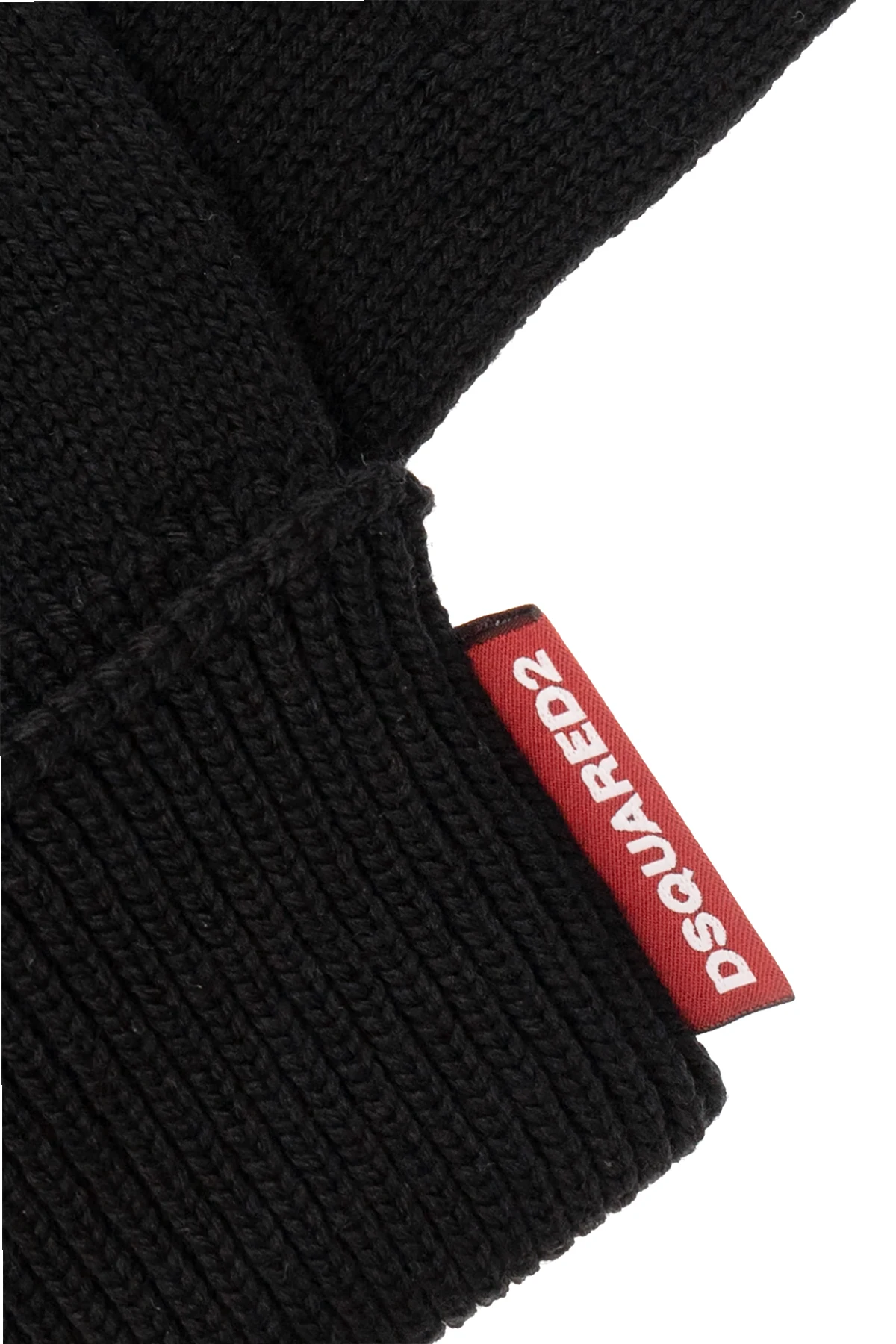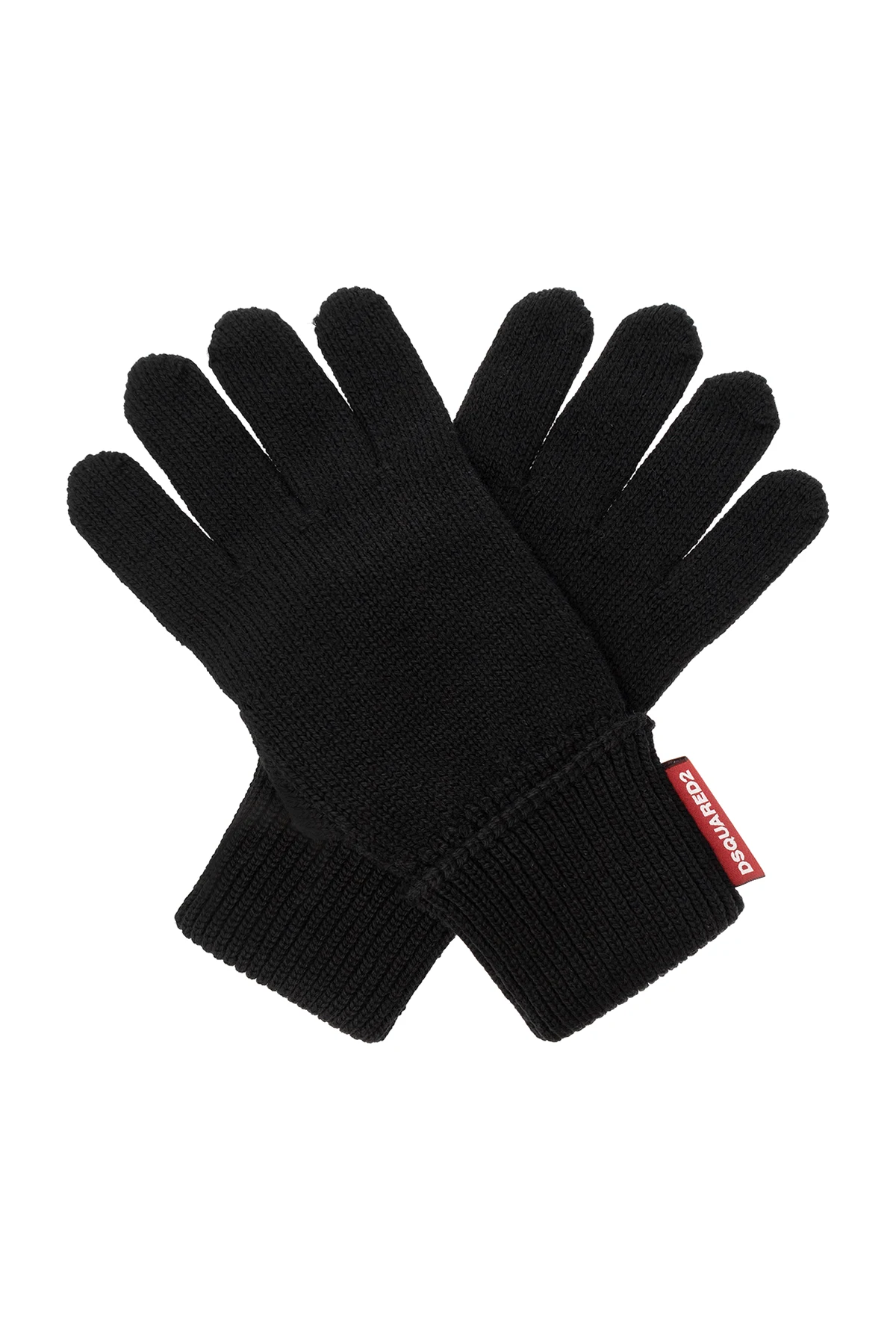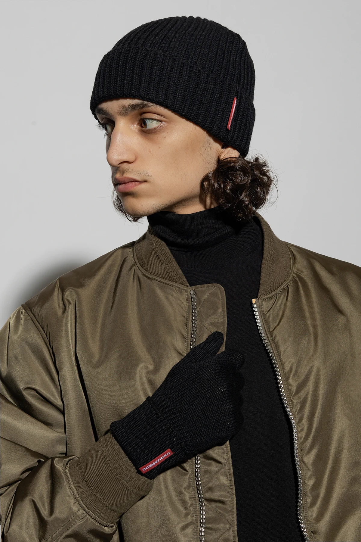 Czarny zestaw: czapka i rękawiczki Dsquared2. Wykonany z wełny. Ozdobiony naszywką z logo w kolorze biało-czarnym.