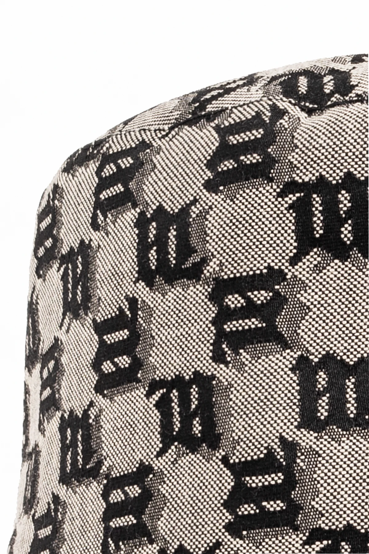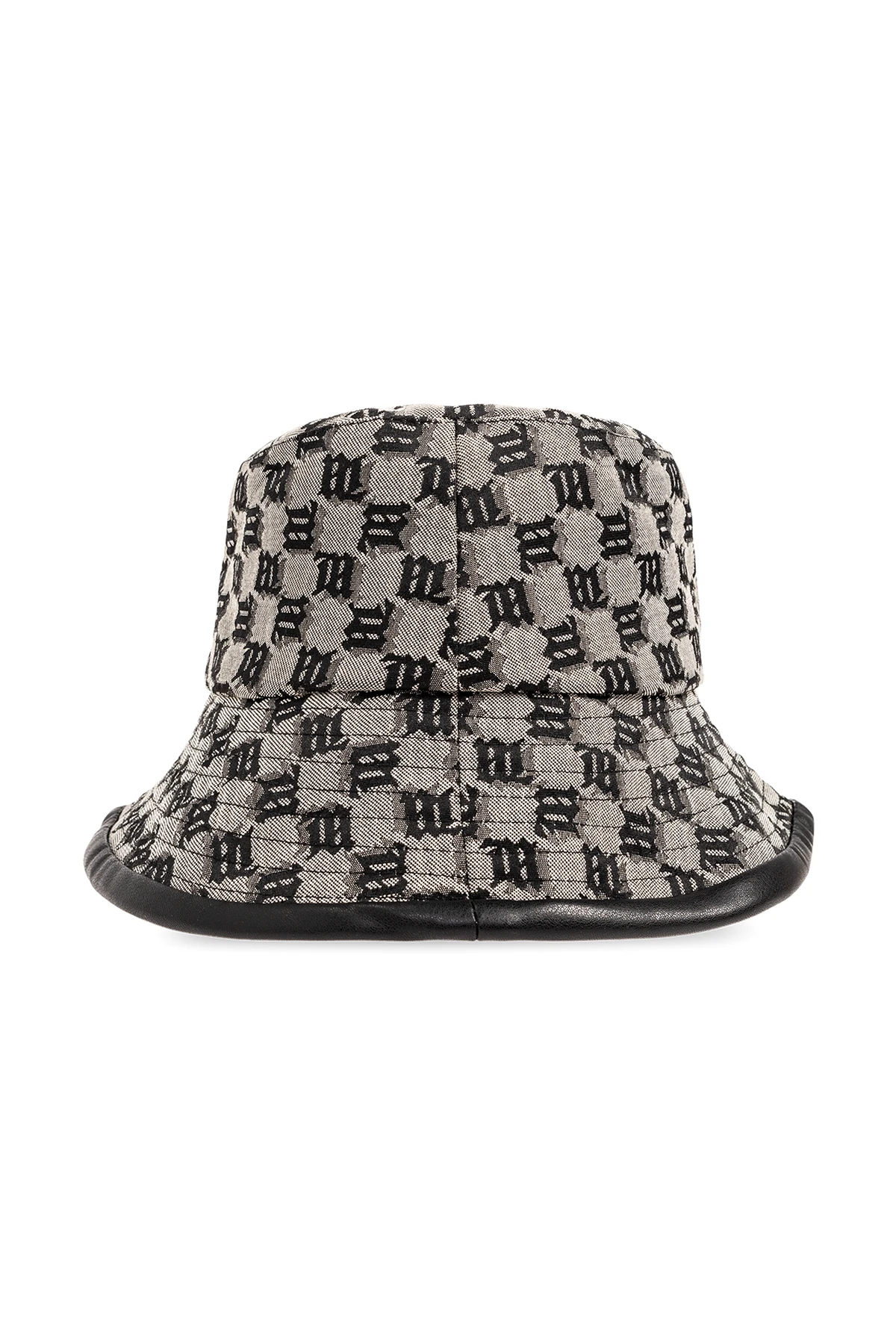 Beżowo-czarny kapelusz MISBHV. Wykonany z bawełny. Ozdobiony wzorem z monogramem.