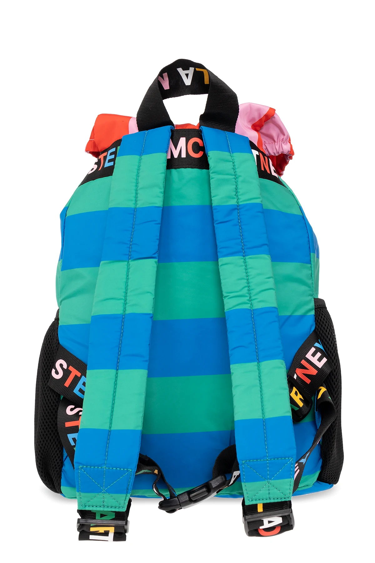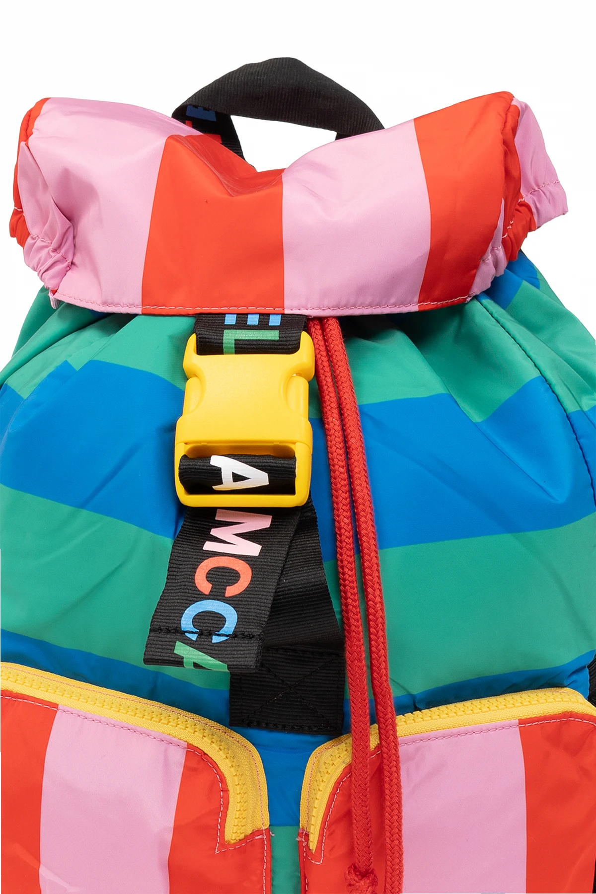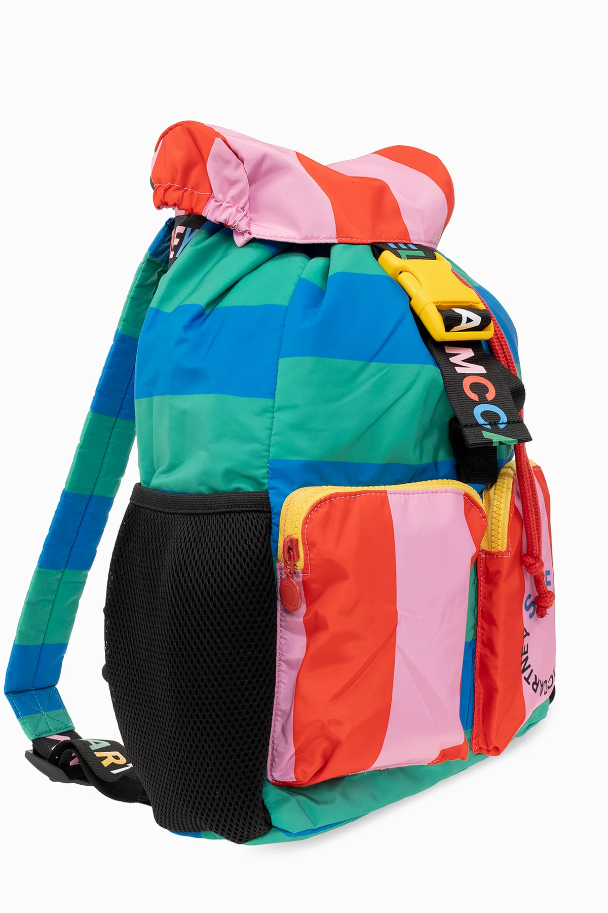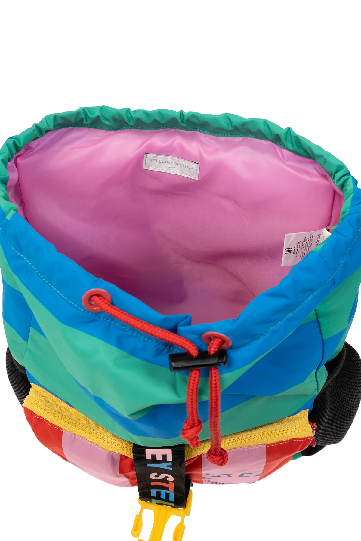 Kolorowy plecak Stella McCartney Kids. Wykonany z materiału pozyskanego z recyklingu. Zamykany na klapę z paskiem na zatrzask. Ozdobiony wzorem w paski oraz logo. Cztery kieszenie: po dwie zamykane na zamek z przodu i wsuwane po bokach. Na górze krótki uchwyt, z tyłu regulowane szelki. Wewnątrz komora ściągana trokami.