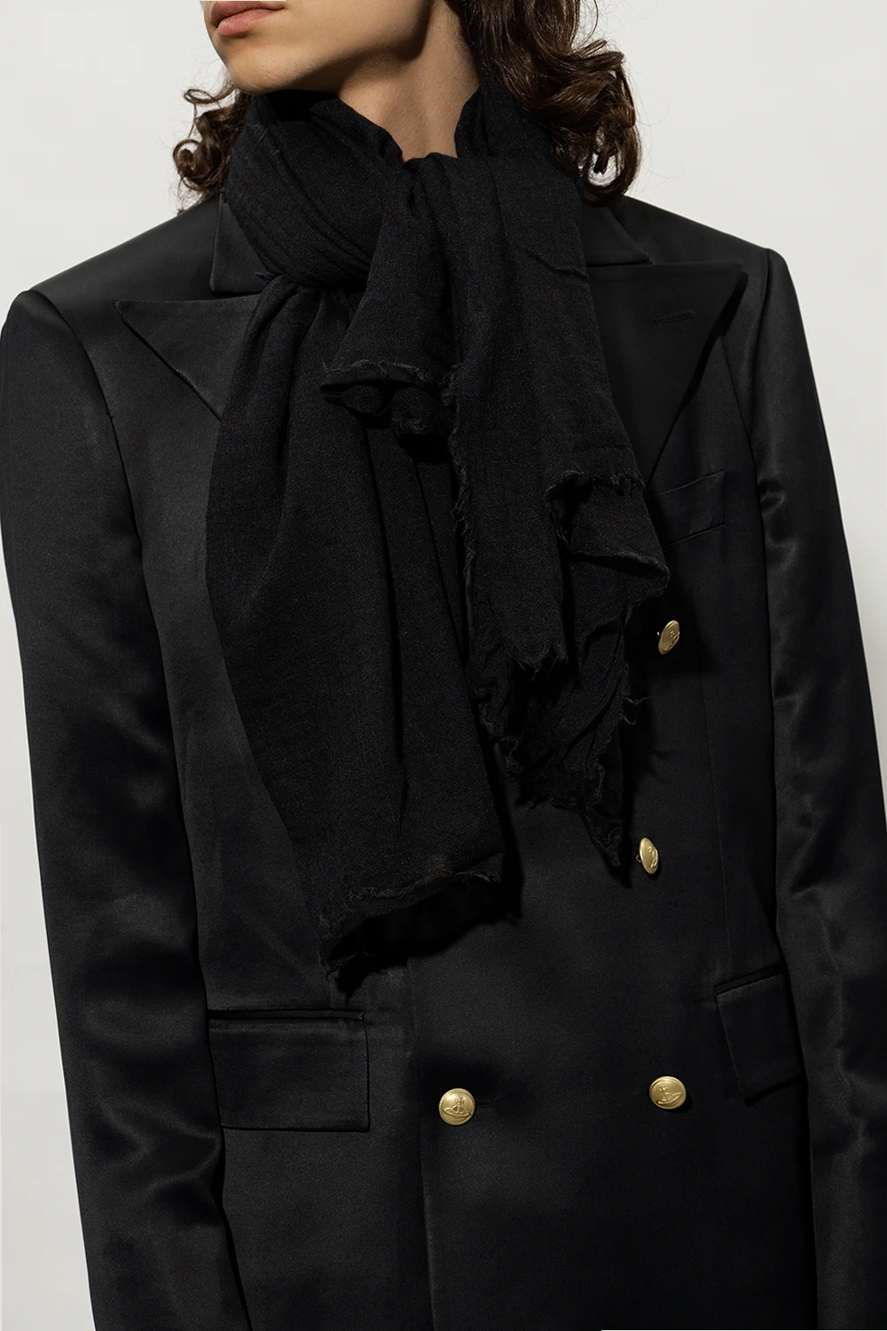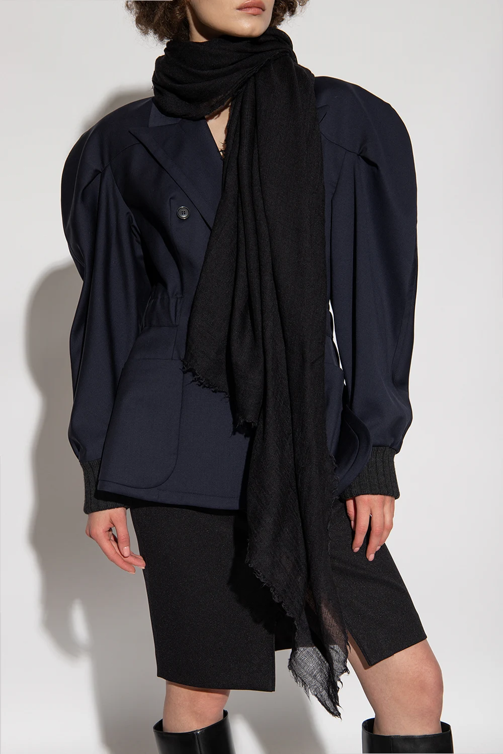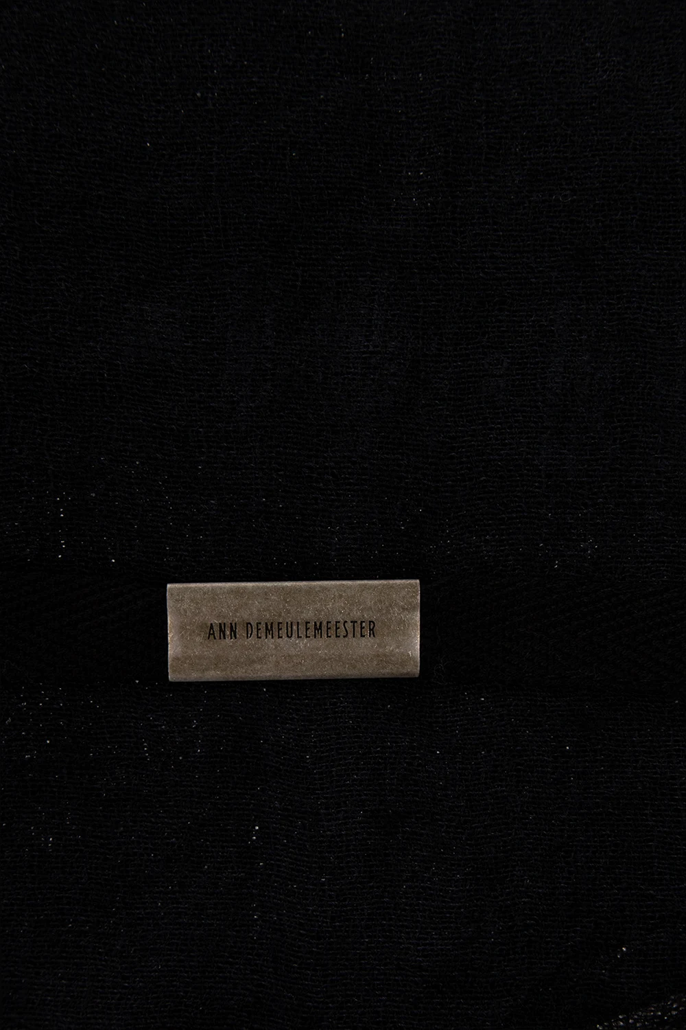Czarna chusta Ann Demeulemeester. Wykonana z wełny, jedwabiu i kaszmiru. Ozdobiona aplikacją z wygrawerowanym logo. Surowo wykończone brzegi.