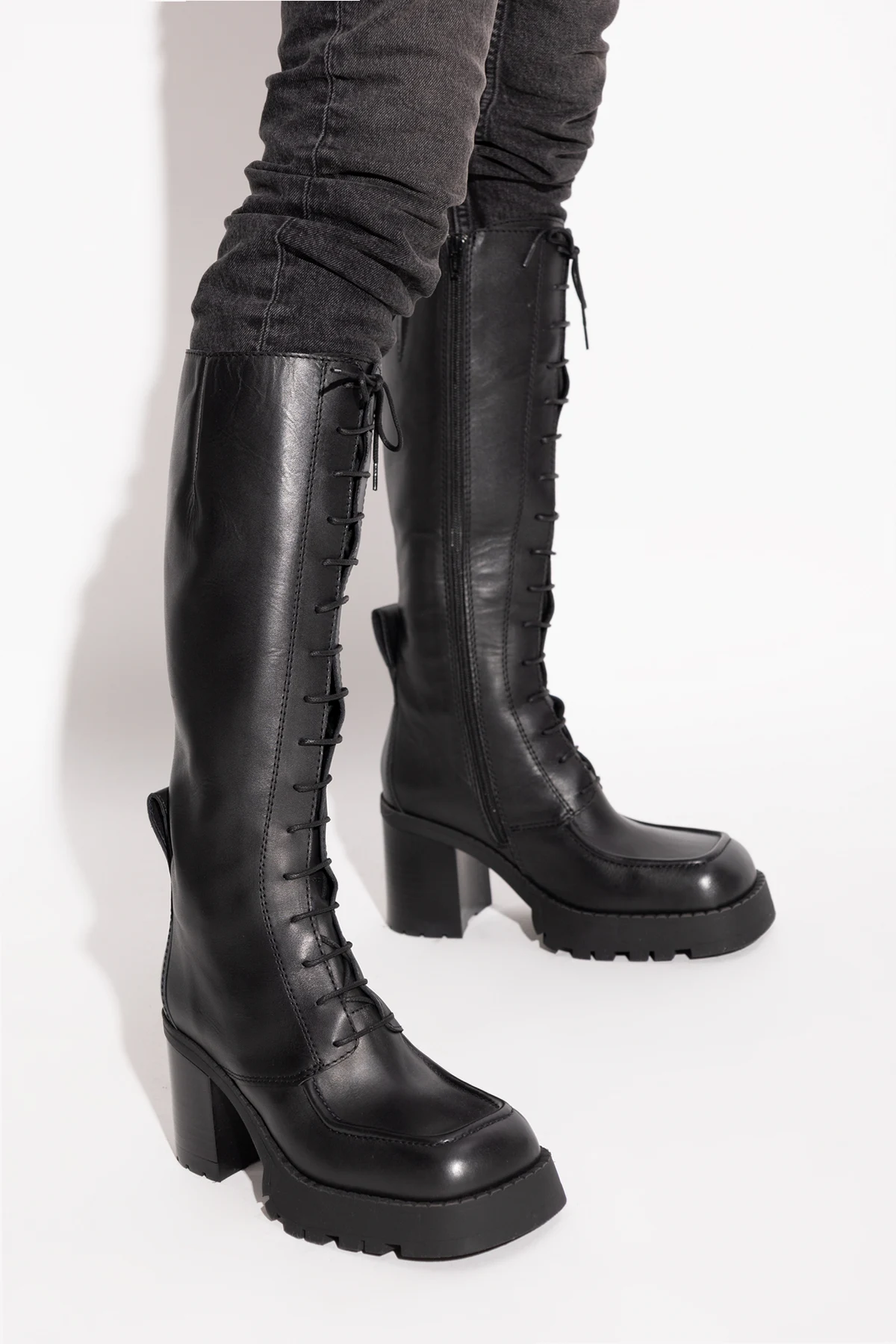 Buty sięgające do kolan z solidnym, kwadratowym obcasem.