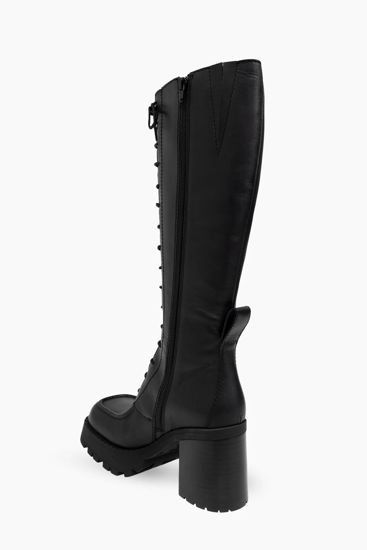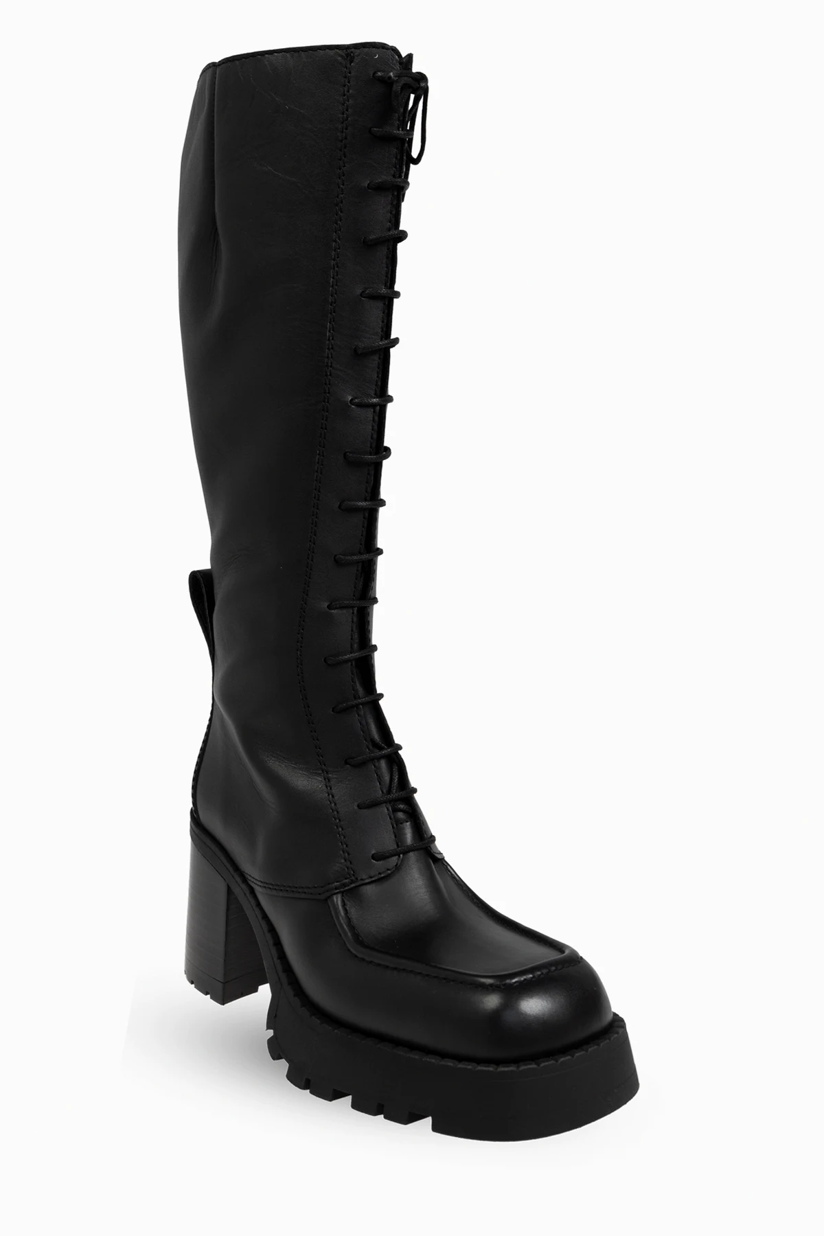 Przedstawiamy ekskluzywne czarne sznurowane buty do kolan "Grit" od renomowanej marki Miista . Te wyjątkowe buty, sięgające do kolan, wyróżniają się solidnym, kwadratowym obcasem, który zapewnia stabilność i dodaje elegancji. Gruba, ząbkowana podeszwa gwarantuje doskonałą przyczepność i nowoczesny wygląd.
