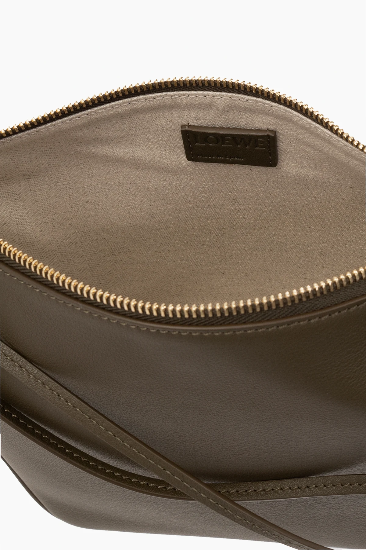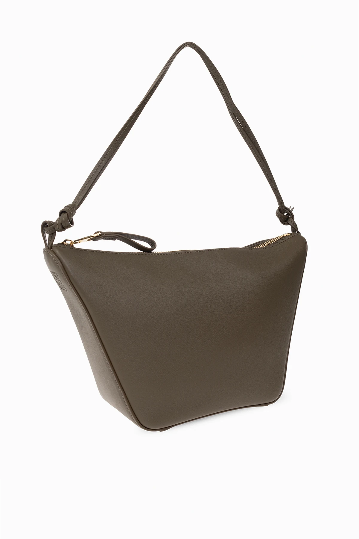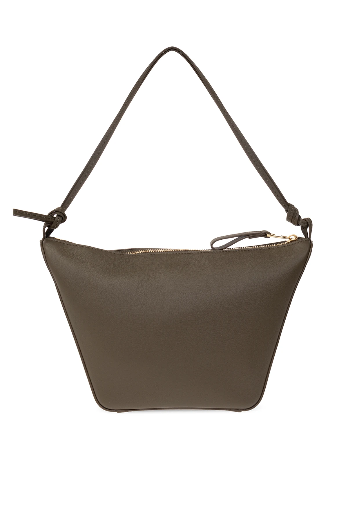 Torba na ramię w kolorze khaki, model 'Hammock Hobo Mini' Loewe. Wykonana ze skóry cielęcej. Zamykana na zamek. Z boku wytłoczony wzór z monogramem. Odpinany pas z możliwością regulacji. Długi trok służący jako rączka. Wewnątrz komora. Metalowe elementy w kolorze złotym.