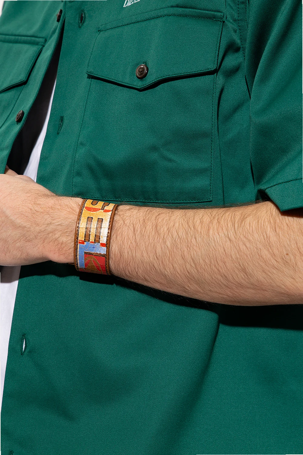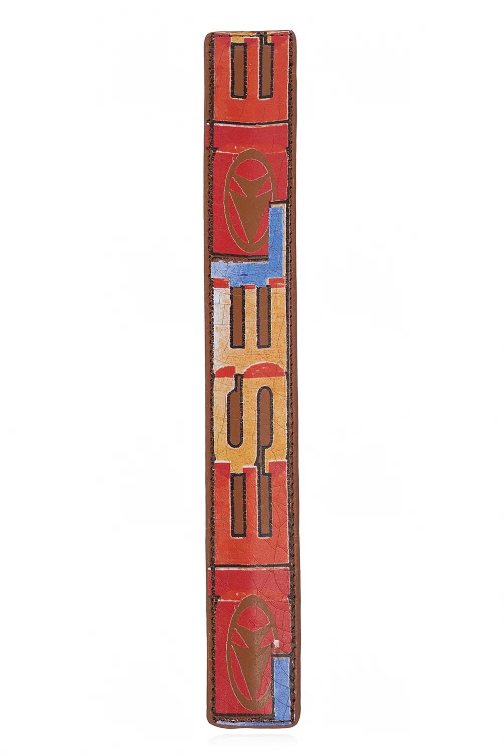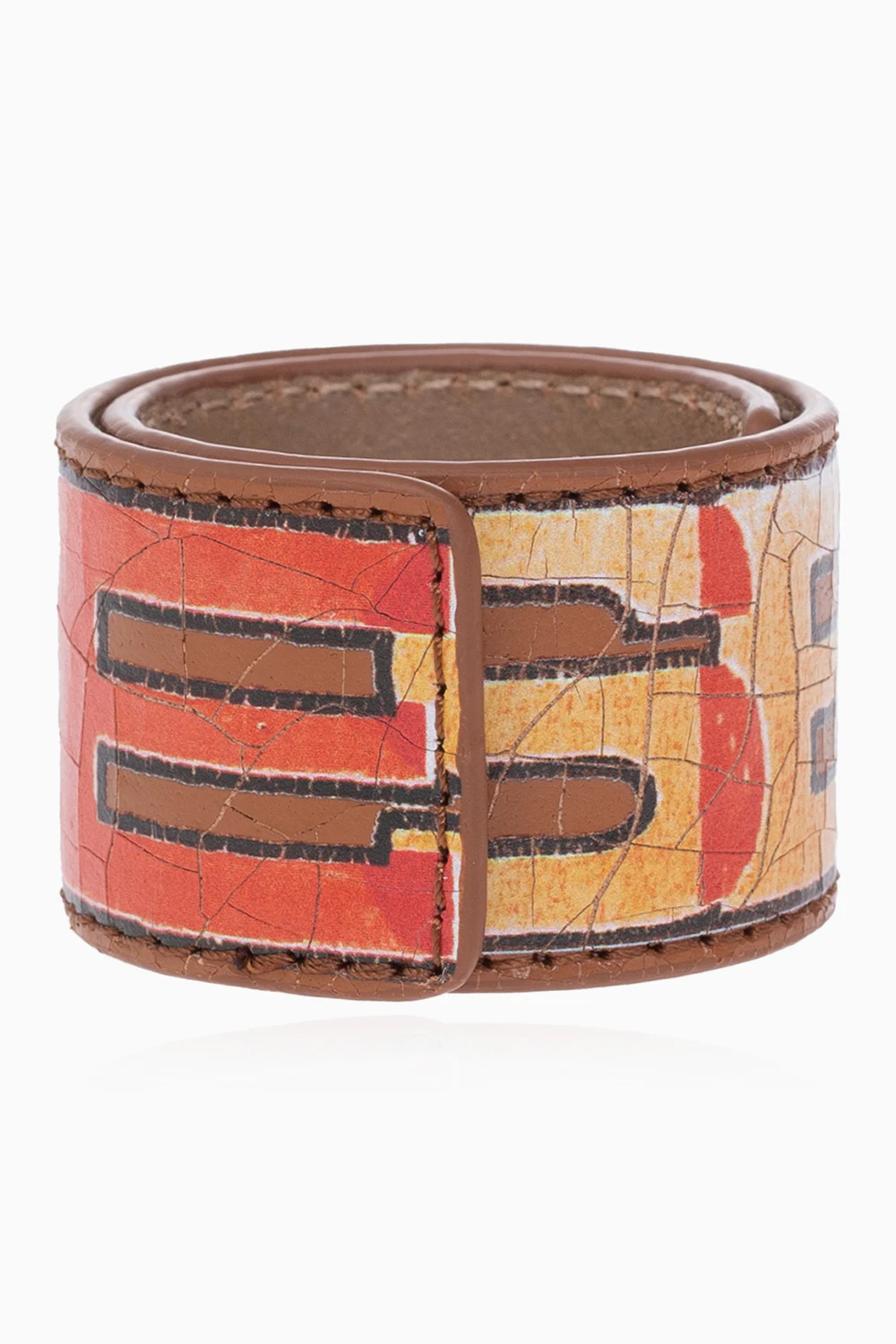 Brązowa bransoleta, model 'A-PRINTYE' Diesel. Wykonana z włoskiej popękanej skóry, jest ozdobiona kolorowym logo na całej powierzchni. Wzorowana na kultowym pasku z archiwów marki.