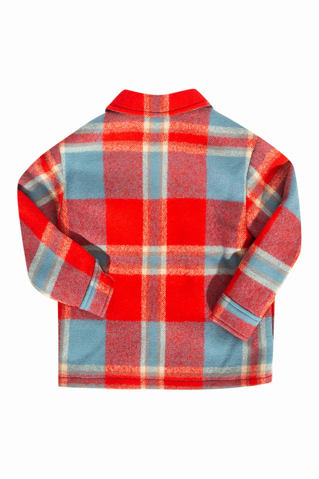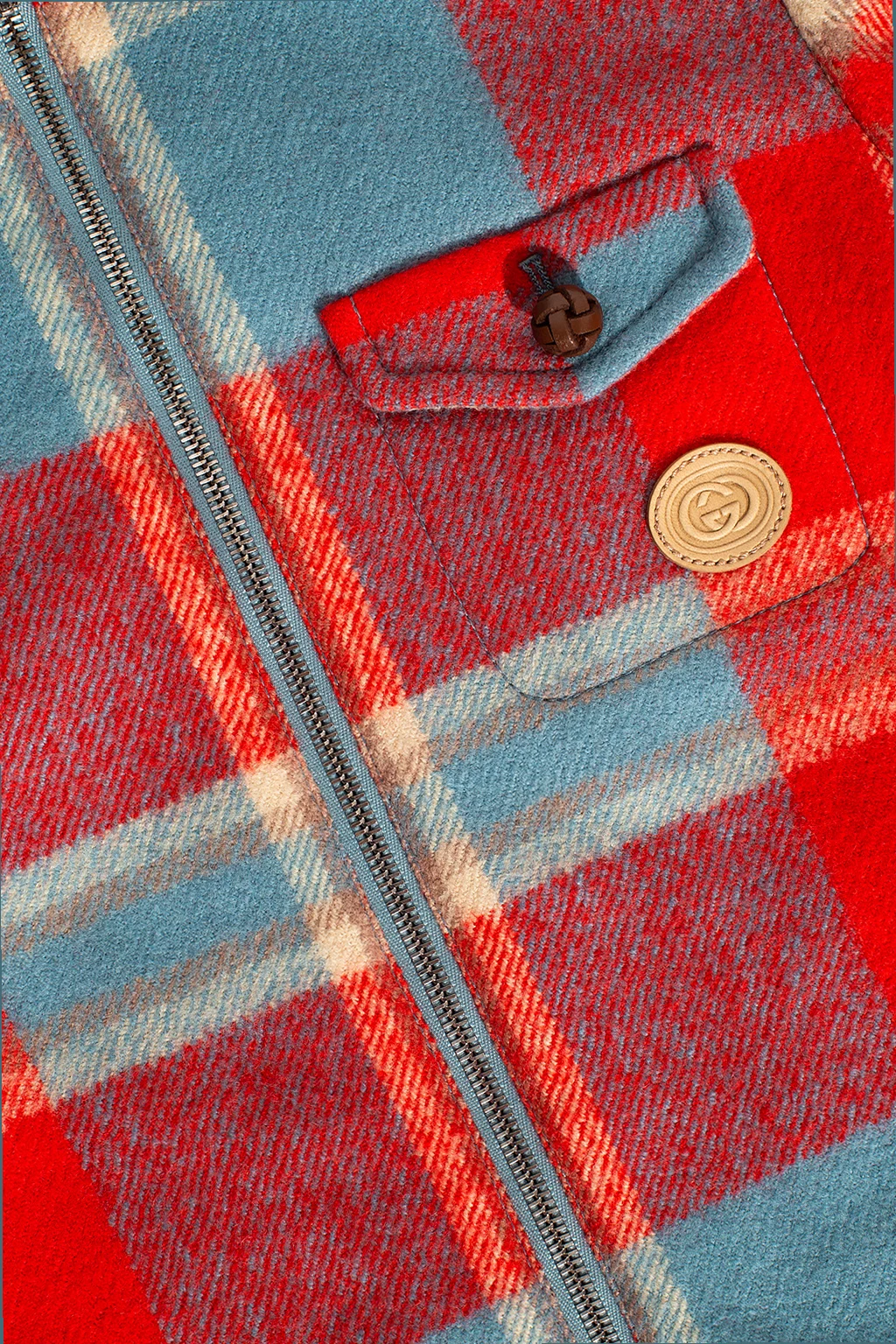Czerwono-niebiesko-beżowa, wełniana kurtka Gucci. Zapinana na zamek. Ozdobiona wzorem w kratę i naszywką z logo. Z przodu trzy kieszenie: jedna z patką zapinana na guzik. Długie rękawy, mankiety zapinane na guzik.