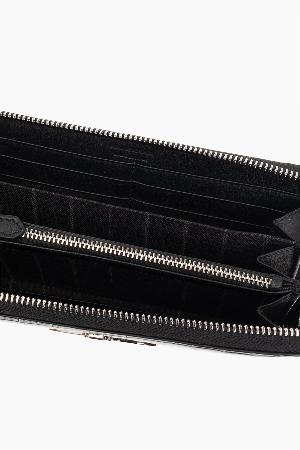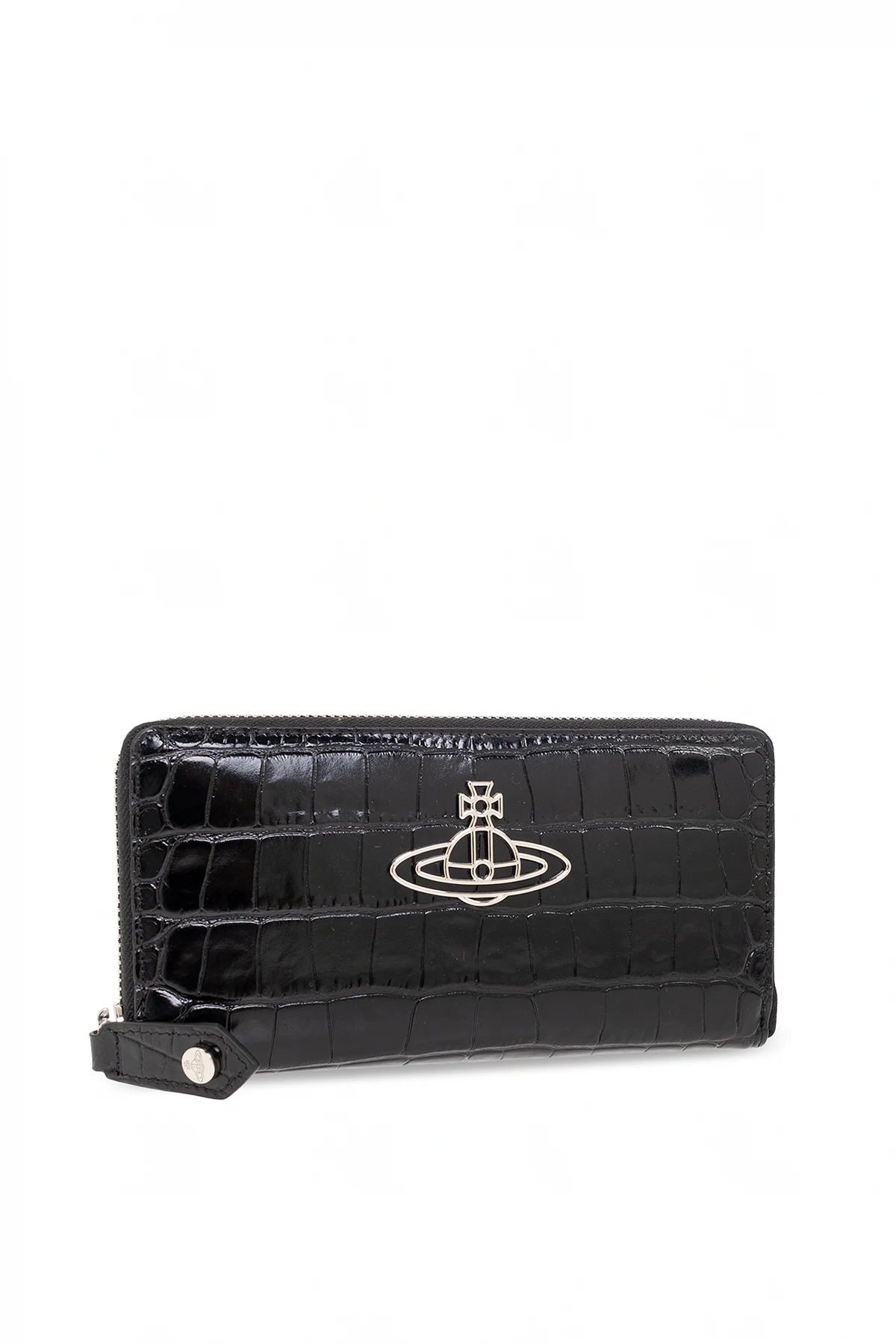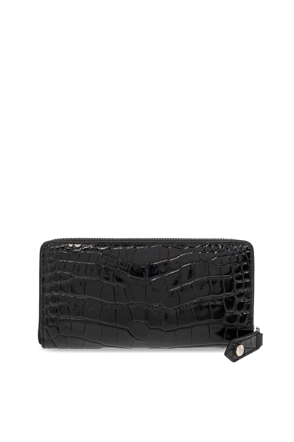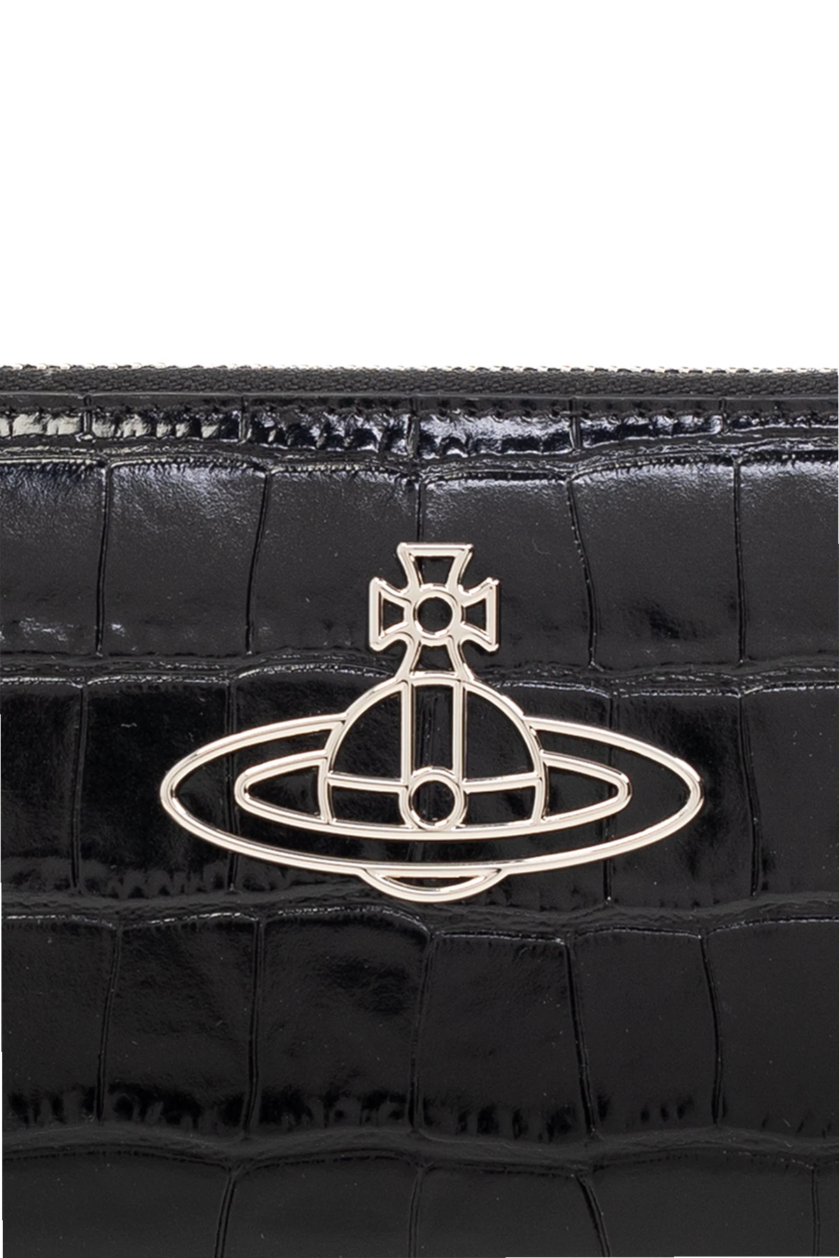 Czarny portfel Vivienne Westwood. Wykonany ze skóry cielęcej o fakturze imitującej skórę krokodyla. Zamykany na zamek. Z przodu ozdobiony metalową aplikacją w kształcie logo w kolorze srebrnym. Wnętrze wykonane z metalizowanej skóry w kolorze srebrnym z komorą z trzema przegrodami, kieszenią zamykaną na zamek oraz dwunastoma miejscami na karty.