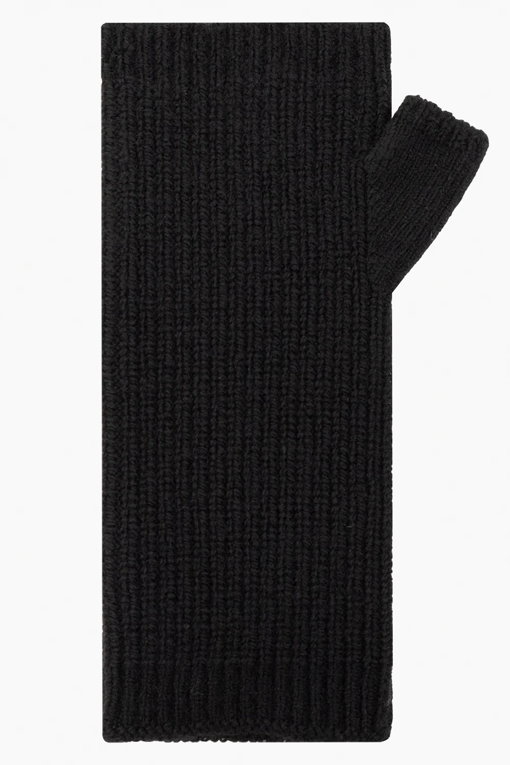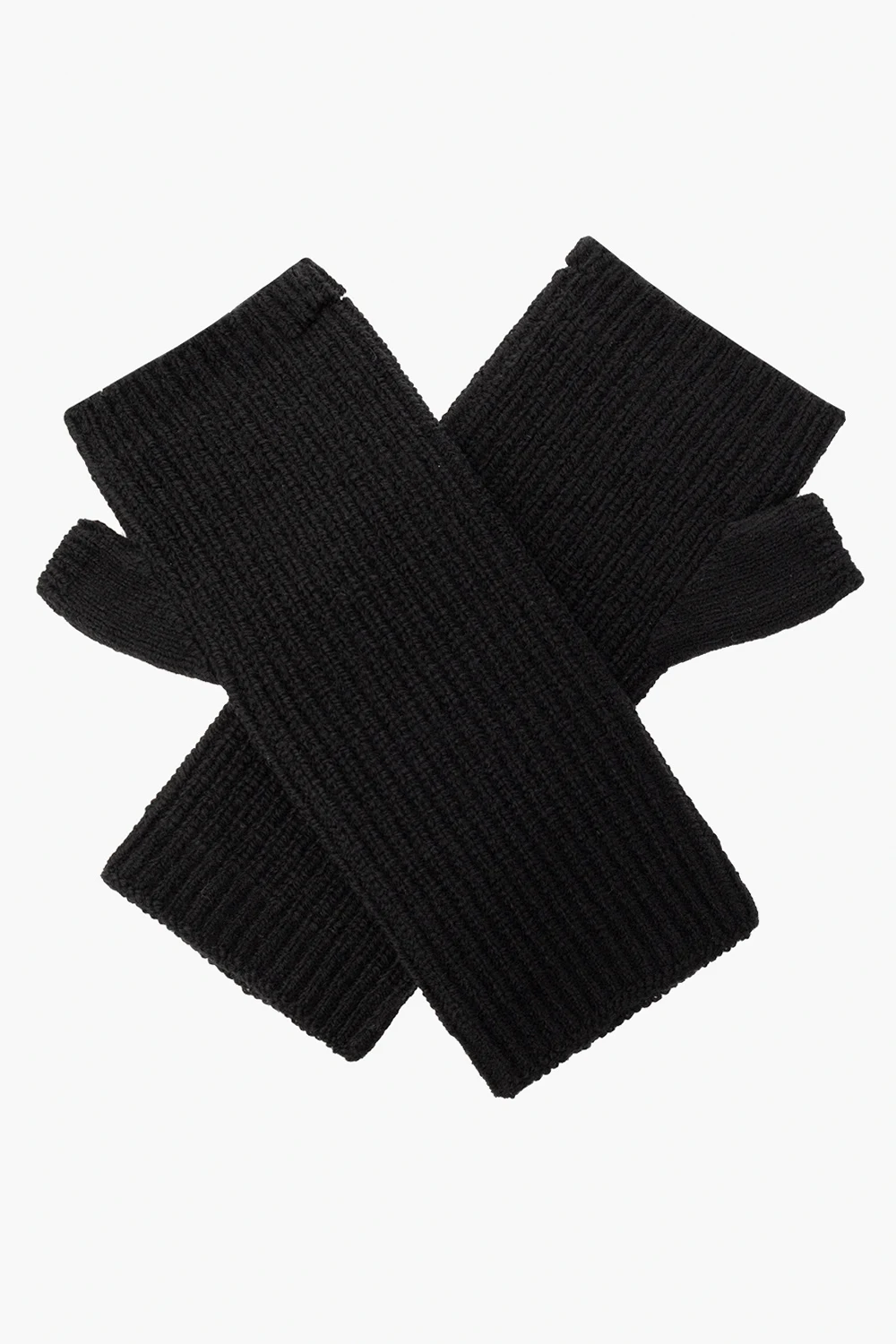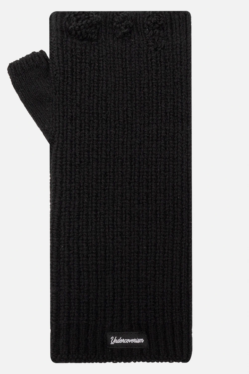 Czarne, prążkowane rękawiczki bez palców Undercover. Ozdobione naszywką z logo w kolorze białym. Wykończone ściągaczem. Efekt ‘vintage’.