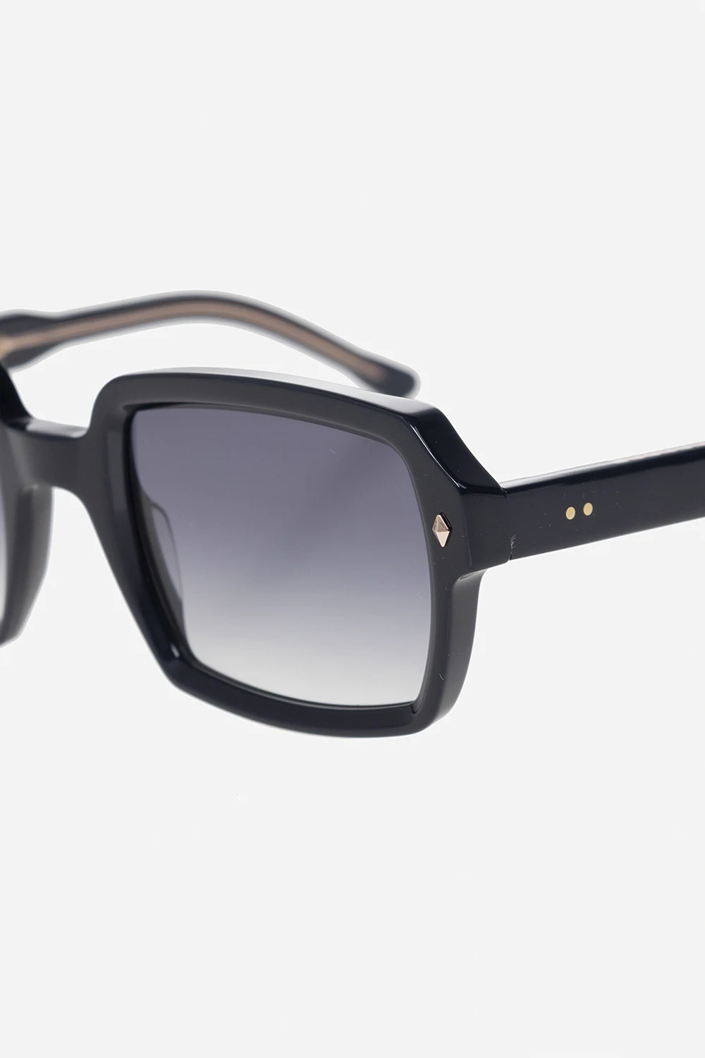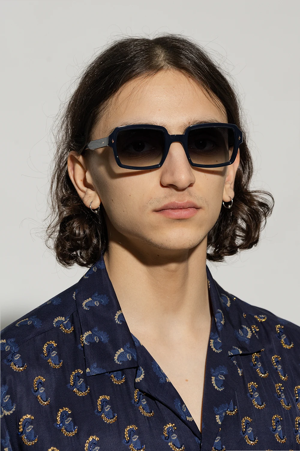 Granatowe okulary przeciwsłoneczne, model ‘Charlie’ John Dalia. Prostokątne oprawki typu ‘oversize’ wykonane z 6-milimetrowej płyty octanowej. Aplikacje z przodu i na zausznikach pokryte różowym złotem. Niebieskie, gradientowe soczewki ze 100% ochroną przed promieniami UVA/UVB. Dołączone etui.