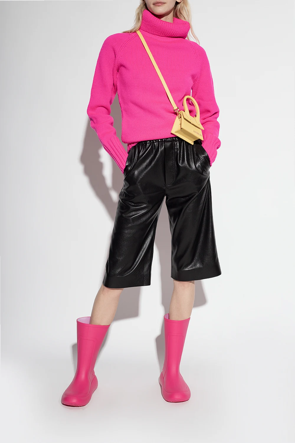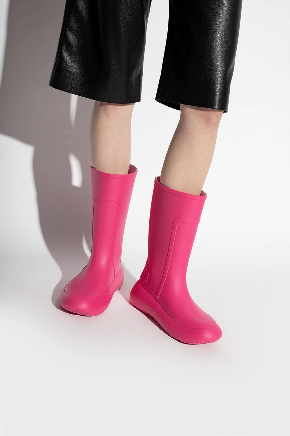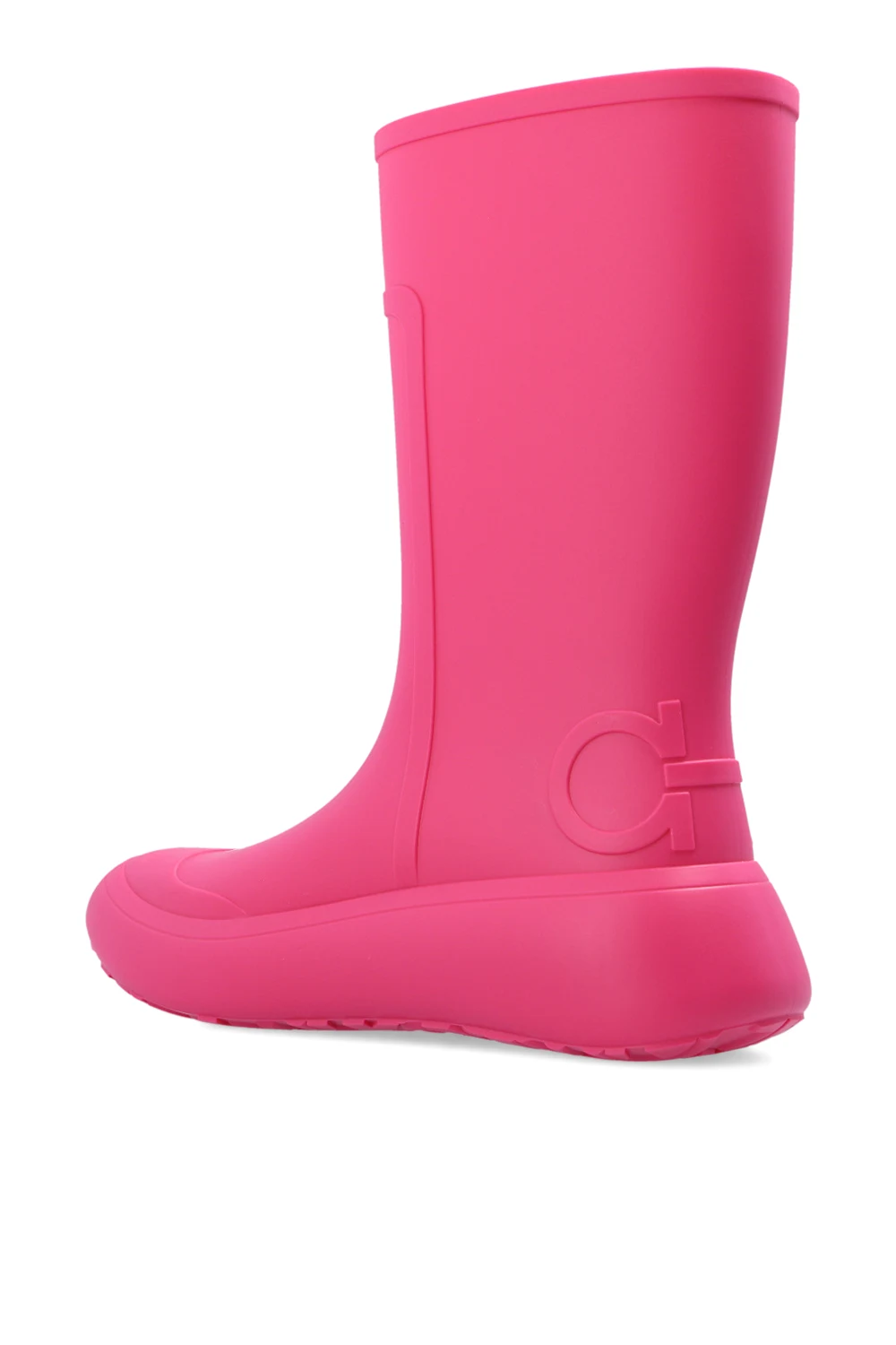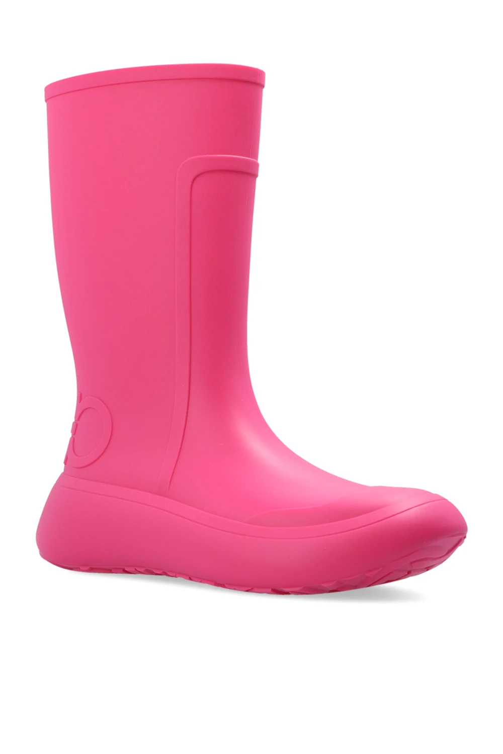 Różowe, gumowe kalosze, model ‘Rainboot’ Salvatore Ferragamo. Ozdobiony wypukłym logo.