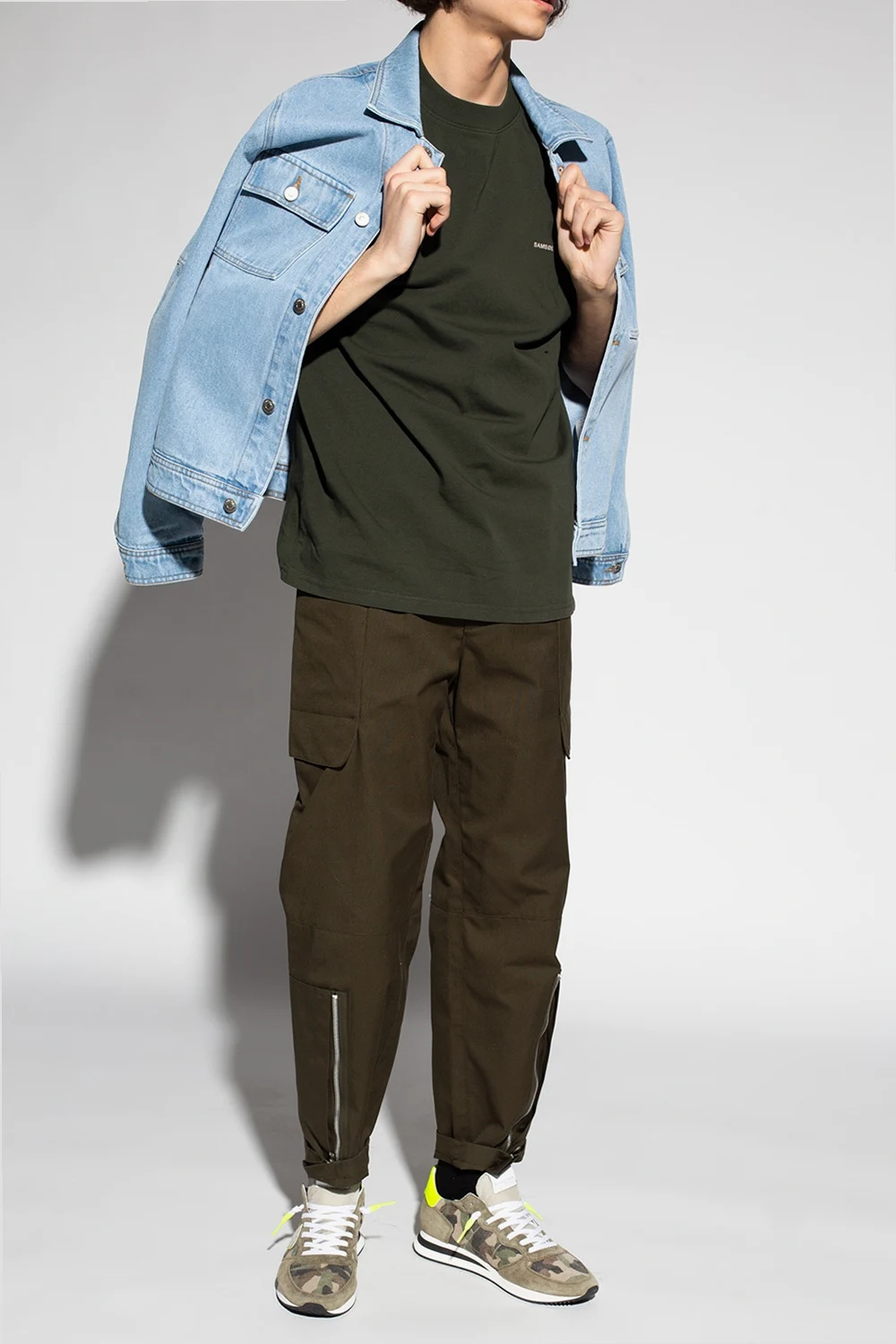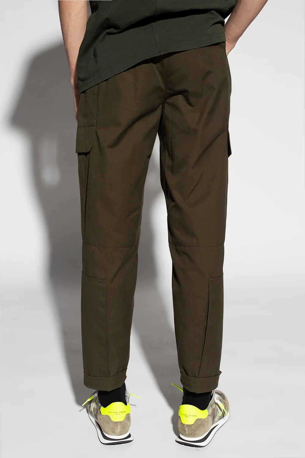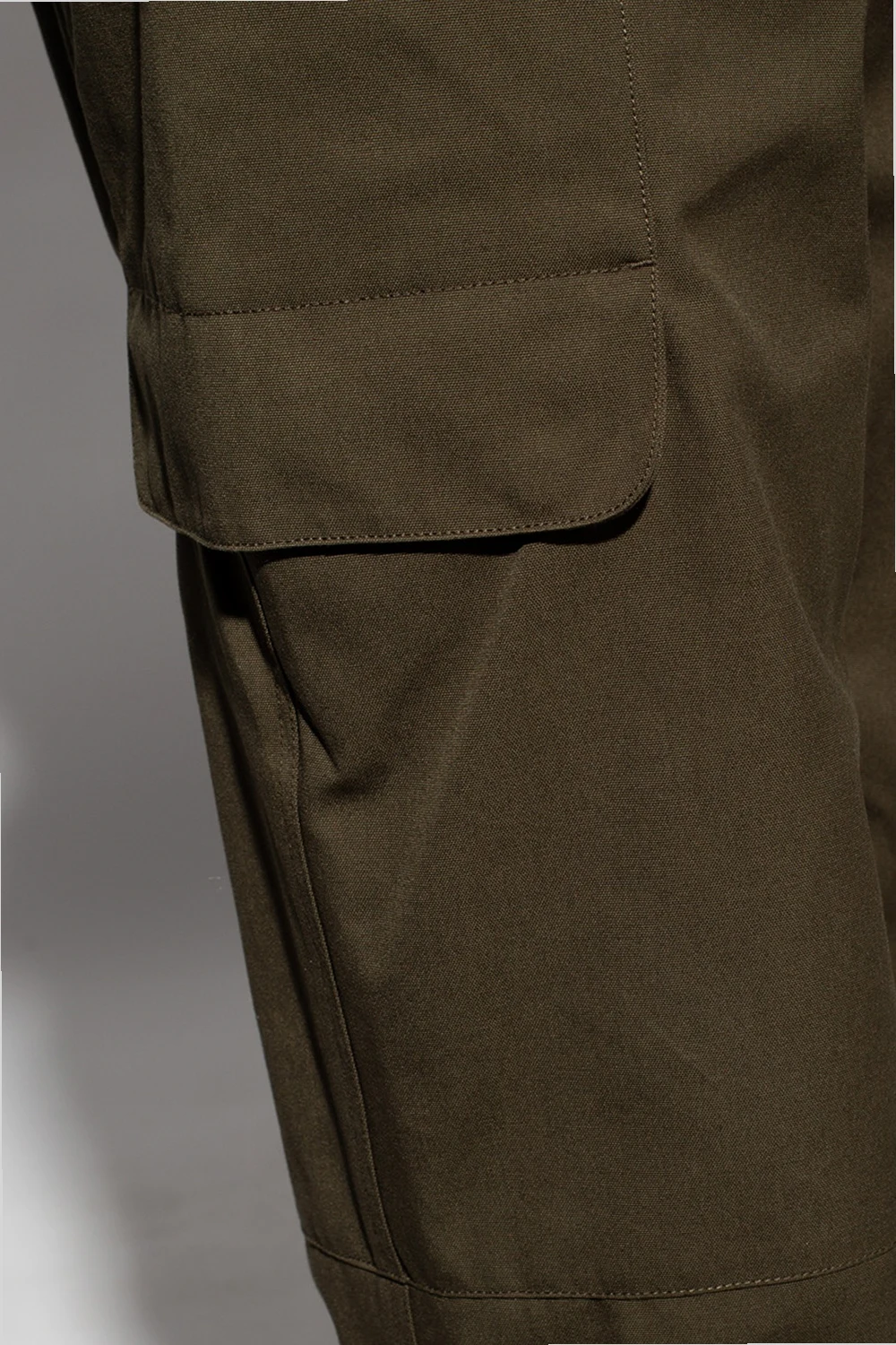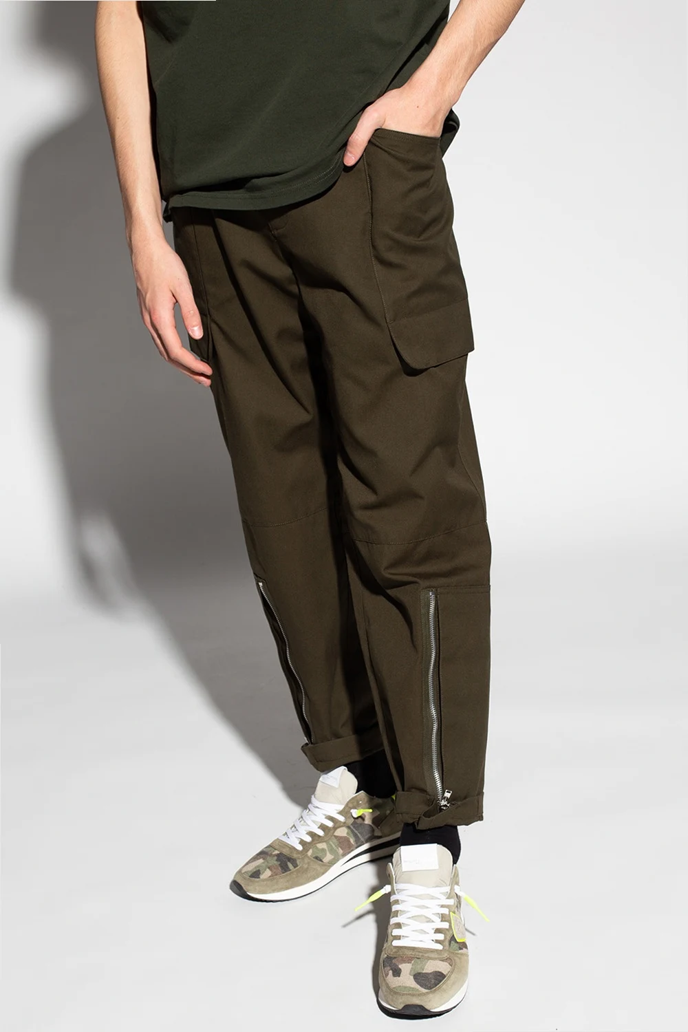Ciemnozielone spodnie Helmut Lang. Wykończone bawełną. Zapinane na zamek oraz guzik. Cztery wsuwane kieszenie. U dołu wszyte zamki w kolorze srebrnym.