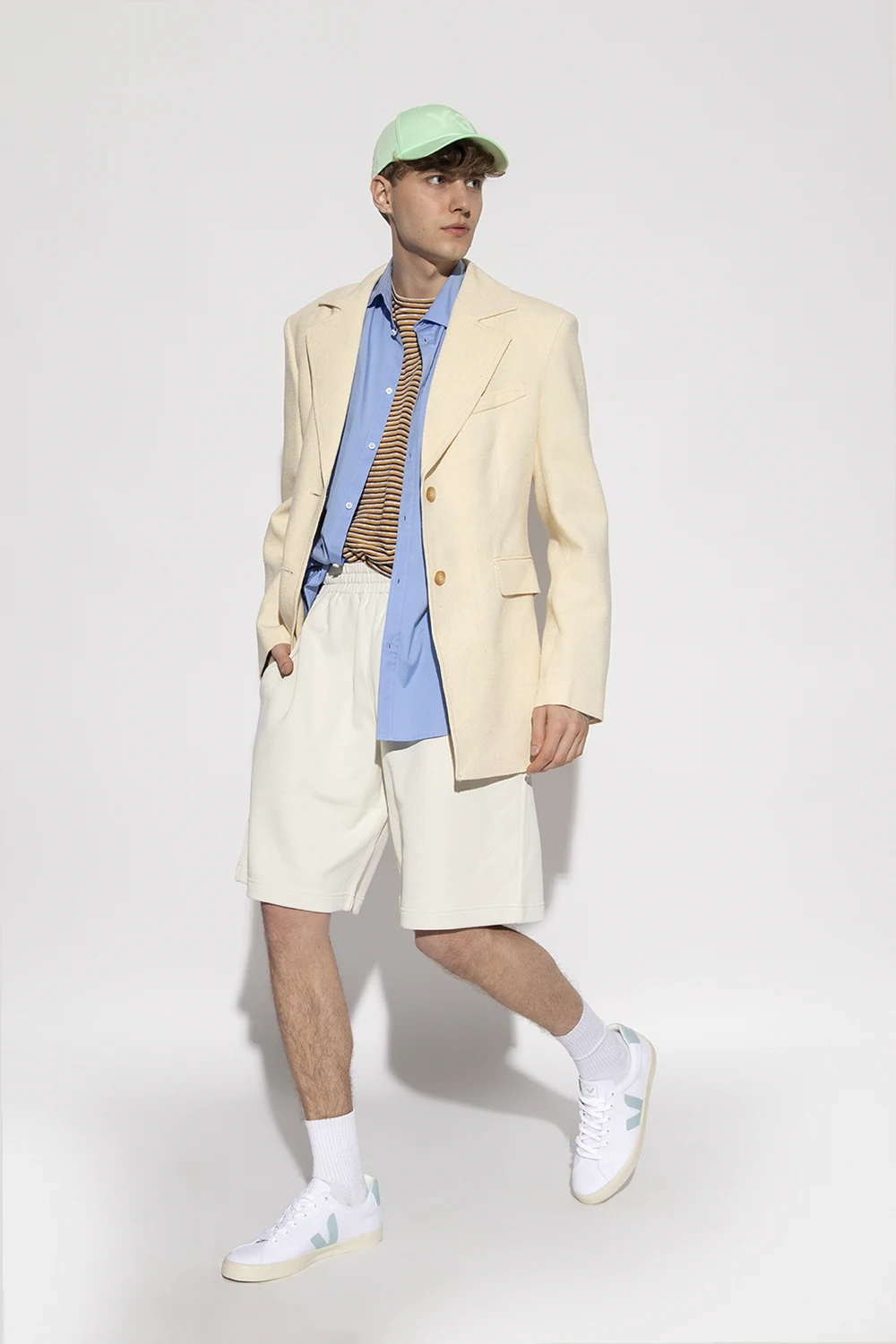 Biało-jasnozielone, sznurowane buty sportowe, model Esplar SE’ Veja. Wykonane z organicznej bawełny. Naszywka z logo w kolorze jasnozielonym wykonana z gumy oraz odpadów ryżowych. Wkładka wykonana z trzciny cukrowej, gumy Amazon, bawełny organicznej i pochodzącej z recyklingu pianki EVA. Kremowa, gumowa podeszwa wykonana z materiałów organicznych oraz pochodzących z recyklingu.