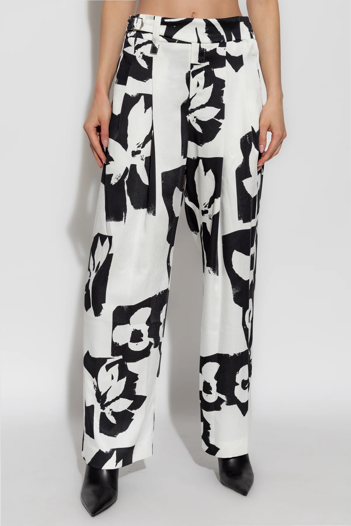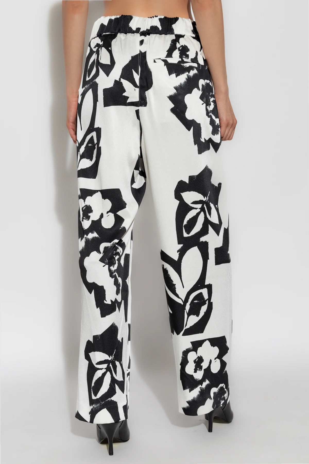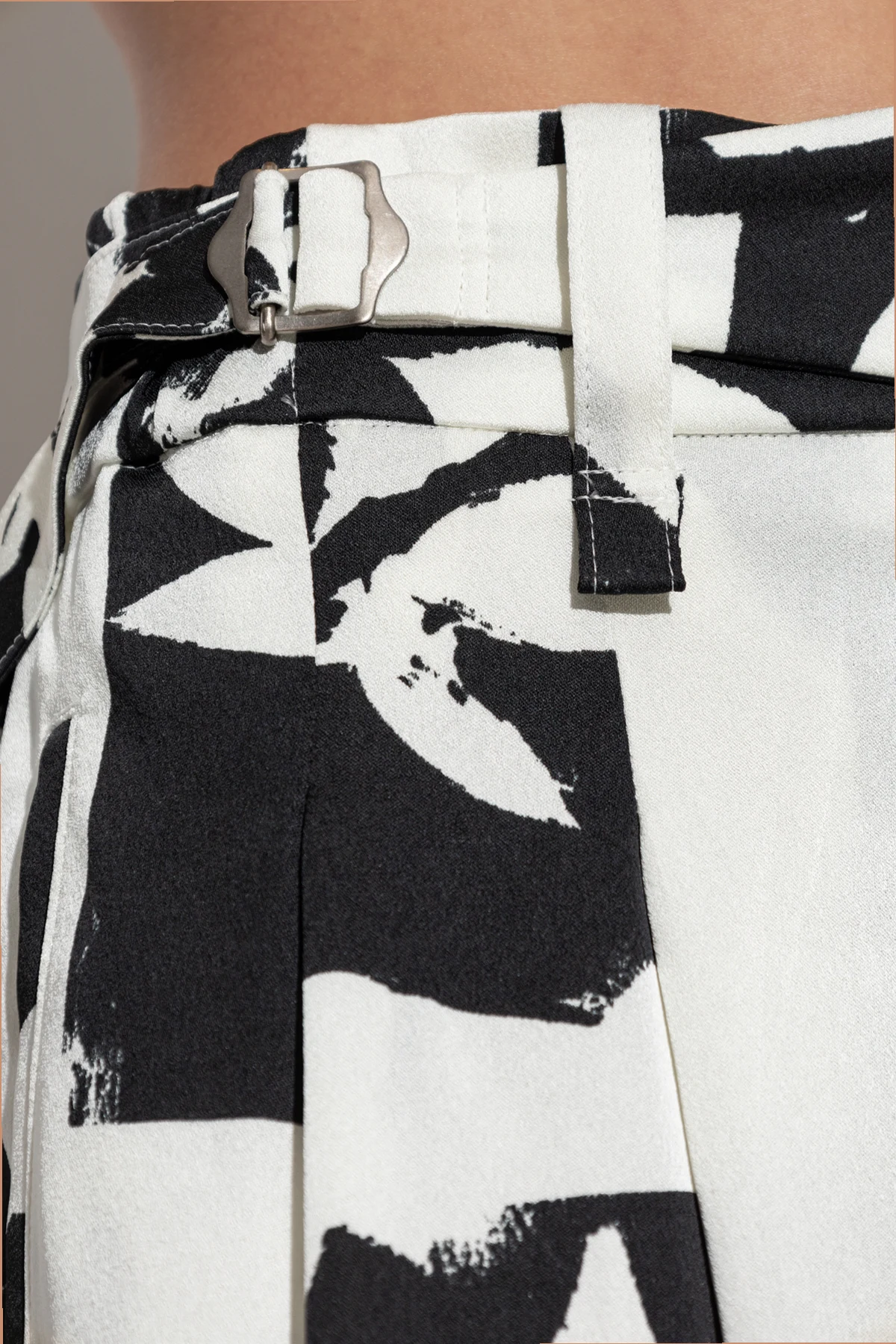 Wykonane z lekkiego i przewiewnego materiału, spodnie te są idealne na cieplejsze dni lub do noszenia w pomieszczeniach. Dominujący biały kolor został wzbogacony dużymi, abstrakcyjnymi czarnymi nadrukami, które nadają całości unikalny i artystyczny charakter.