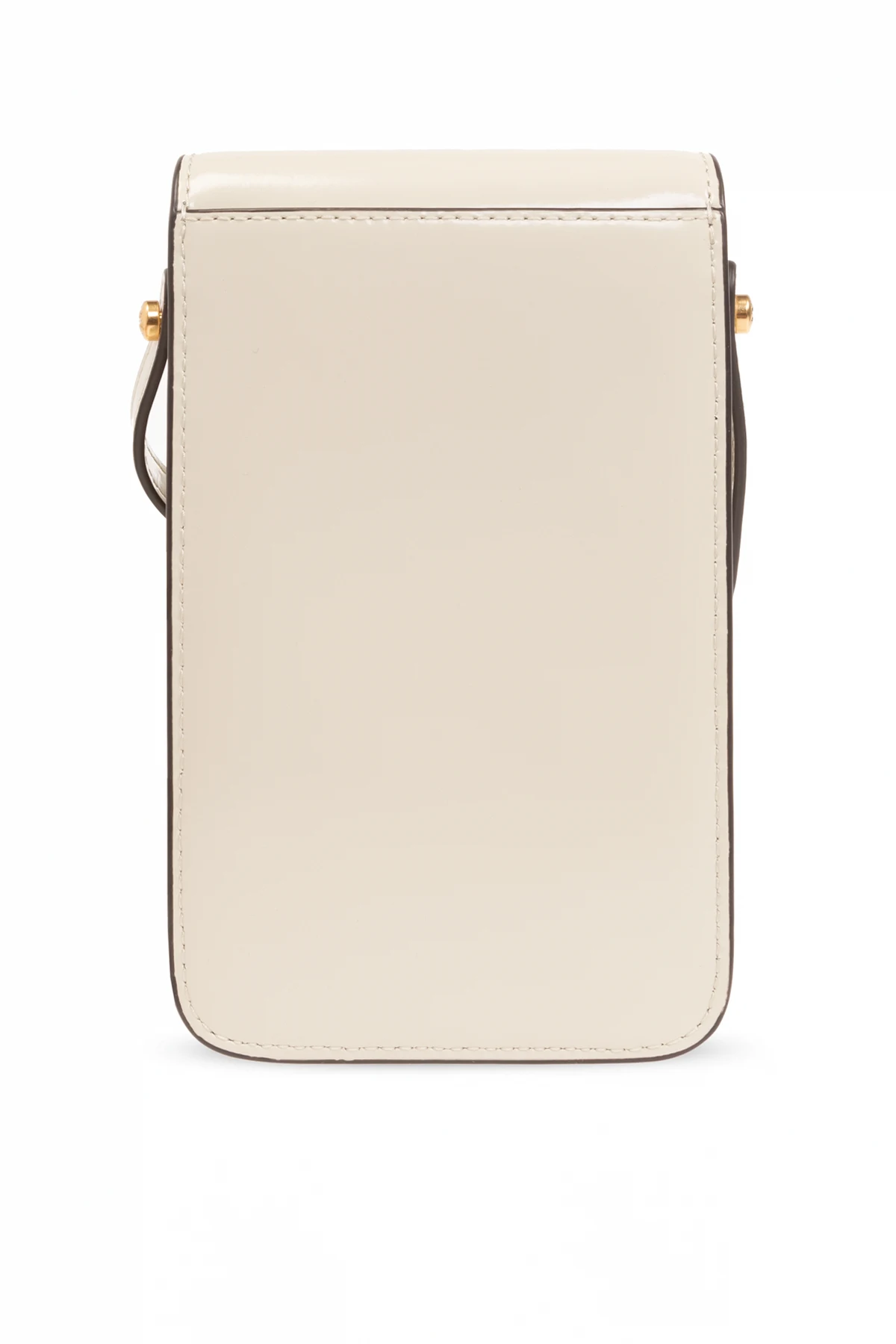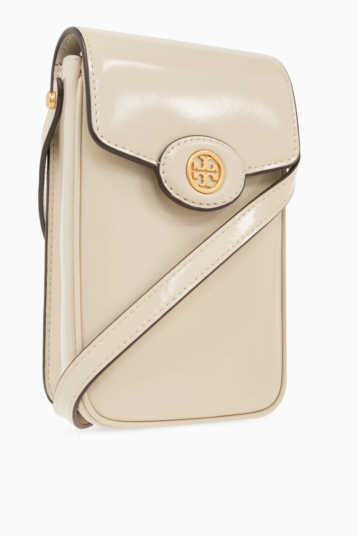 Kremowe etui na telefon na pasku, model ‘Robinson’ Tory Burch. Wykonany z polerowanej skóry. Magnetyczne zamknięcie ozdobione metalową aplikacją w kształcie logo. Z tyłu wsuwana kieszeń. Regulowany pas na ramię. Wewnątrz komora z dwoma miejscami na karty. Metalowe wykończenie w kolorze złotym.