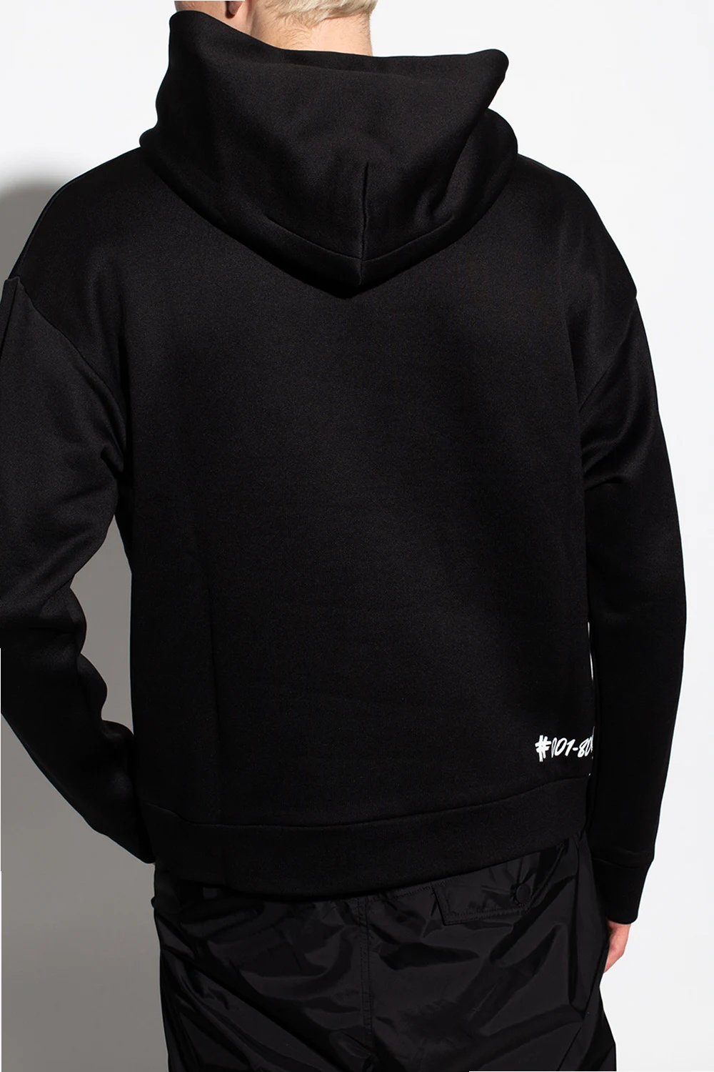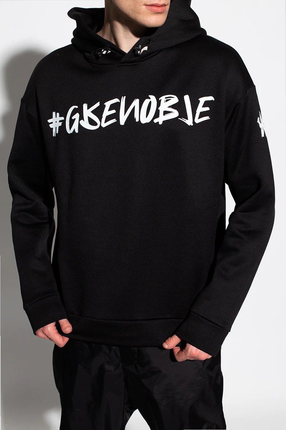 Czarna bluza Moncler Grenoble. Kaptur ściągany trokami. Ozdobiona nadrukowanym logo w kolorze białym. Rękawy oraz dół zakończone ściągaczem.