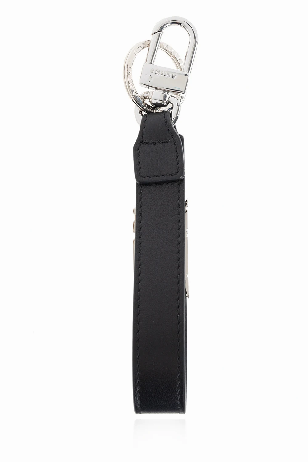 Czarny brelok na klucze Amiri. Wykonany z bydlęcej skóry. Ozdobiony metalową aplikacją z logo. Zakończony karabińczykiem. Metalowe elementy w kolorze srebrnym.