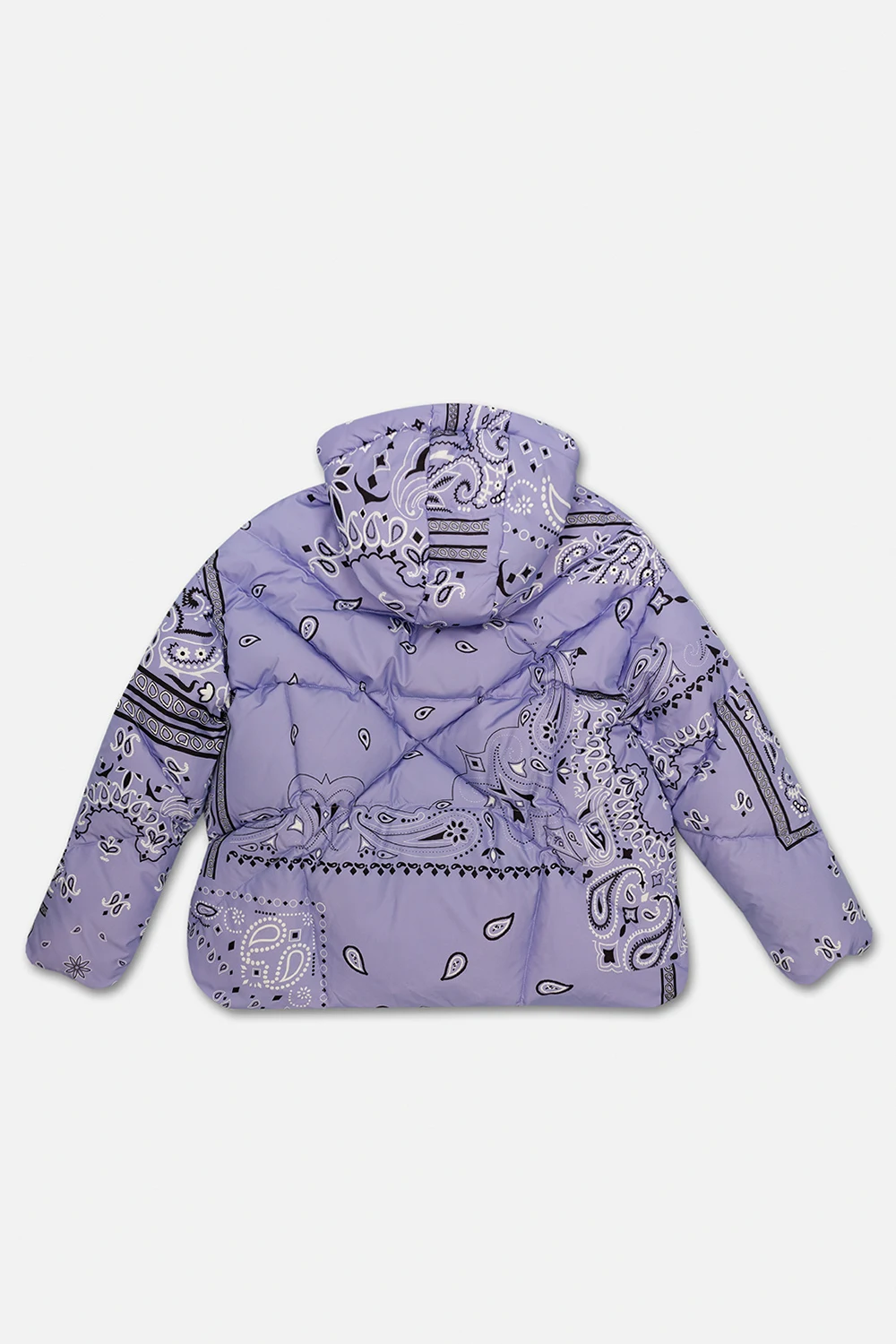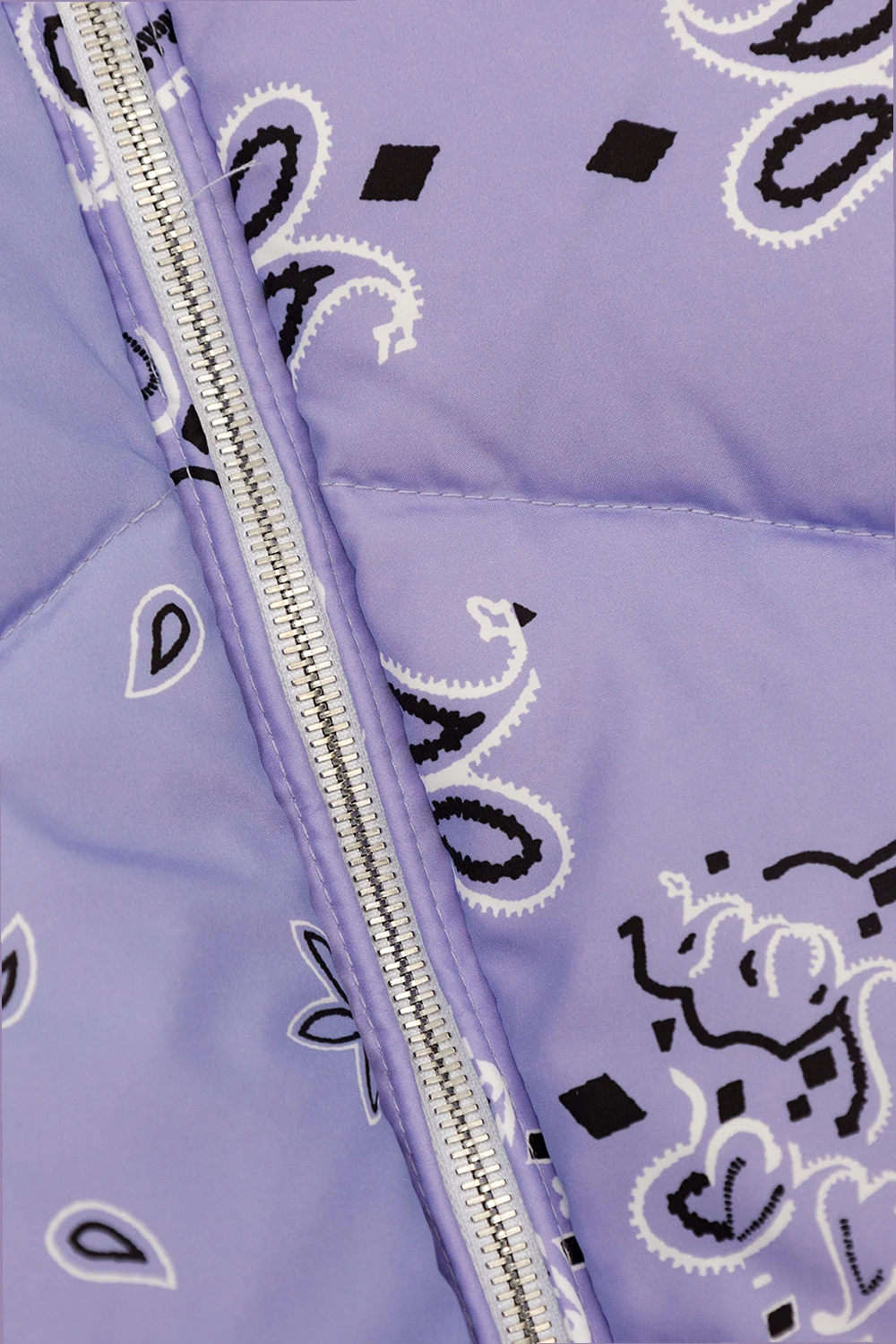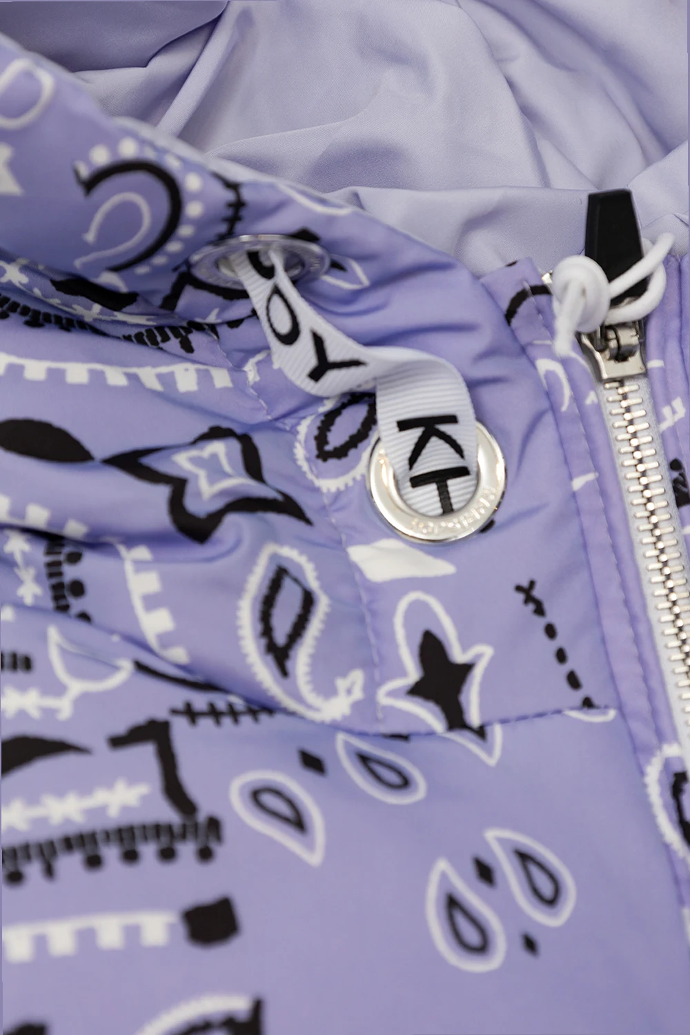 Jasnofioletowa, puchowa kurtka Khrisjoy Kids. Zapinana na zamek. Ozdobiona czarno-białym nadrukiem. Kaptur ściągany białymi trokami z nadrukowanym czarnym logo. Z przodu dwie kieszenie. Długie rękawy z wszytym zamkiem. Dół ściągany trokami.