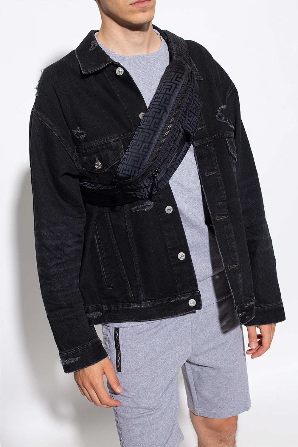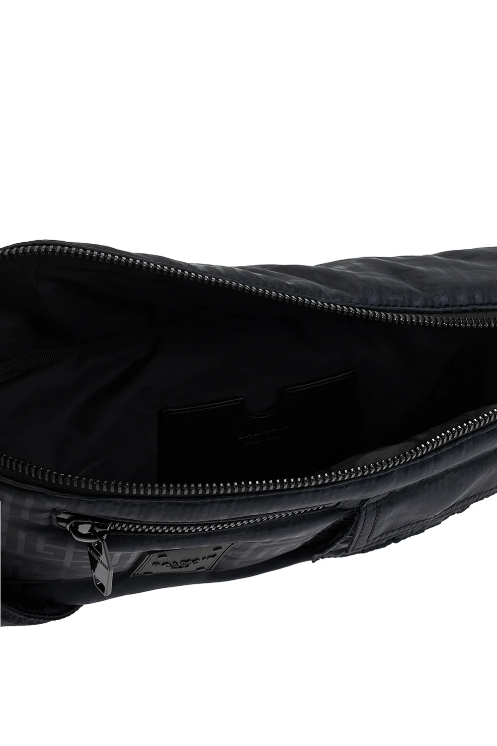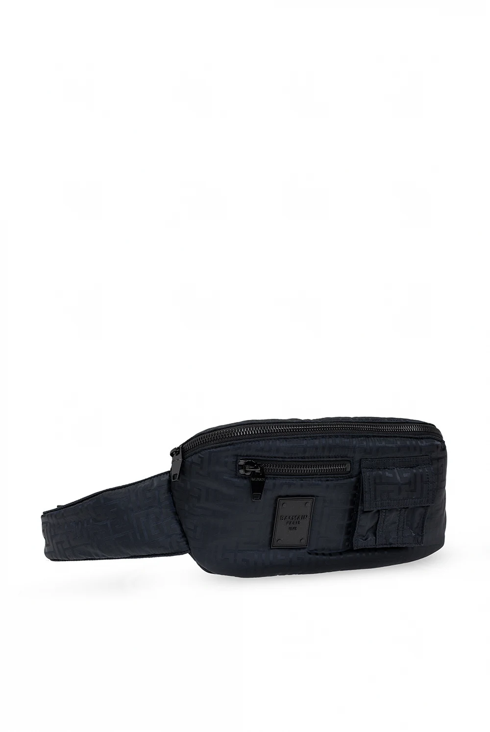 Czarna torba na pas Balmain. Zamykana na zamek. Ozdobiona wyszytym wzorem z logo. Z przodu aplikacja, kieszeń zamykana na zamek i kieszeń z patką zapinana na zatrzask. Regulowany pas. Wewnątrz komora i miejsce na kartę. Metalowe elementy w kolorze czarnym.
