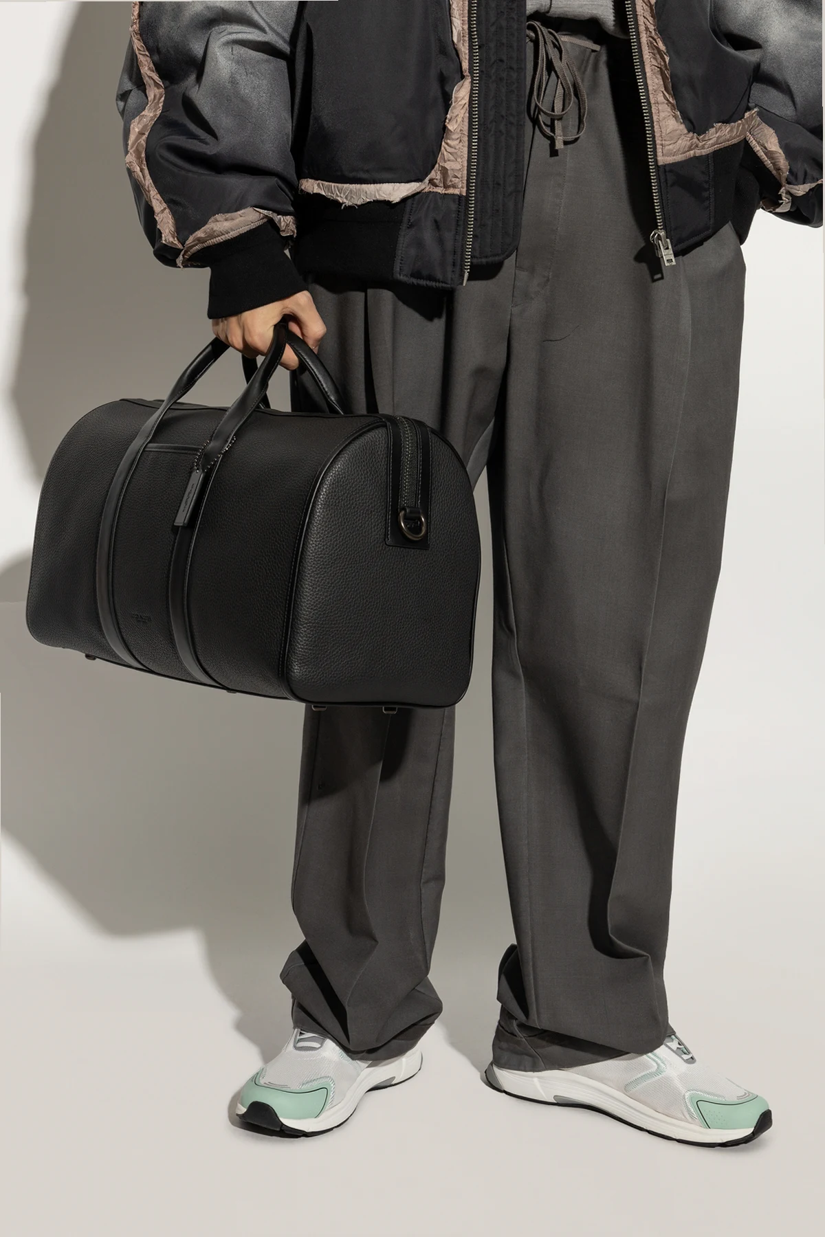 Dyskretny napis lub logo projektanta na przodzie torby podkreśla jej ekskluzywny charakter. Metalowe zamki błyskawiczne oraz solidne przeszycia dodają jej trwałości i elegancji, czyniąc ją idealnym wyborem na krótkie podróże lub jako stylowy dodatek do codziennego ubioru.