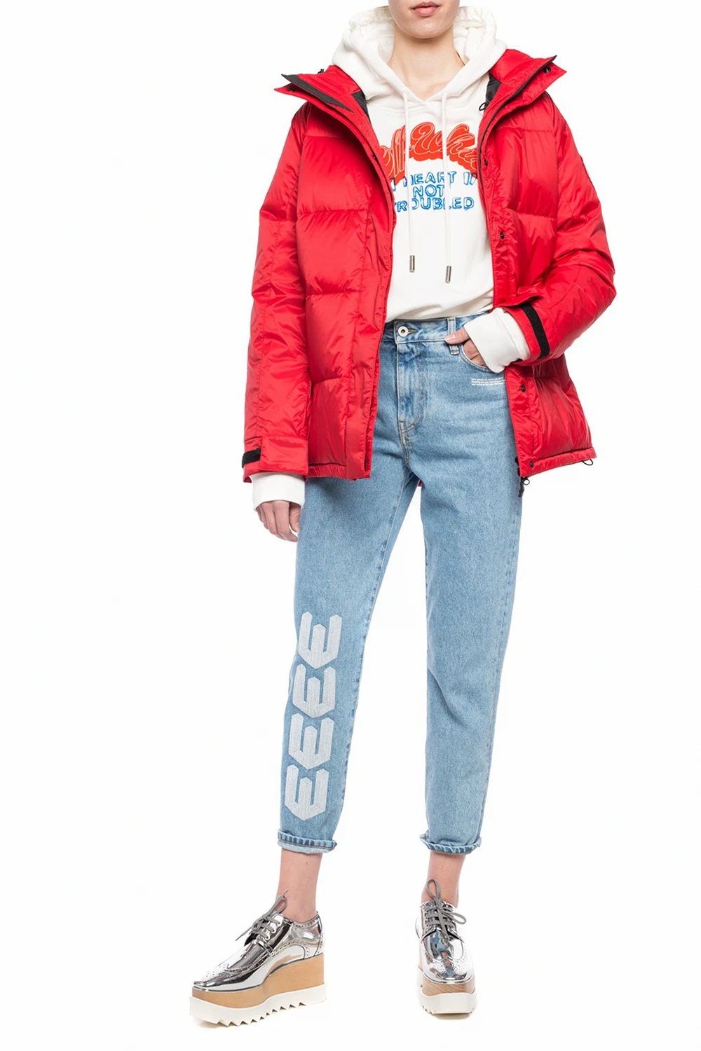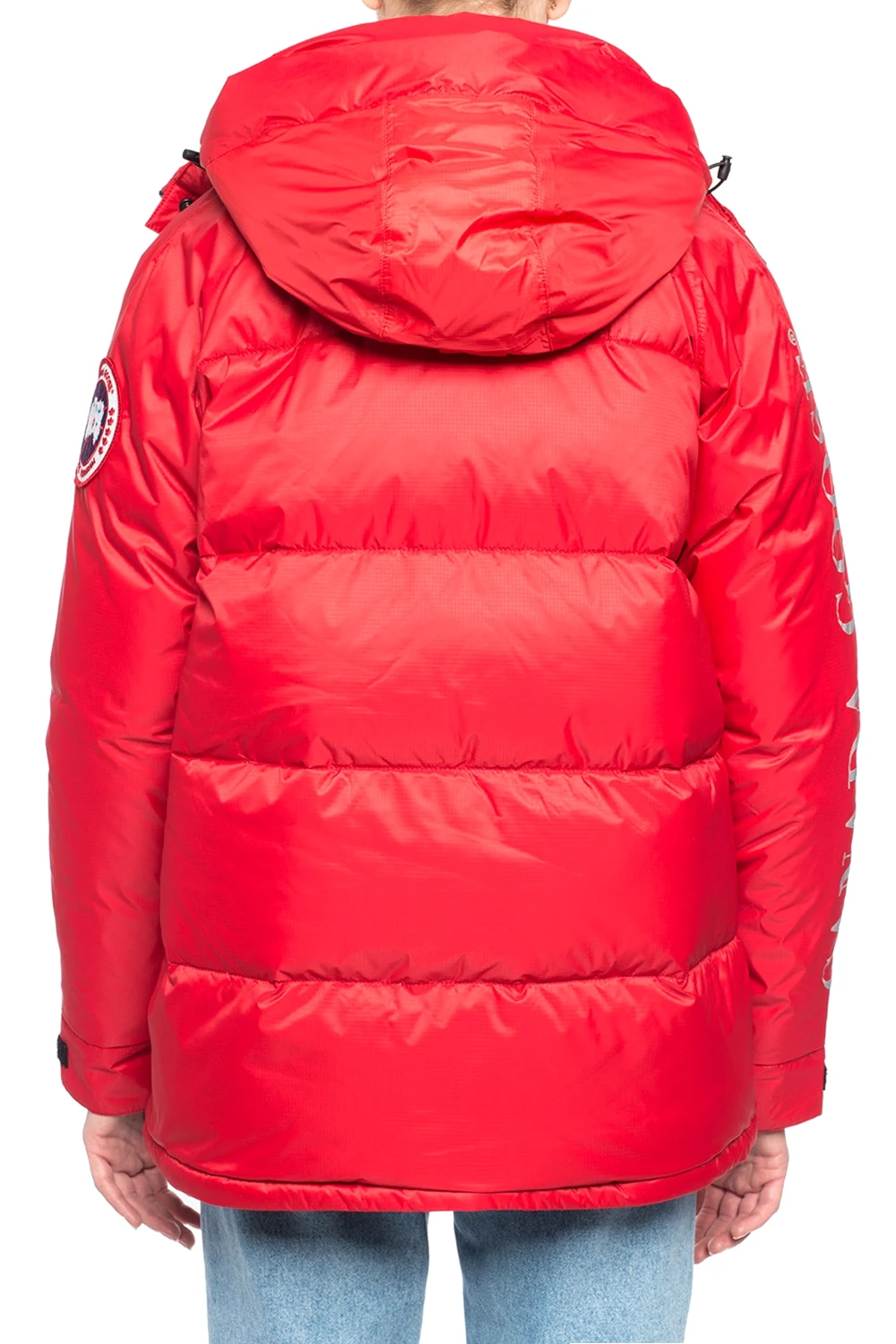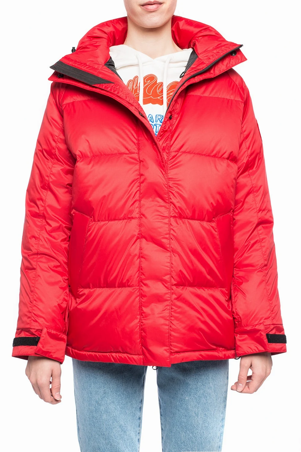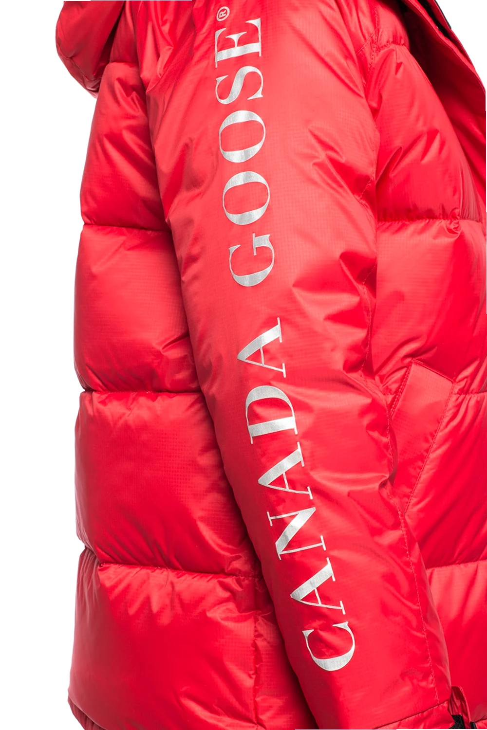 Czerwona pikowana kurtka puchowa, model 'Approach' Canada Goose. Wykonana z nieprzemakalnego materiału. Zapinana na zamek i zatrzaski. Ozdobiona czerwono-biało-niebieską naszywką oraz nadrukiem z logo w kolorze srebrnym. Z przodu dwie kieszenie zamykane na zatrzaski. Odpinany kaptur i dół ściągane trokami. Rękawy regulowane na rzep.