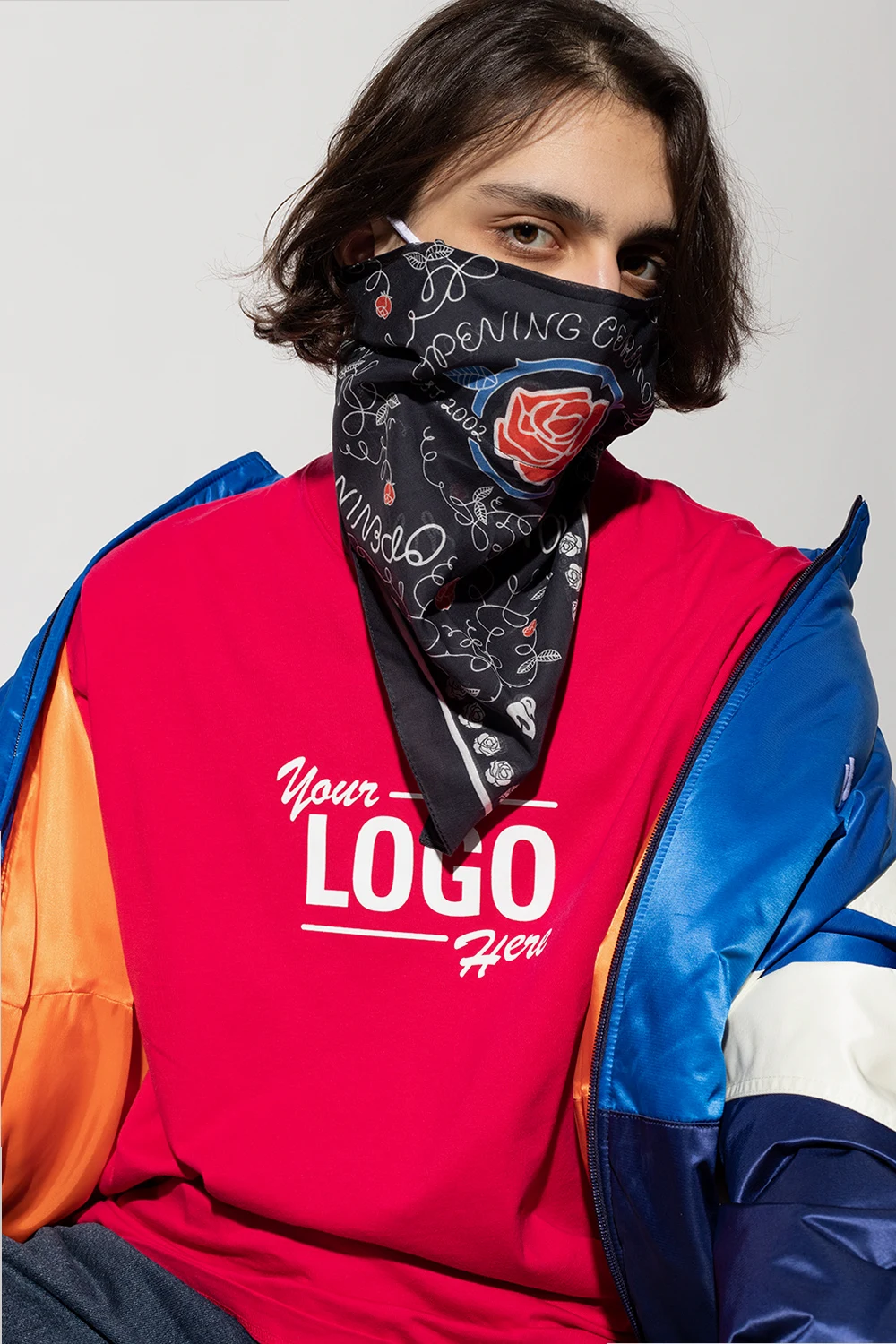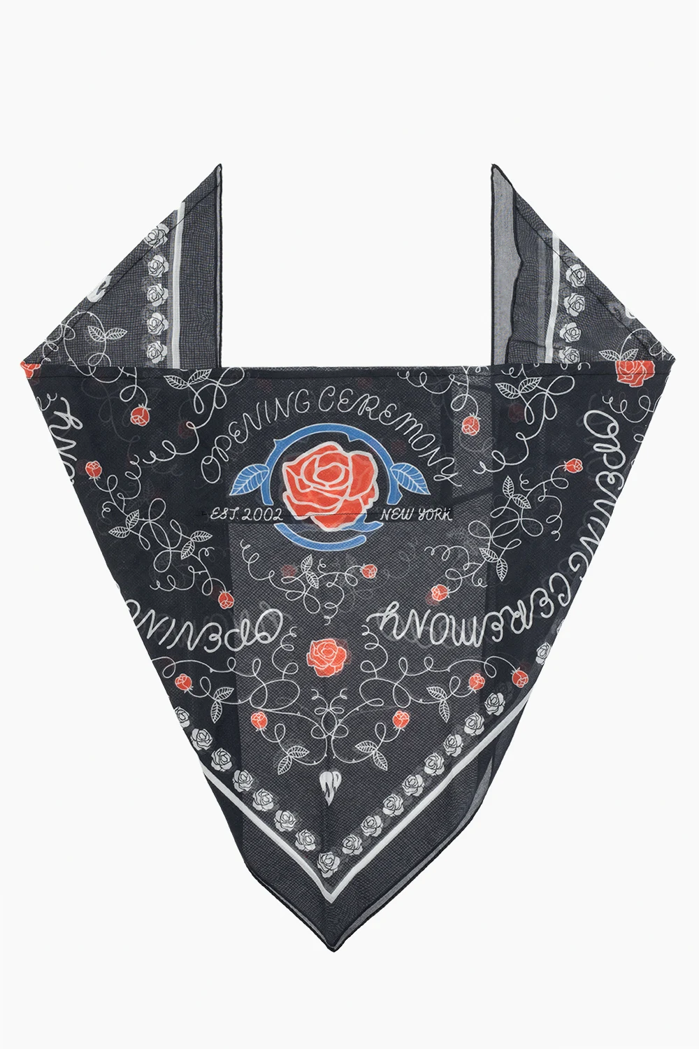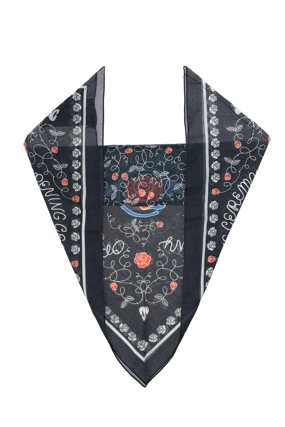 Czarna maska w formie chusty Opening Ceremony. Wykonana z bawełny. Wewnątrz gumki w kolorze białym. Możliwość związania z tyłu głowy. Nadrukowany wzór z logo.