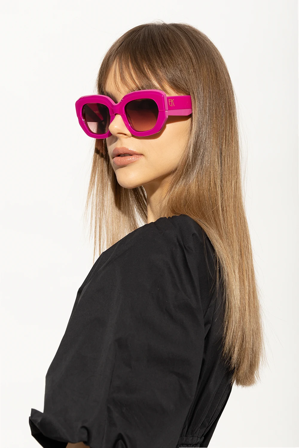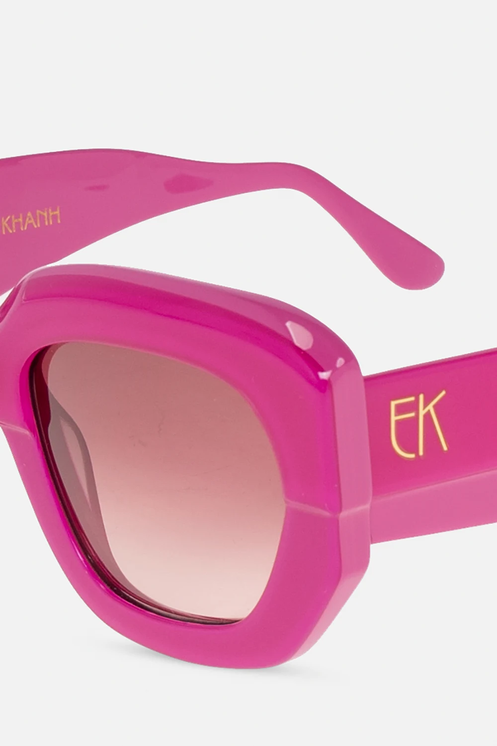 Różowe okulary przeciwsłoneczne, model ‘EK 8061’ Emmanuelle Khanh. Zauszniki ozdobione logo w kolorze złotym. Różowe, gradientowe szkła ze 100% ochroną przed promieniowaniem UV. Ręcznie wykonane we Francji. Dołączone etui w losowo wybranym kolorze.