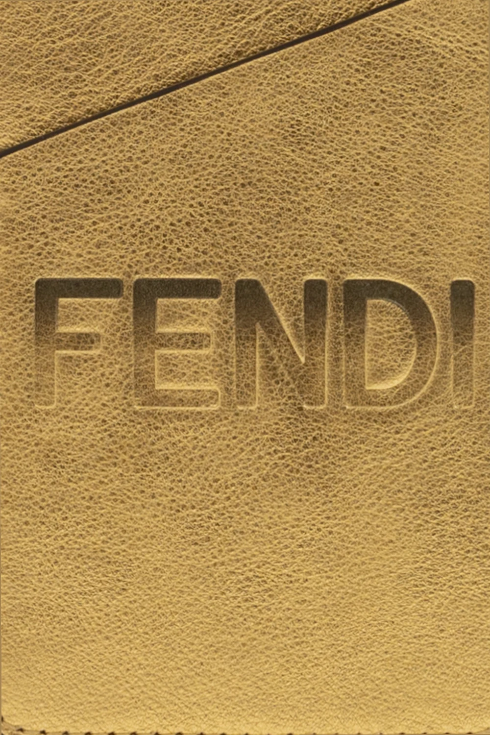 Etui na iPhone 13/13 Pro w kolorze złotym Fendi. Wykonane ze skóry cielęcej o metalicznym połysku. Ozdobione metalową aplikacją. Wsuwana, asymetryczna kieszeń z wytłoczonym logo z efektem gradientu.
