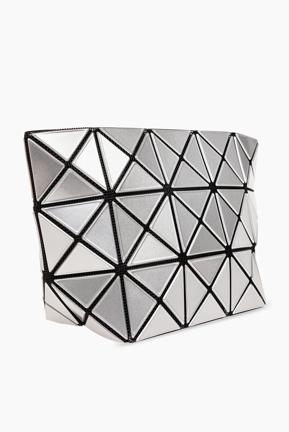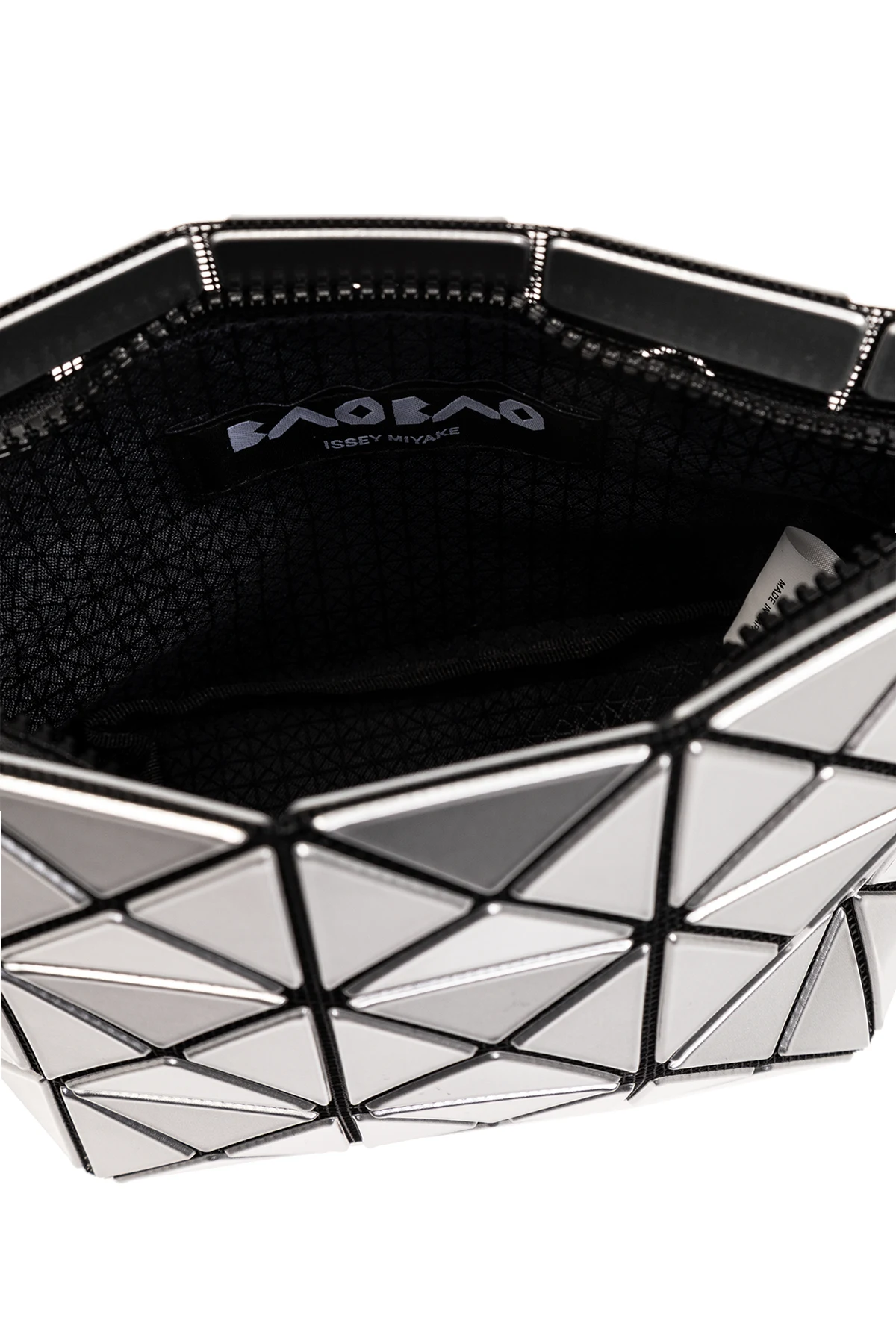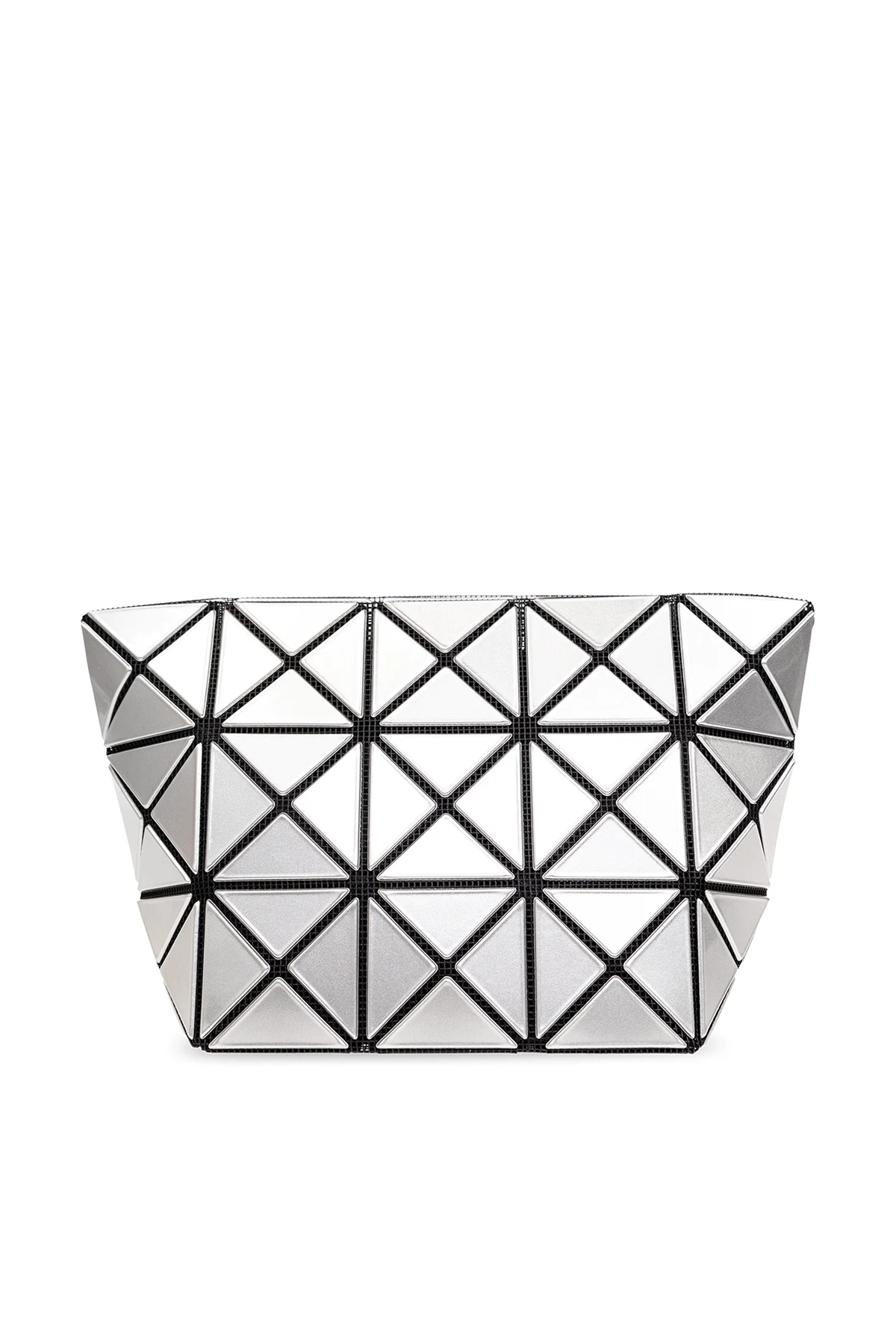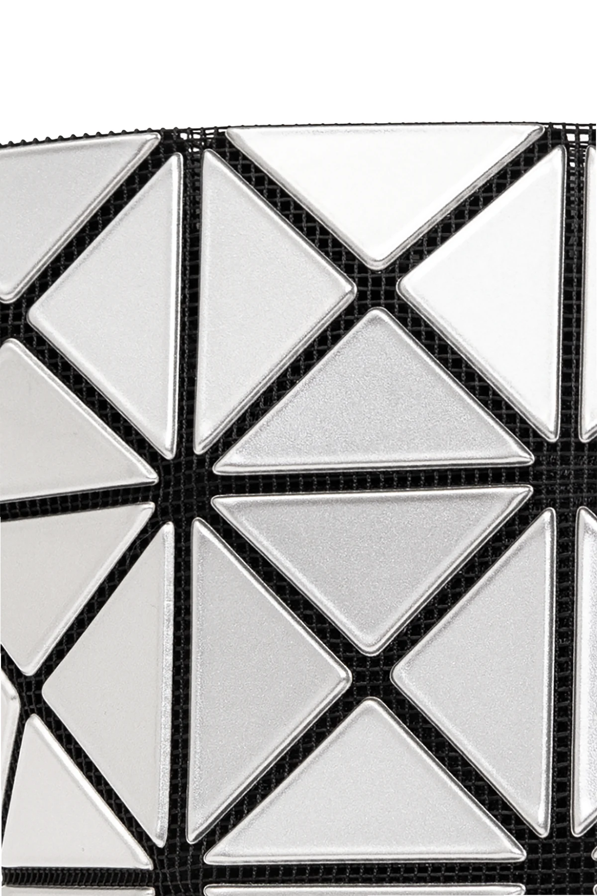 Saszetka w kolorze srebrno-czarnym, model ‘Prism’ Issey Miyake Bao Bao. Wykonana z materiału całkowicie pokrytego gumowymi aplikacjami układającymi się w geometryczny wzór o metalicznym wykończeniu. Zamykana na zamek. Wewnątrz komora.
