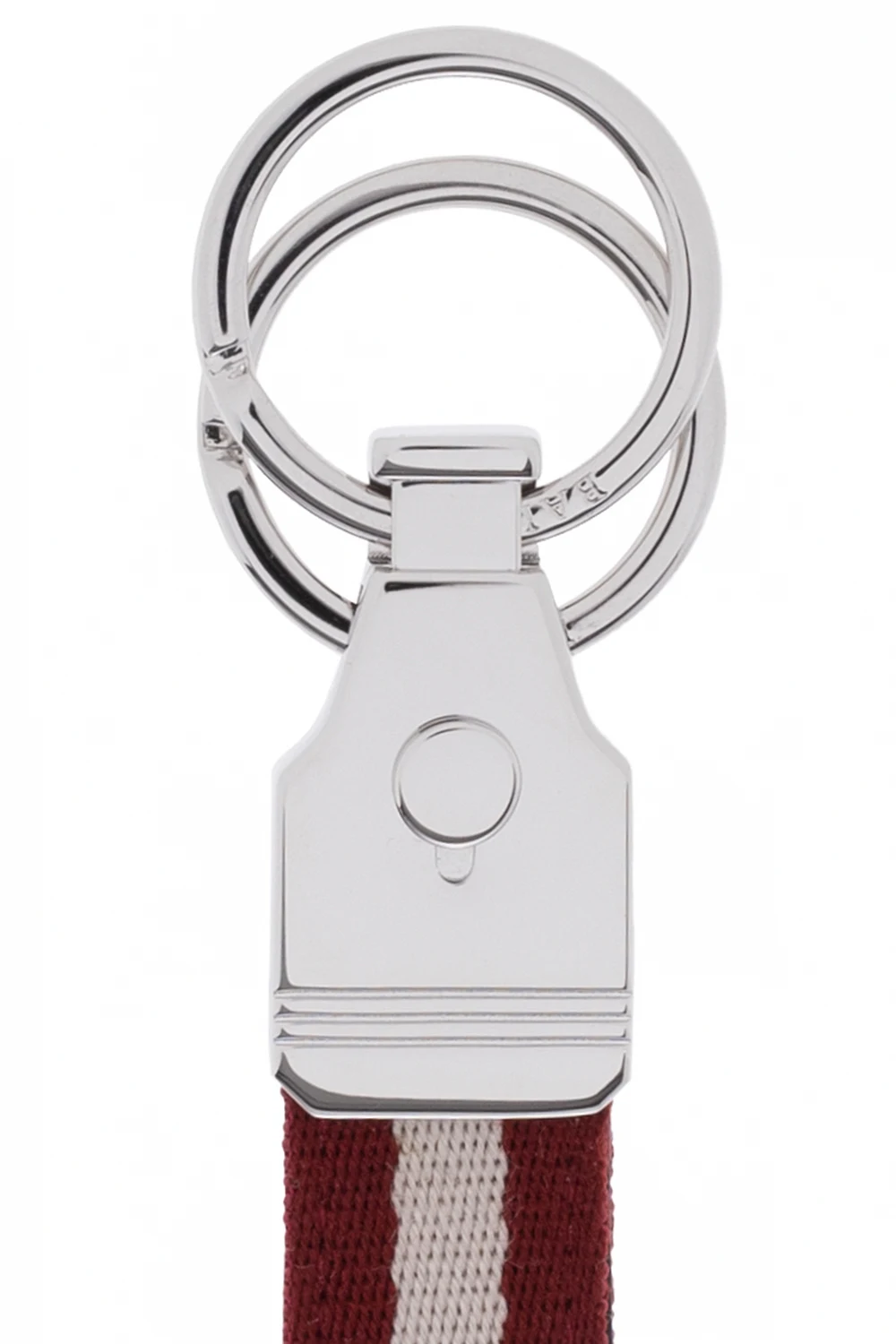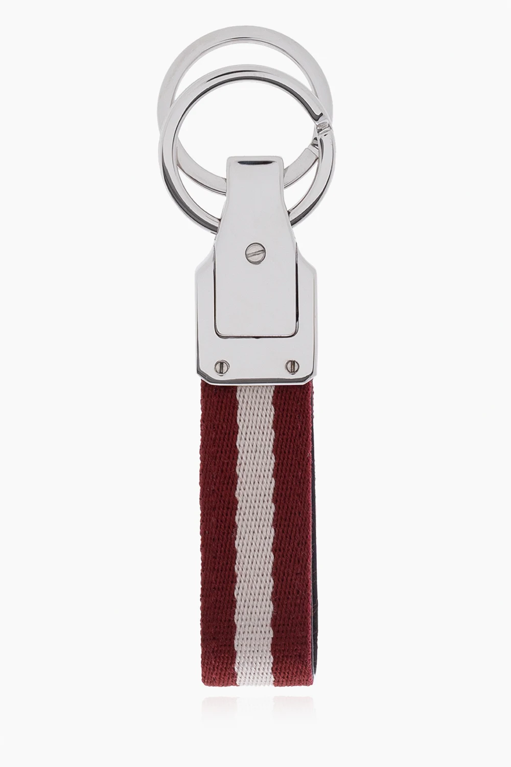 Bordowo-kremowy, podwójny brelok w kolorze srebrnym Bally. Wykonany ze skóry i materiału. Ozdobiony wytłoczonym logo.