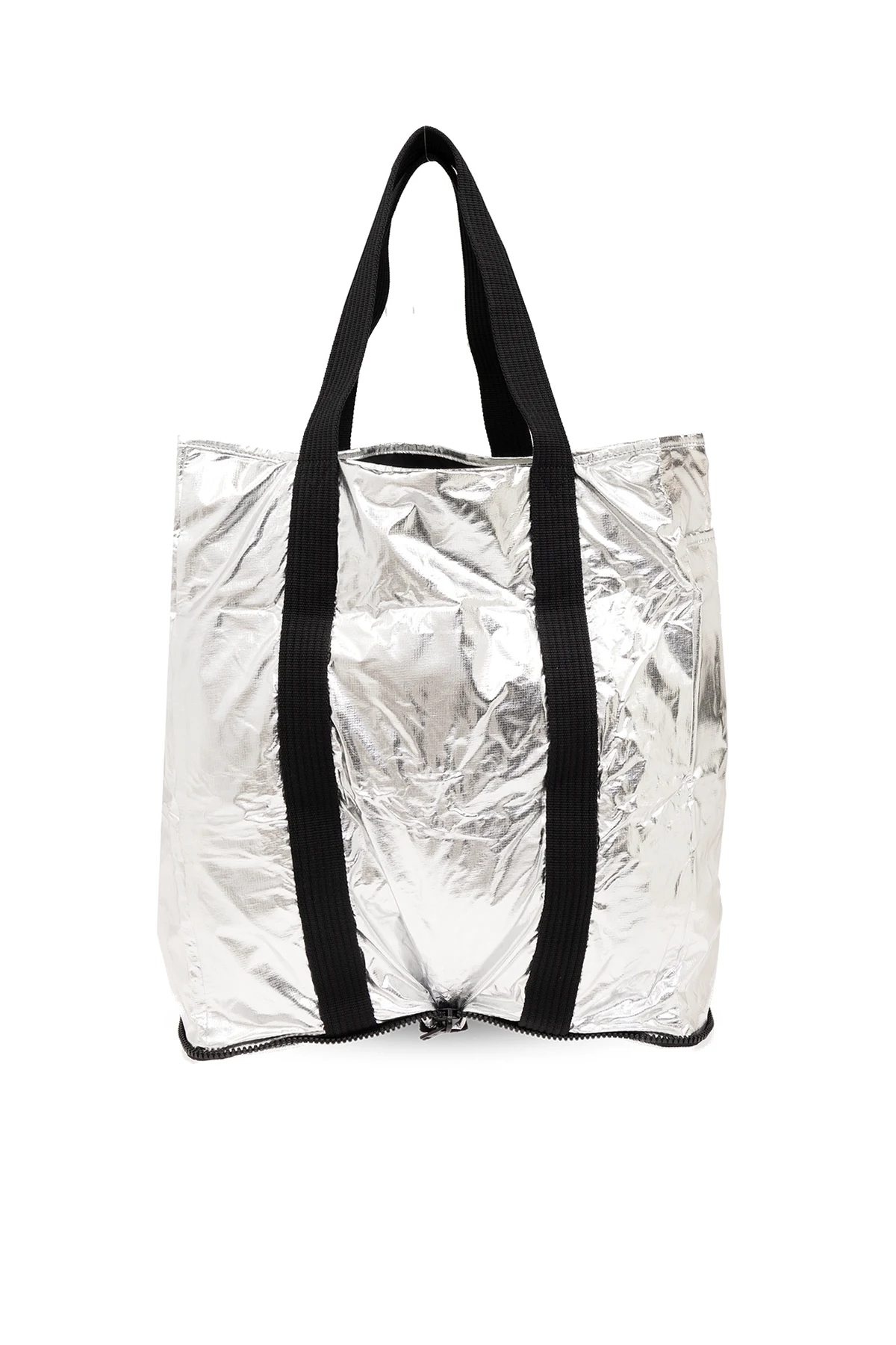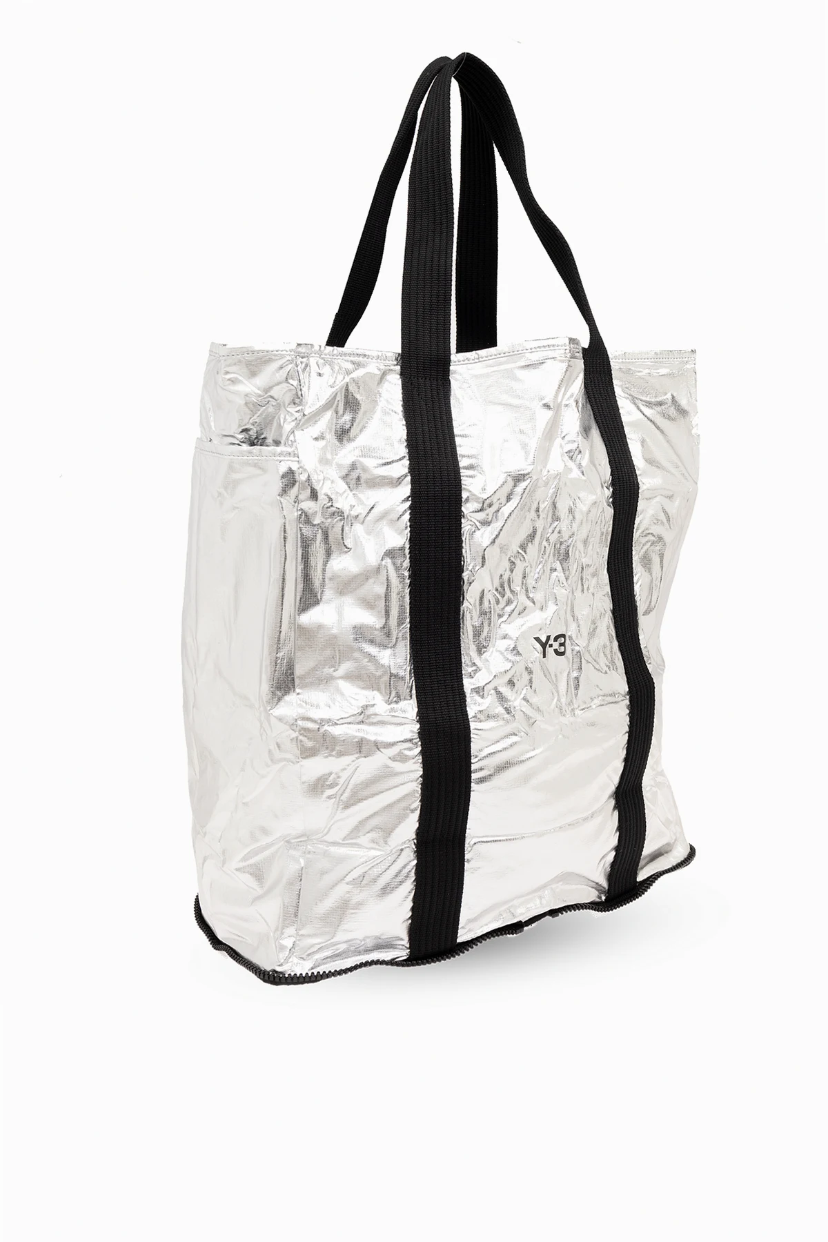 Torba typu ‘shopper’ w kolorze srebrnym i czarnym Y-3 Yohji Yamamoto. Wykonana z materiału. Zamykana na zamek. Dwie półokrągłe rączki. Wewnątrz komora i kieszeń zamykana na zamek. Z przodu nadrukowane czarne logo. Możliwość złożenia w małą torbę z półokrągłą rączką.