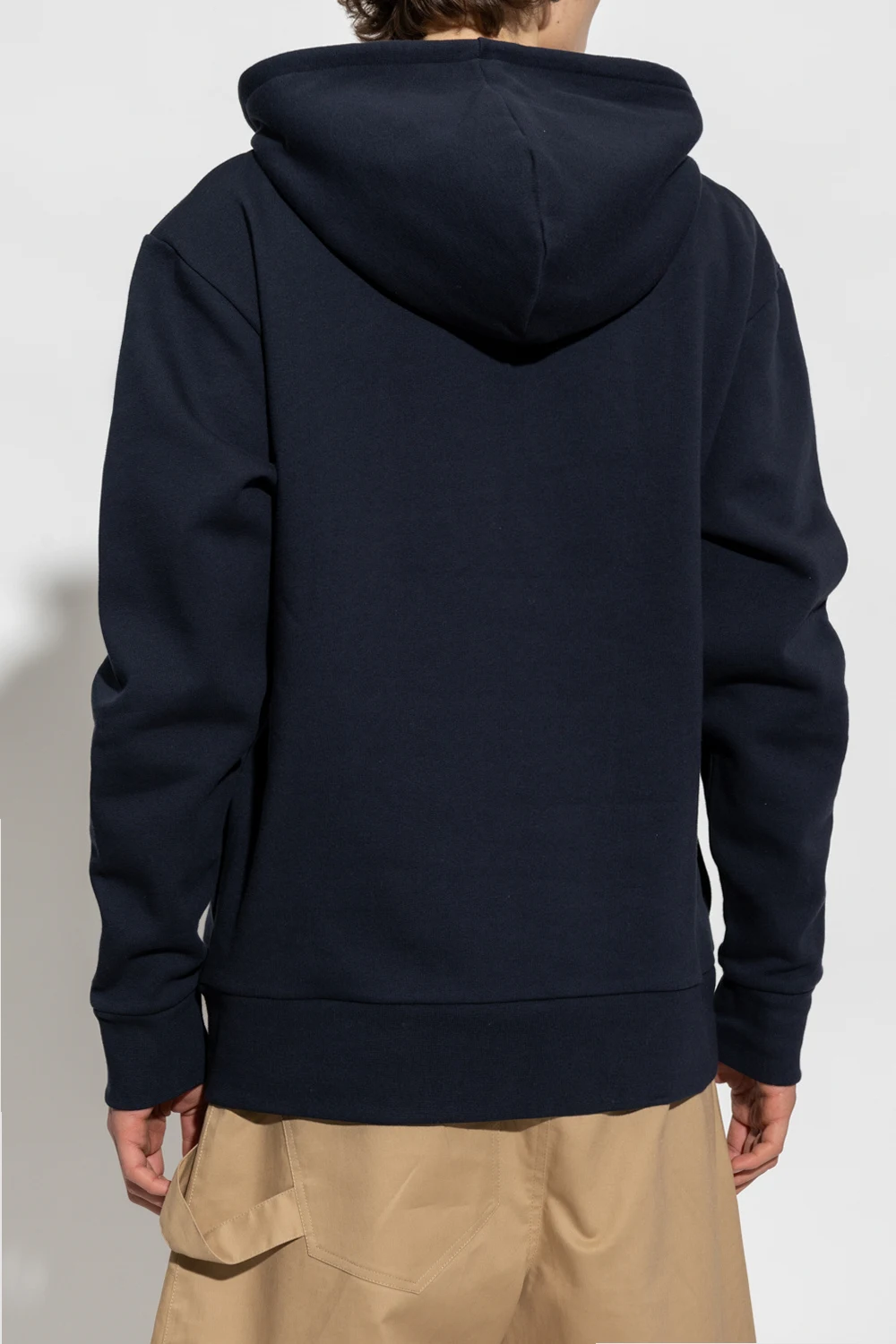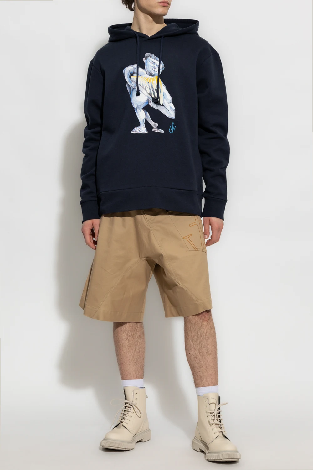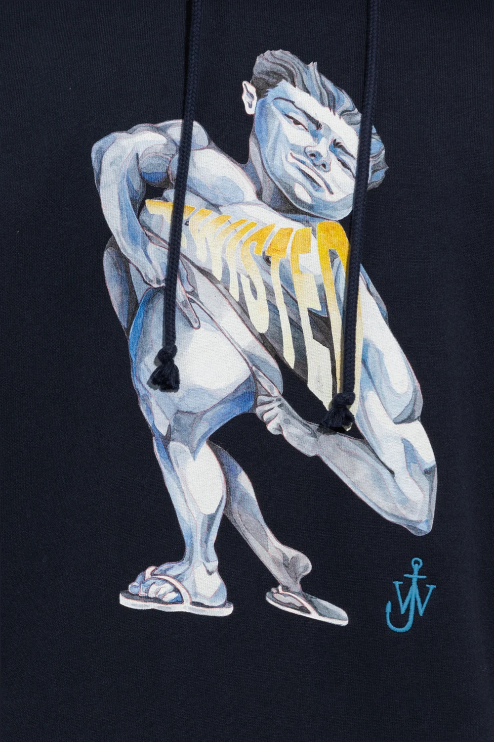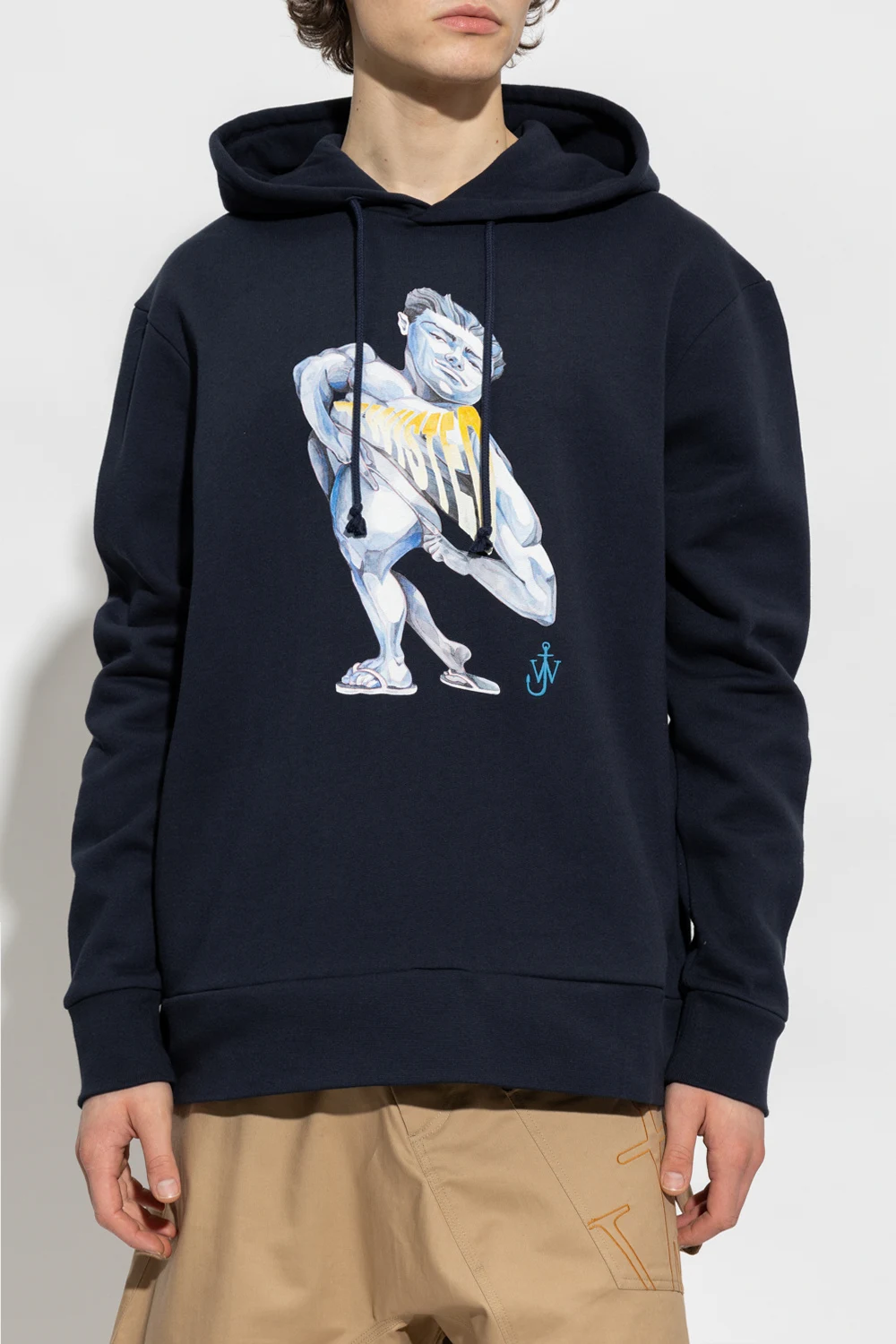 Granatowa bluza JW Anderson. Wykonana z bawełny. Kaptur ściągany trokami. Z przodu ozdobiona kolorowym nadrukiem i wyszytym logo. Dwie wsuwane kieszenie. Długie rękawy i dół zakończone ściągaczem.