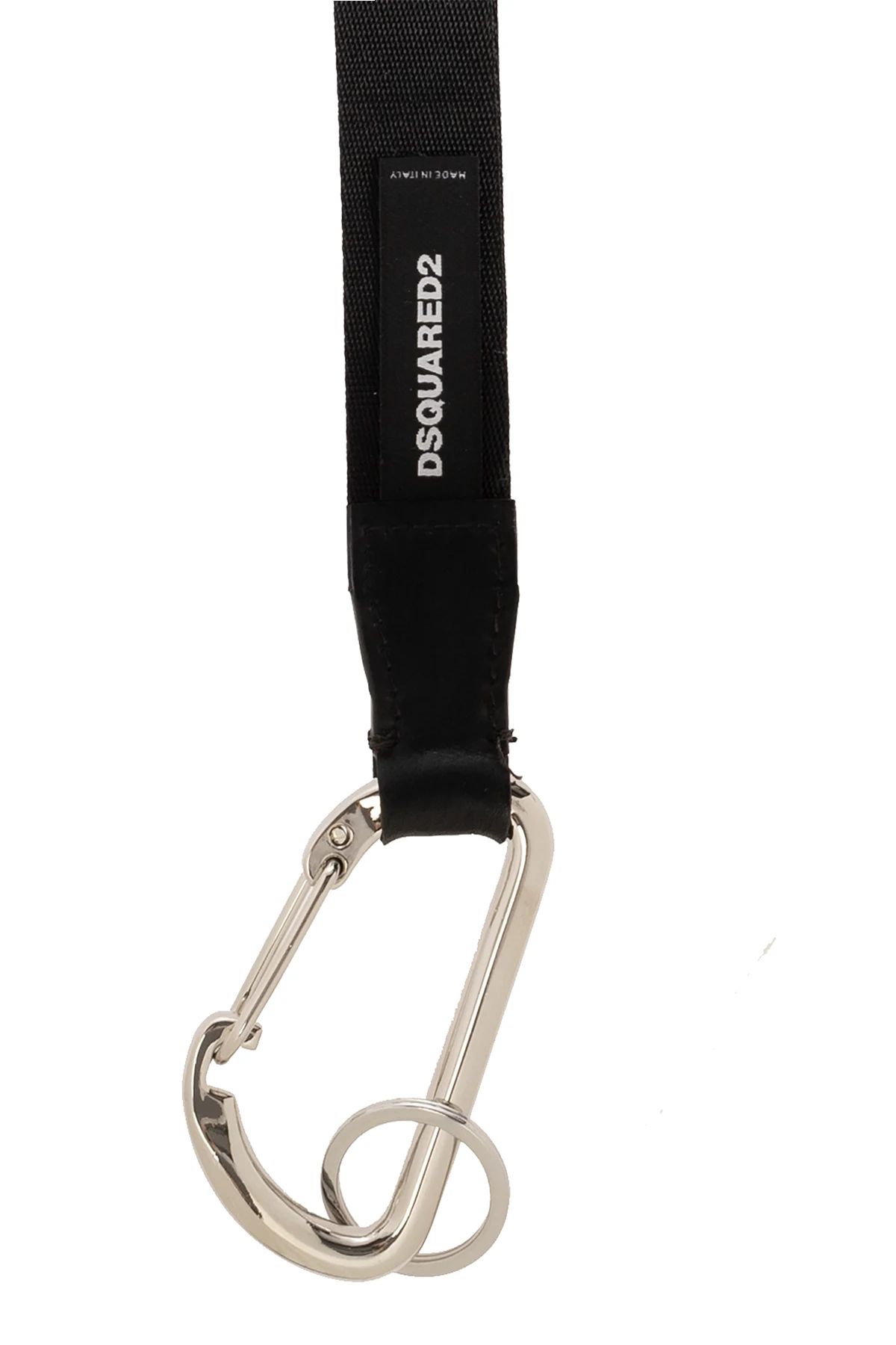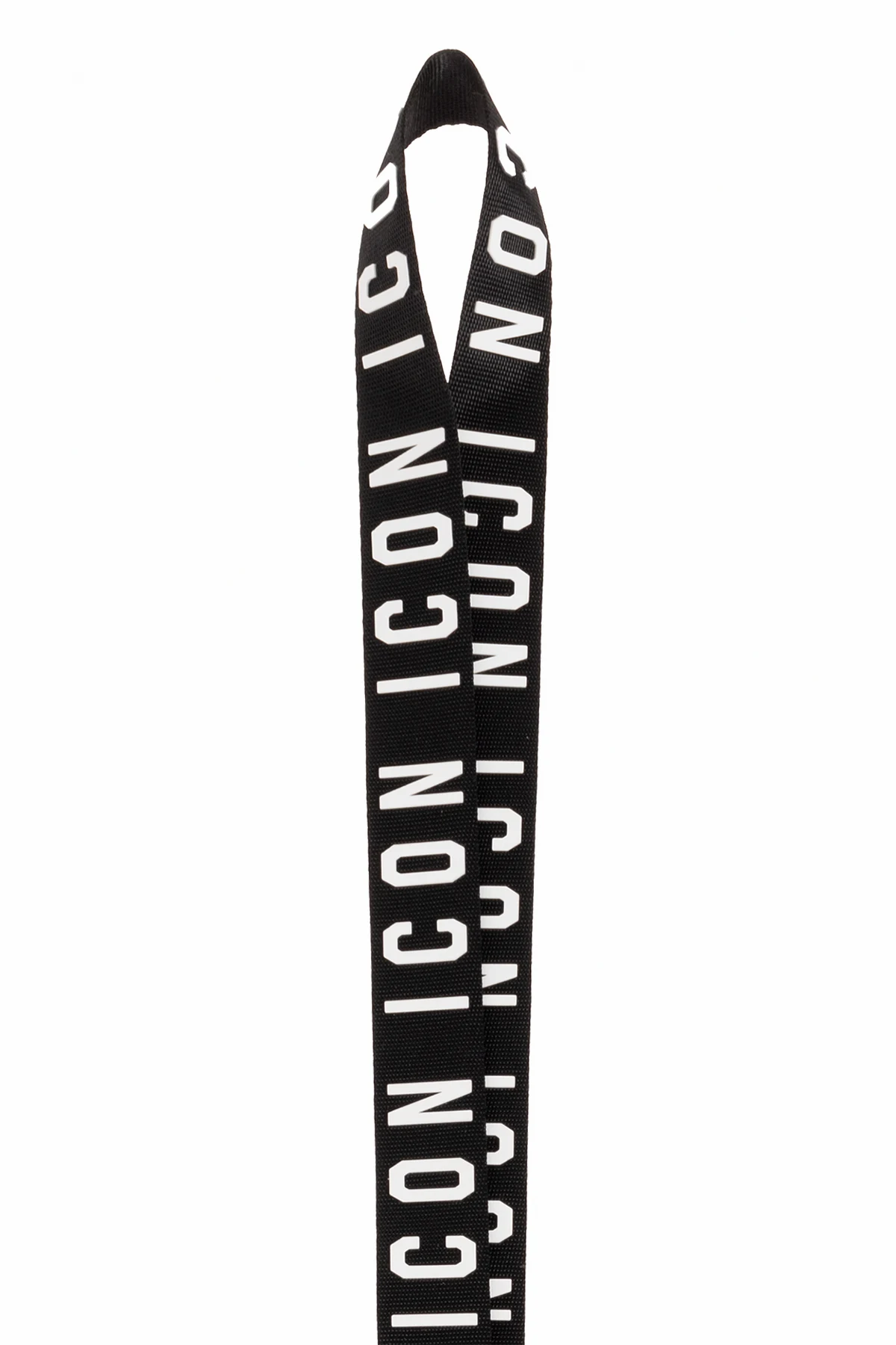 Czarna smycz Dsquared2. Ozdobiona nadrukowanym logo ‘Icon’ w kolorze białym. Dołączony karabińczyk oraz metalowy okrąg.