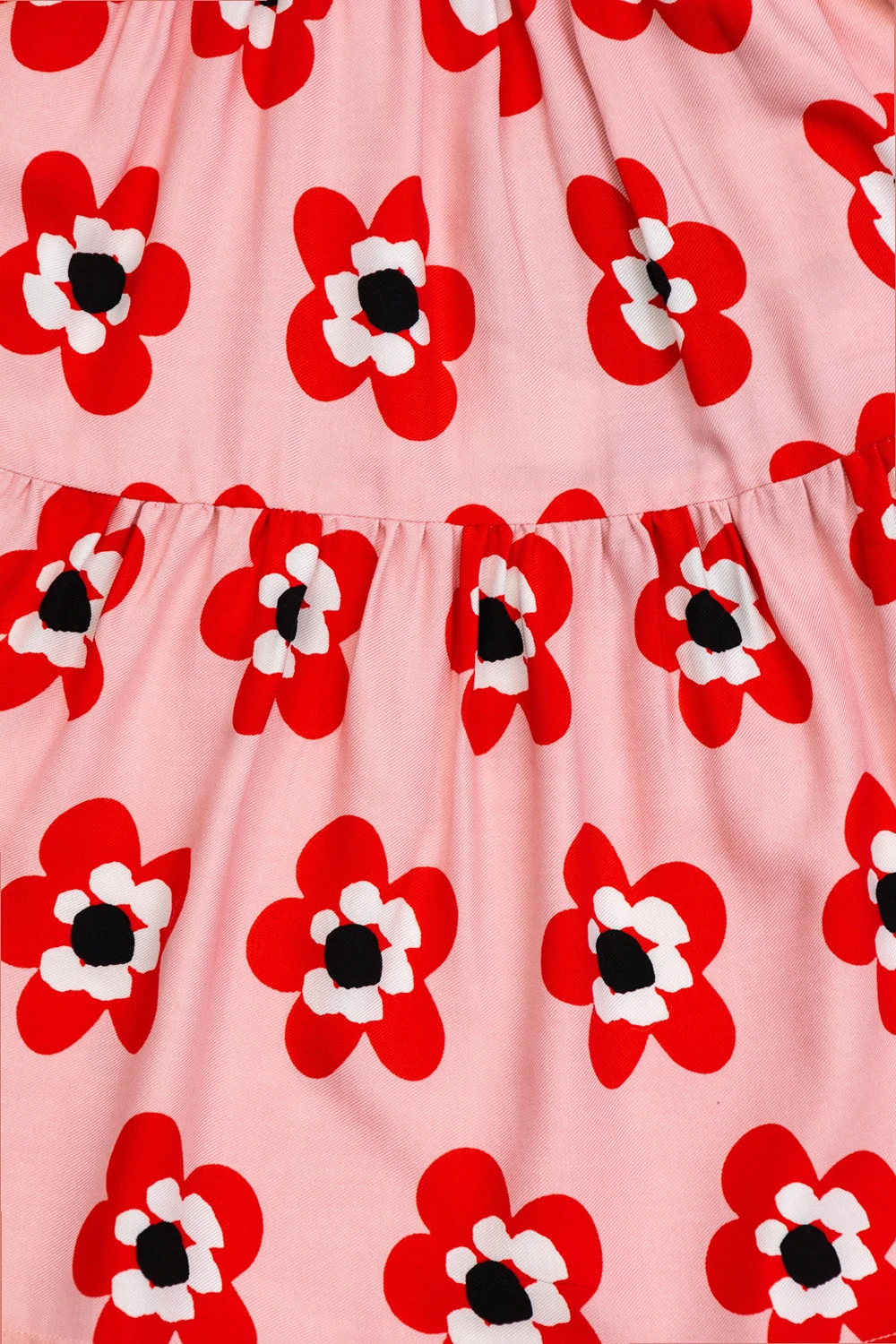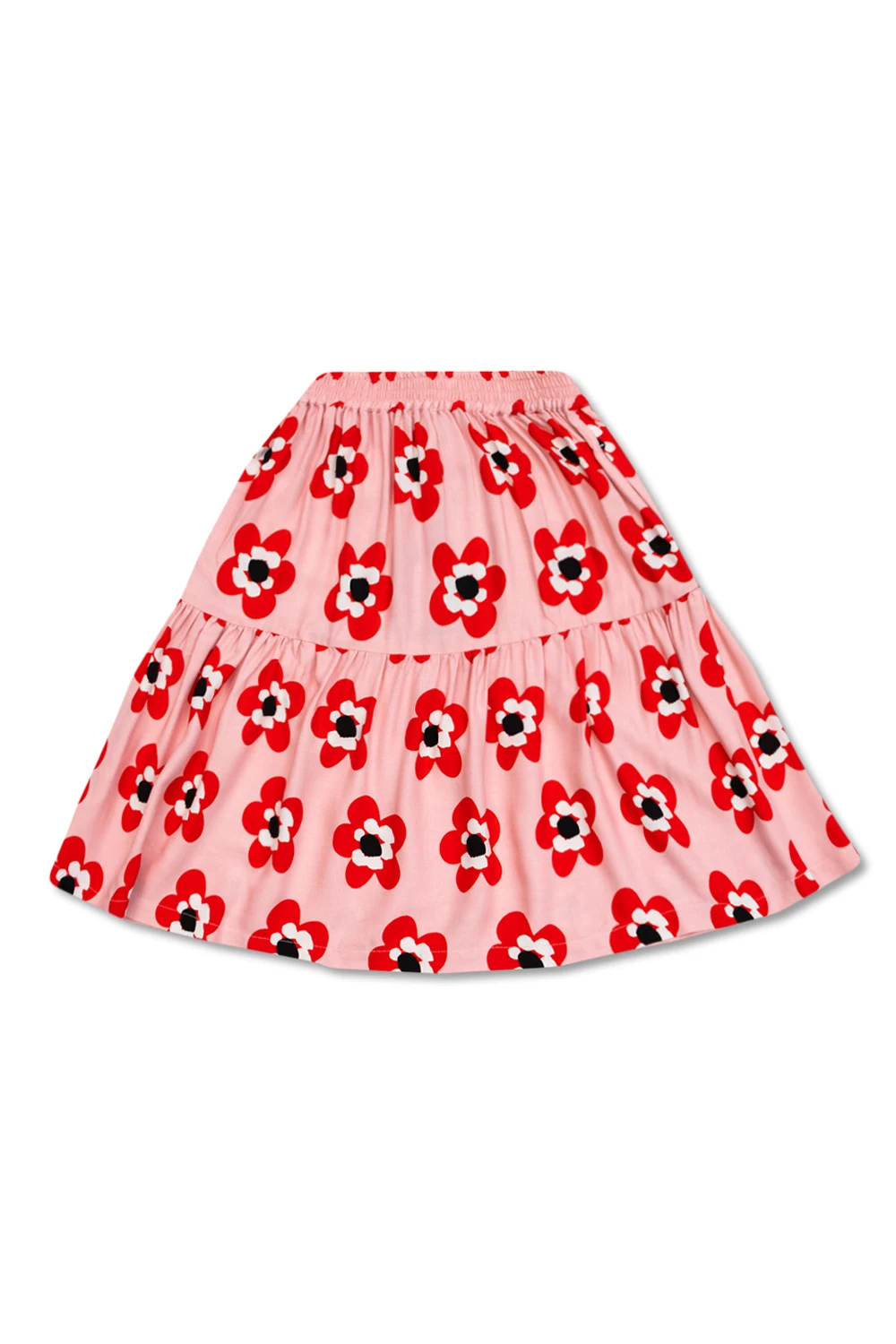 Jasnoróżowa, rozkloszowana spódnica Stella McCartney Kids. W pasie wszyta guma. Ozdobiona czerwono-czarno-białym nadrukiem z motywem kwiatowym. Po bokach kieszeń